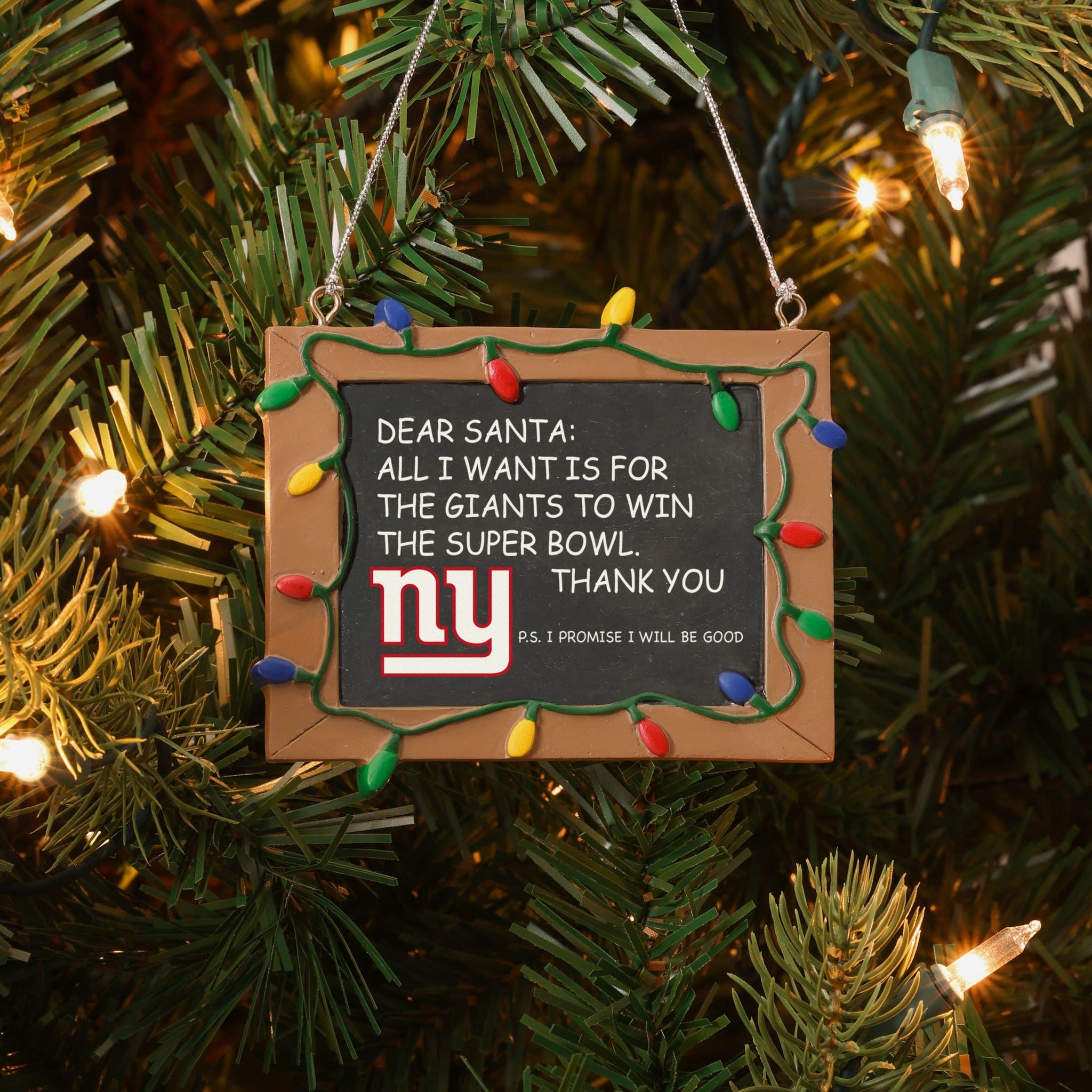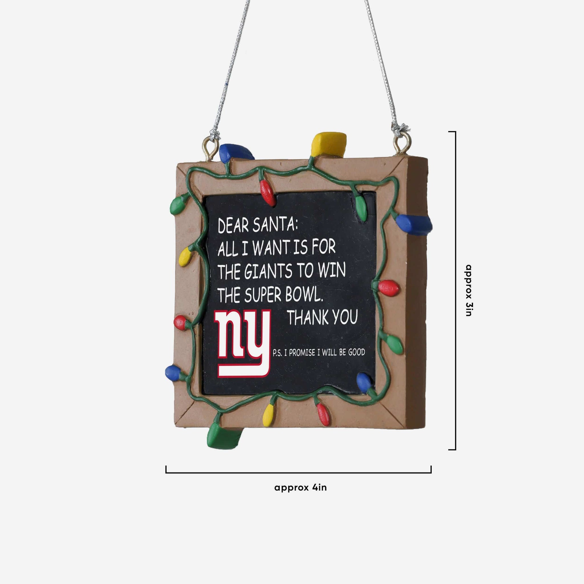 So, you made your list and sent it to jolly ol' Fanta Claus, asking him for a championship. But sometimes letters can get lost in the mail. Just in case, put this New York Giants Resin Chalkboard Sign Ornament on your tree to let him know how good you've been this year, and that all you want for the holidays is a trophy.