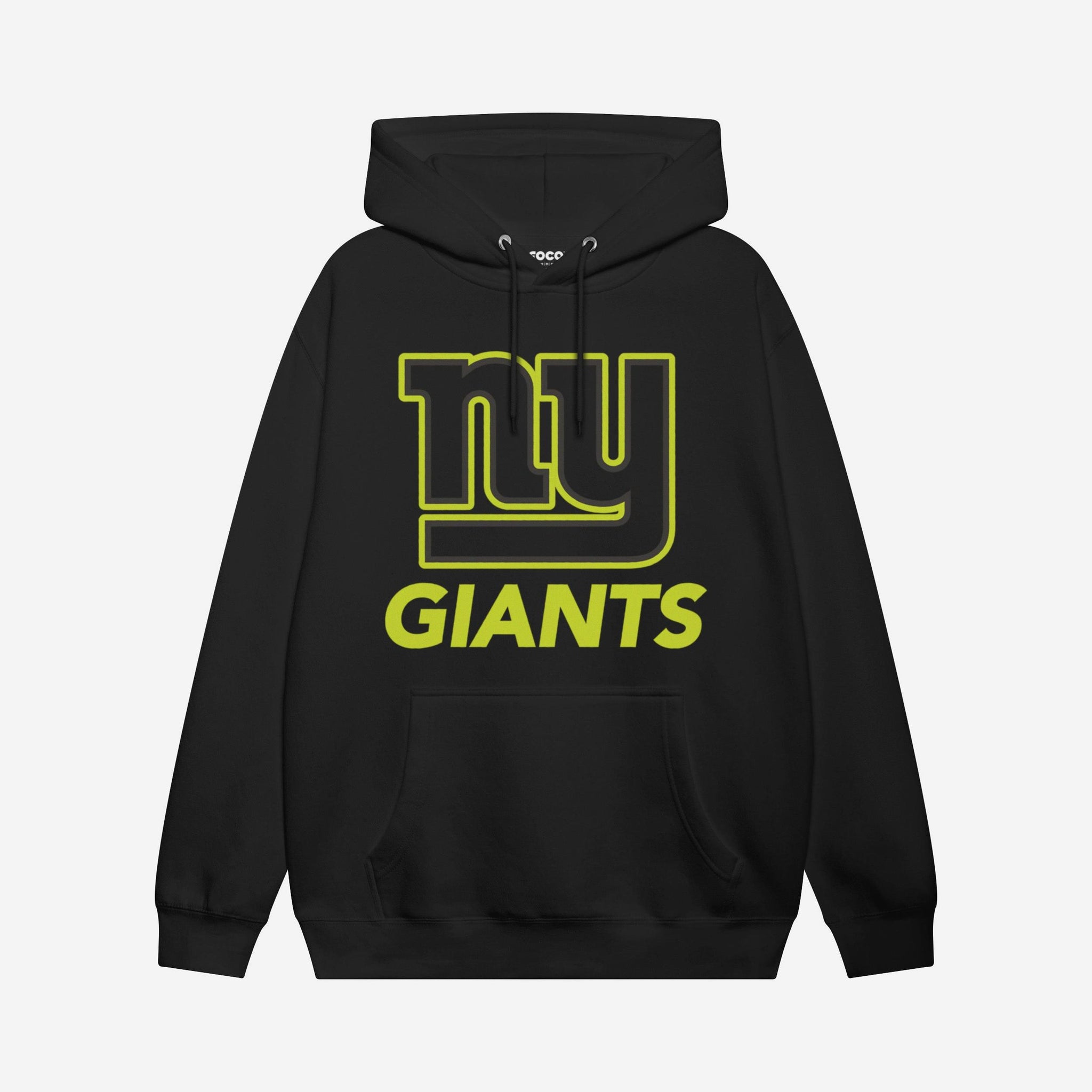 - Team logo display with highlight outline: The front of this apparel features a black New York Giants team logo display outlined in neon, and a neon team name display