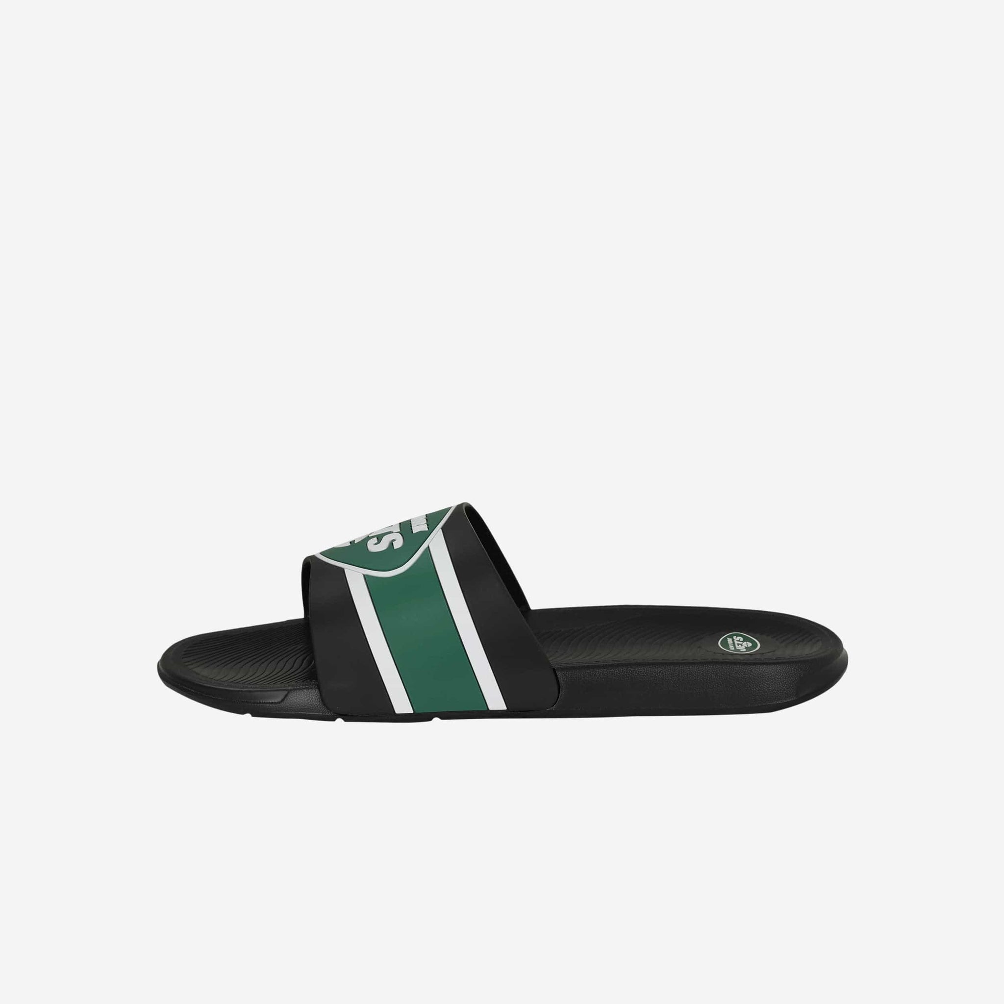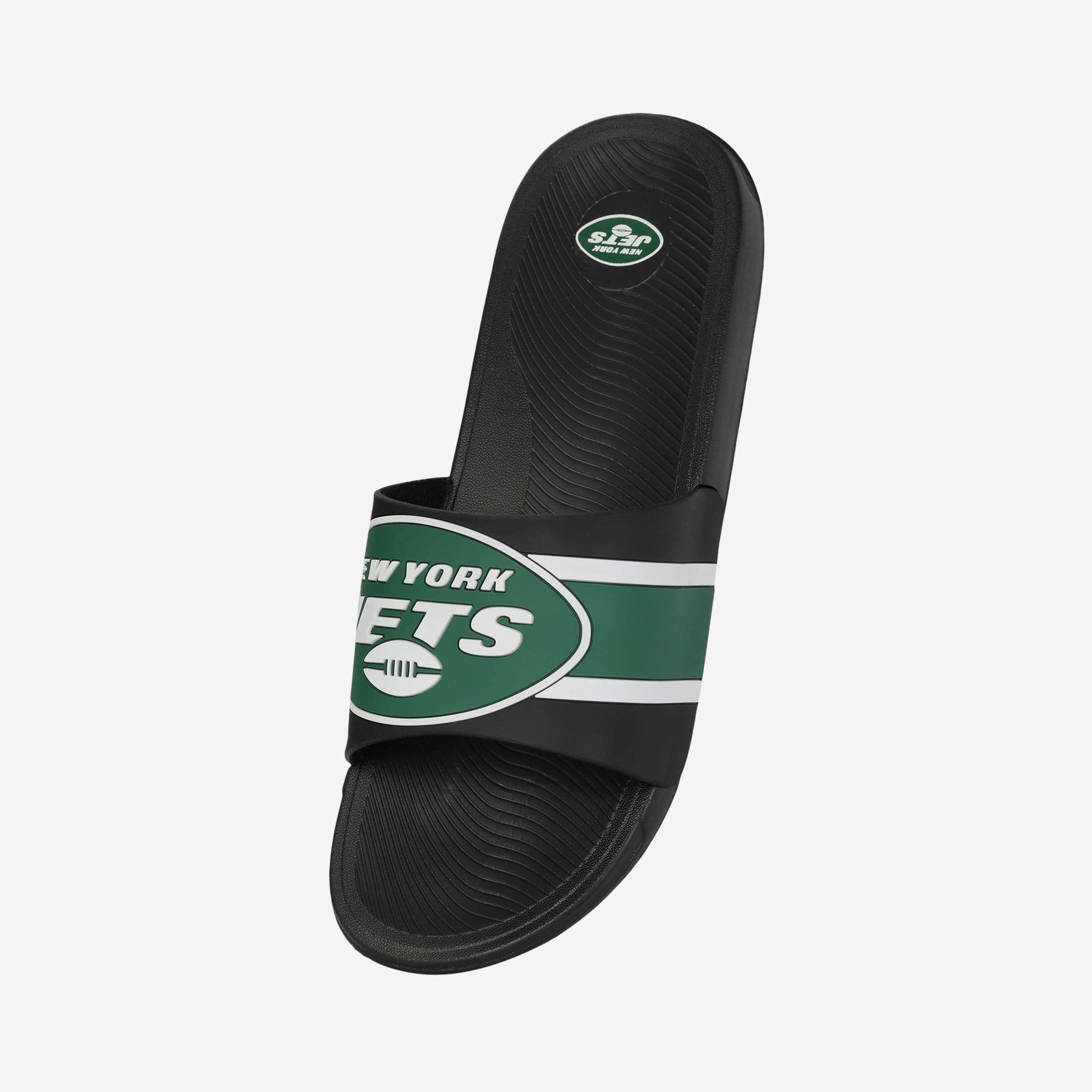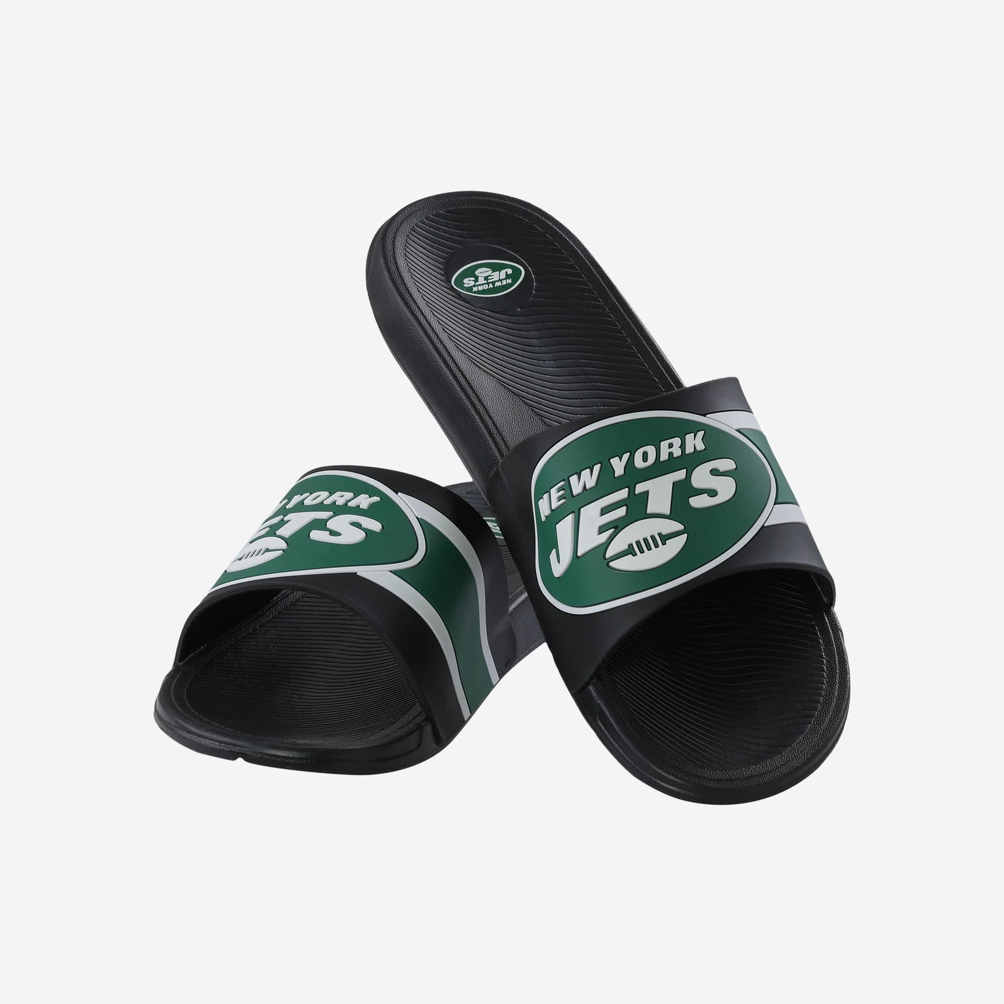 These New York Jets Striped Big Logo Raised Slides give a whole new meaning to the idea of putting some pep in your step.