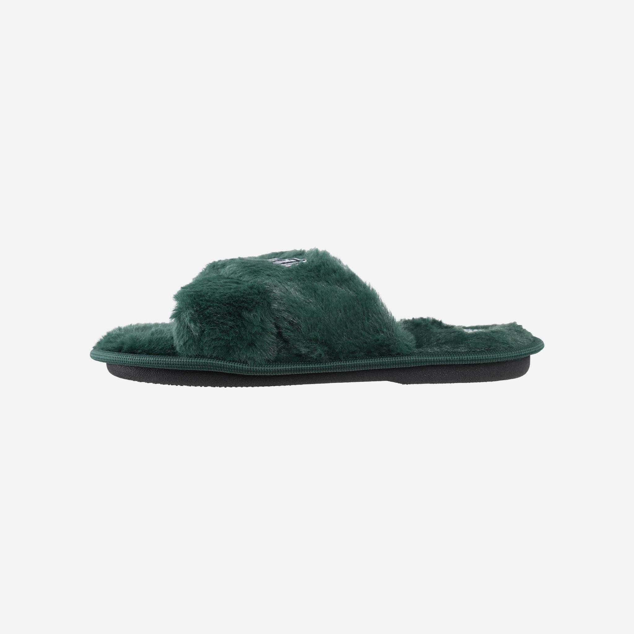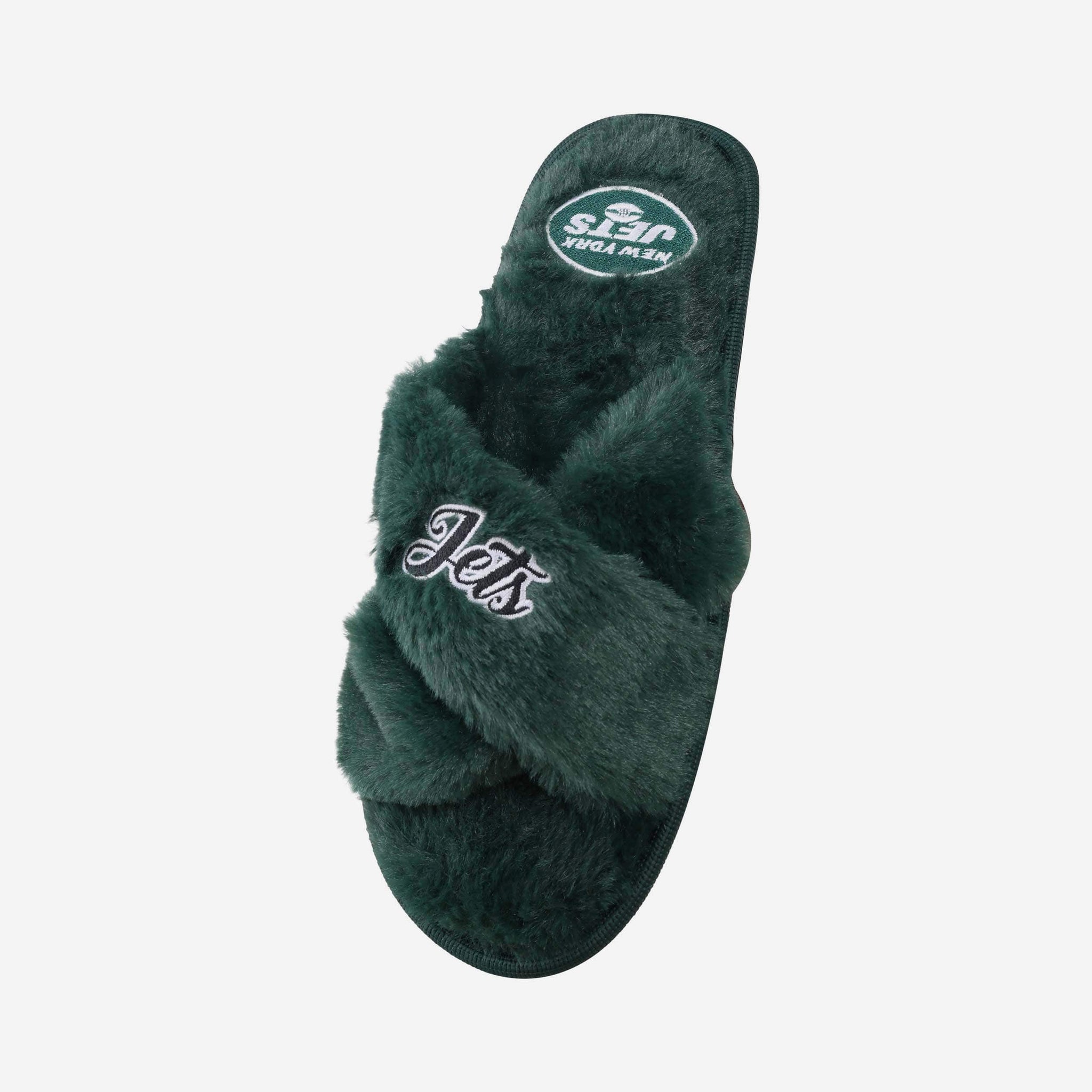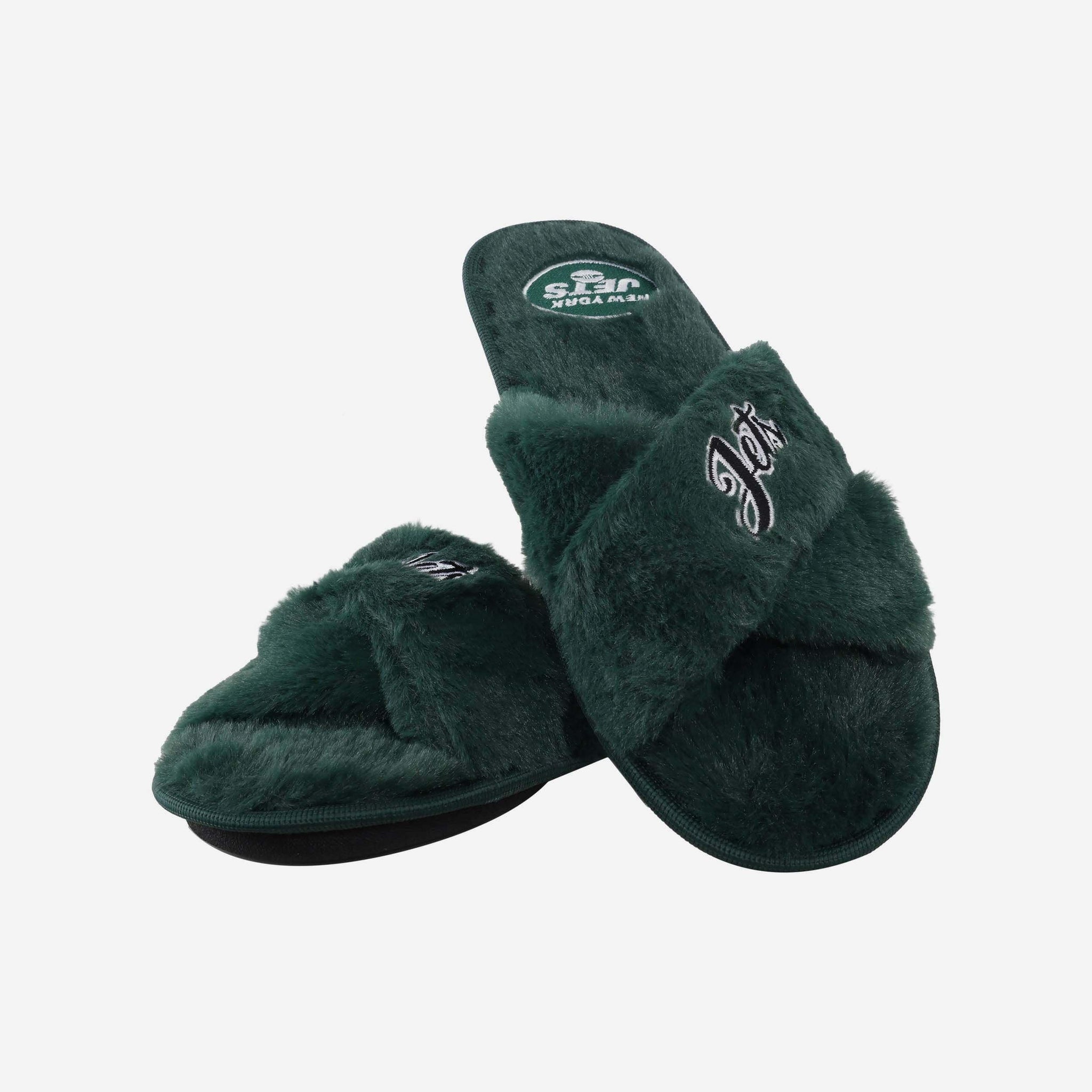 Slip in to something fuzzy, festive, and oh, so fan-tastic on your relaxing days at home. These New York Jets Women's Script Wordmark Fur Cross Slides are the best way to rep the team while you kick back and watch the game on TV.