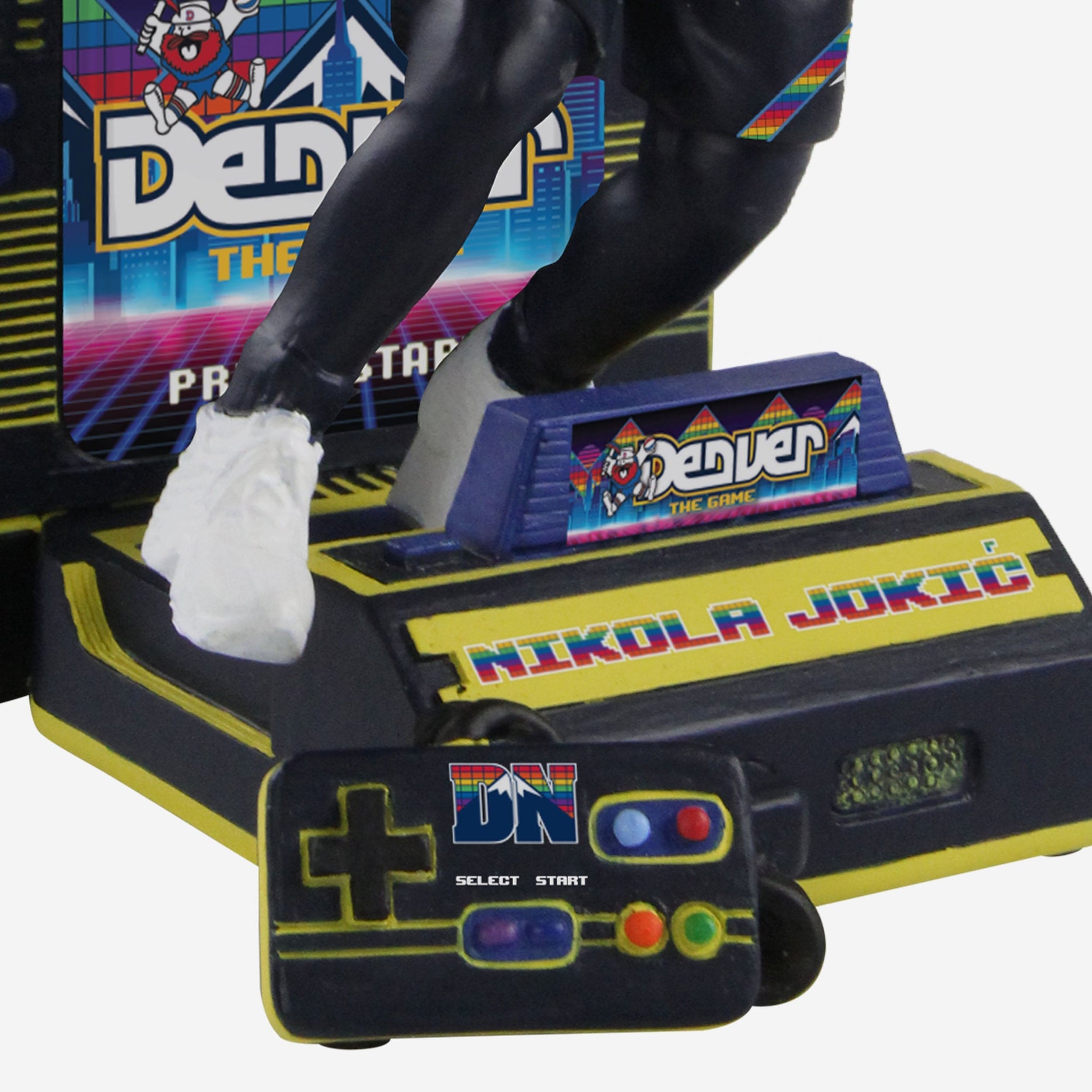 - Retro video game screen backdrop with thematic DENVER: THE GAME, PRESS START text displays so you can get in the game