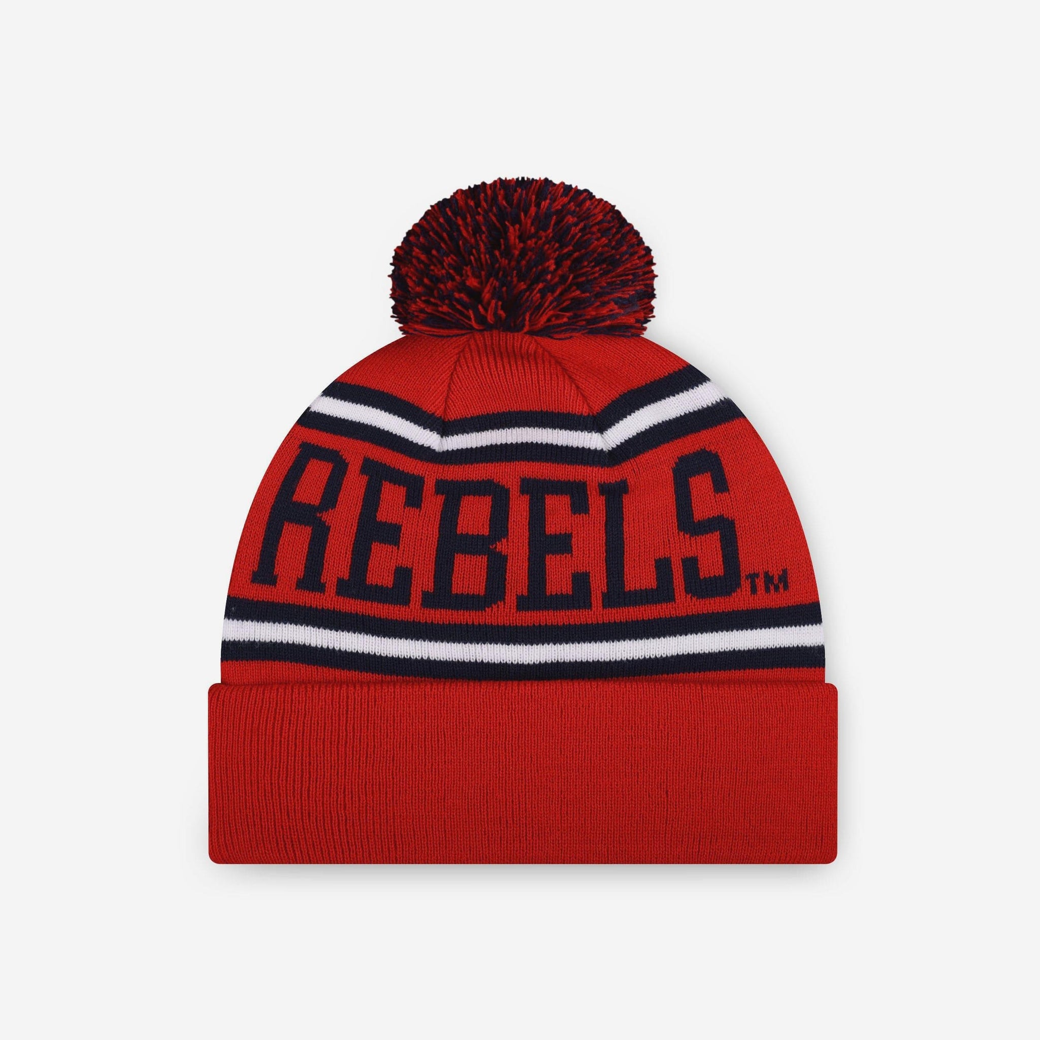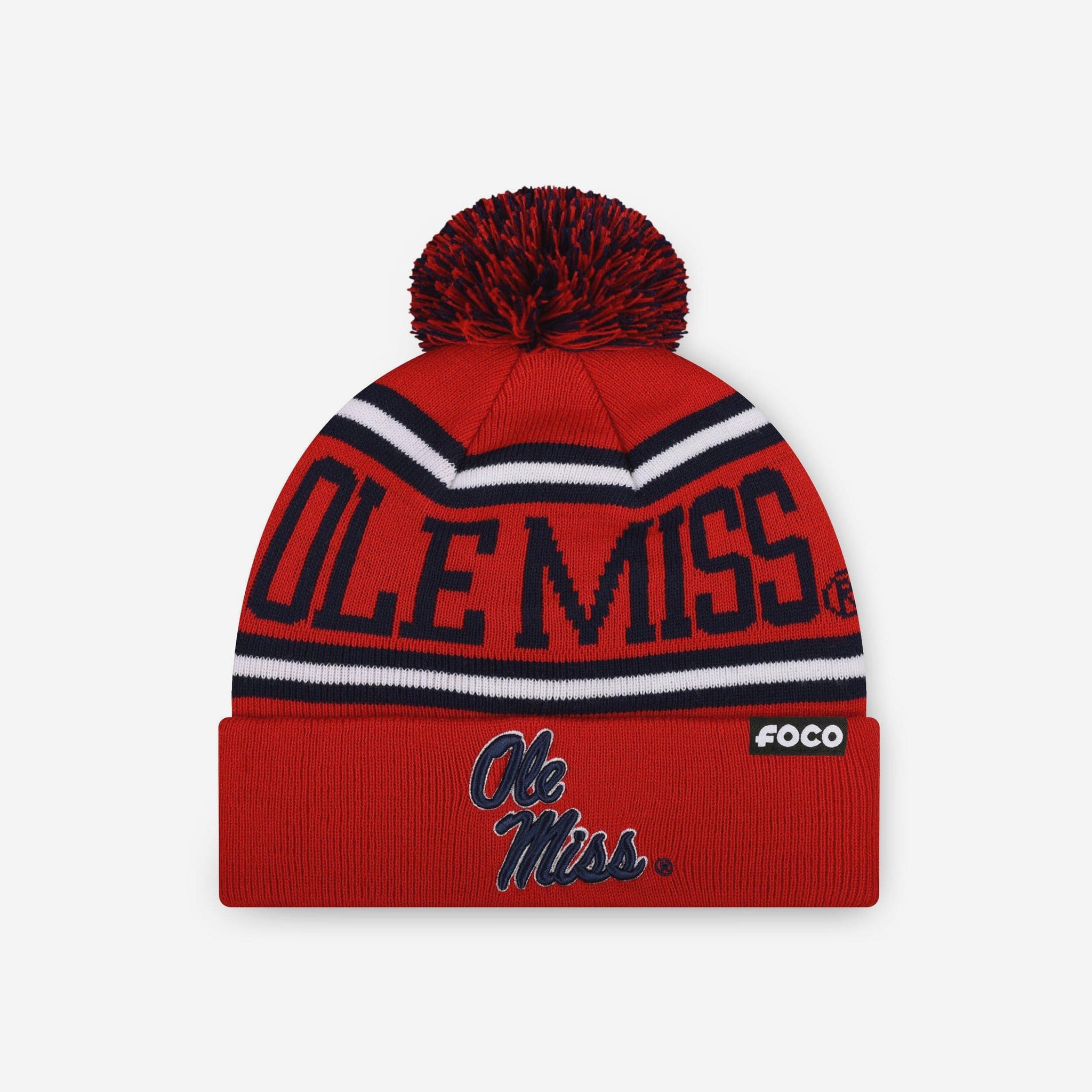 Heads up! This Ole Miss Rebels Primary Logo Stripe Pom Beanie is so cozy, you might not want to take it off at all this winter.