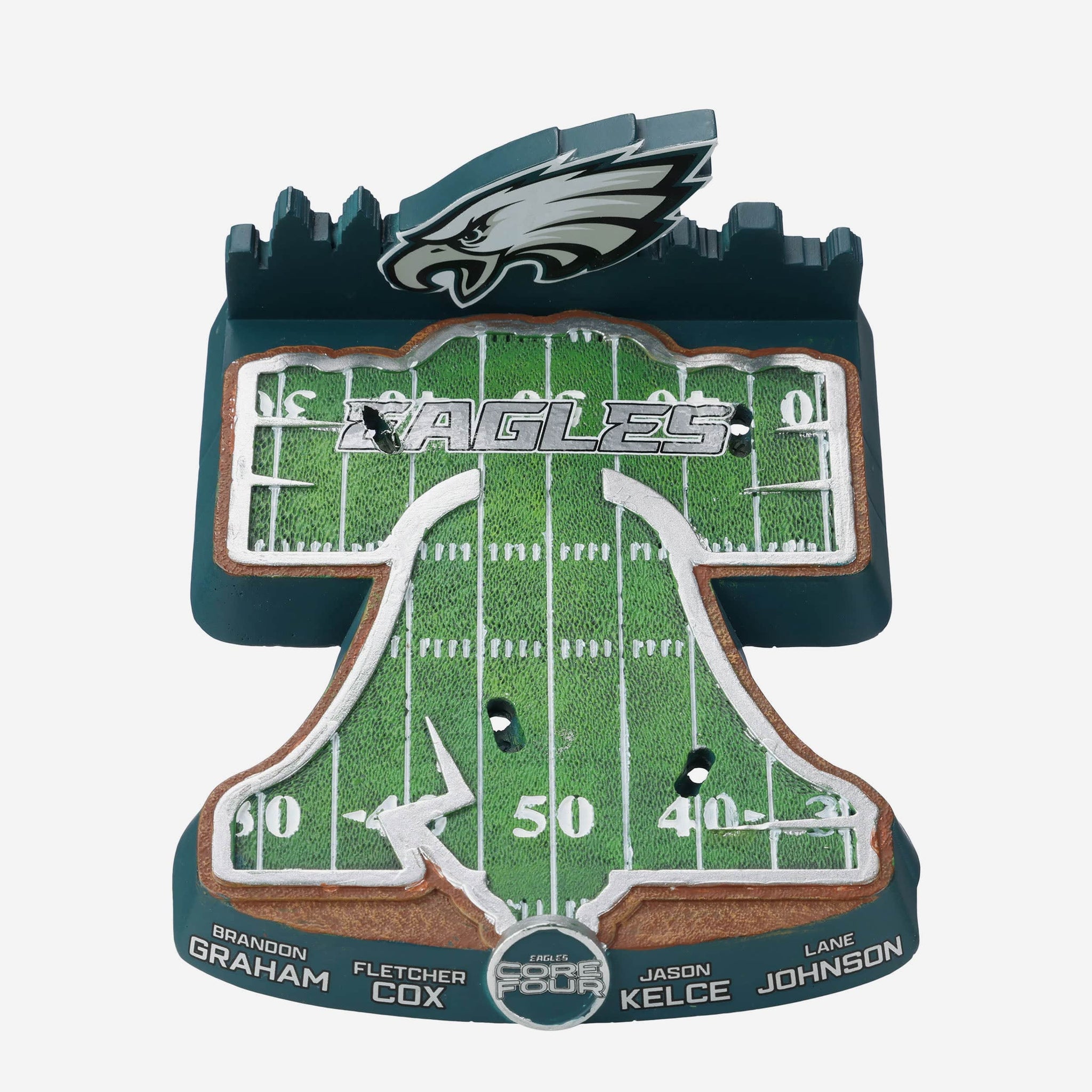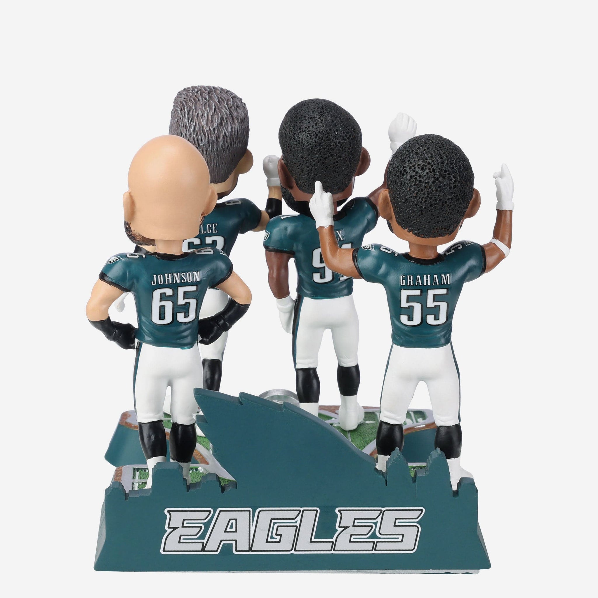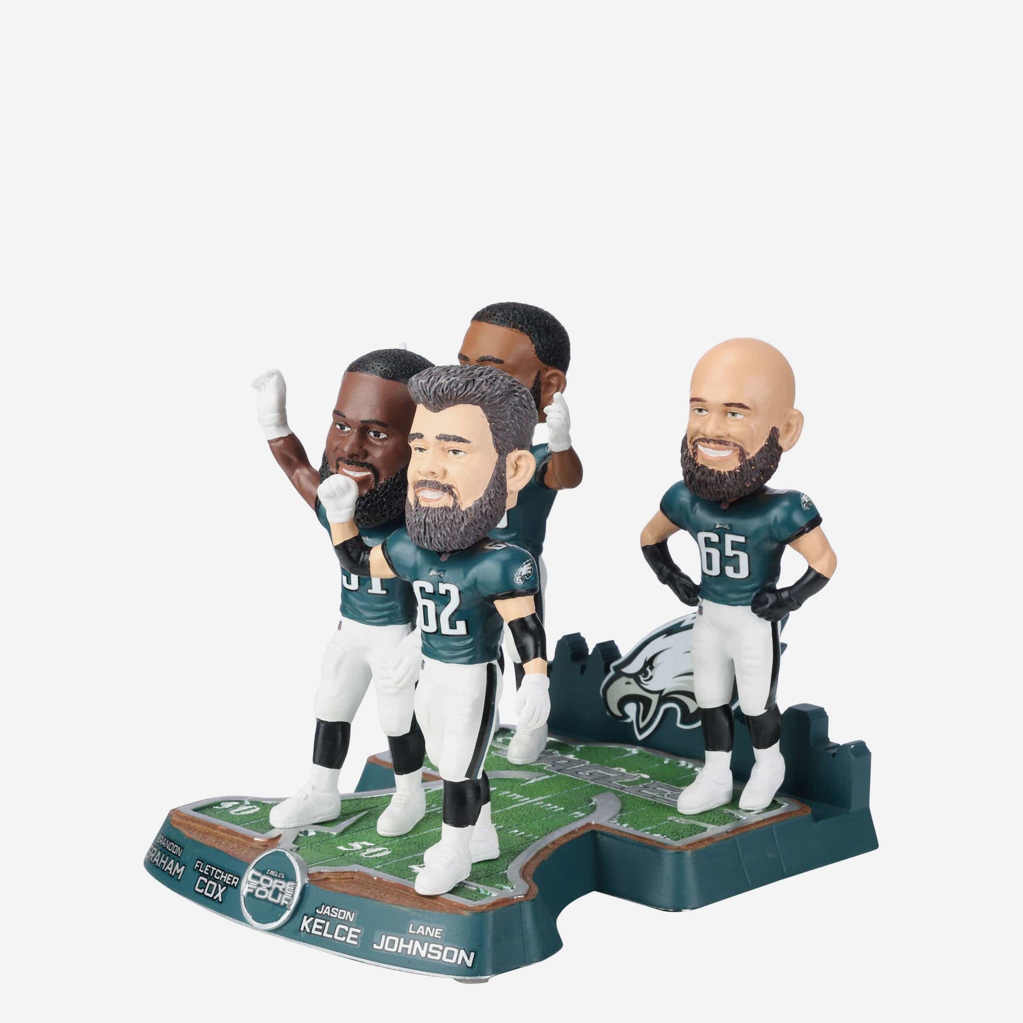 Lane Johnson. Jason Kelce. Fletcher Cox. Brandon Graham. This fearsome foursome of birds has you covered on both sides of the ball. Remind everyone that football games are won in the trenches with this Philadelphia Eagles Core Mini Bobblehead Scene.