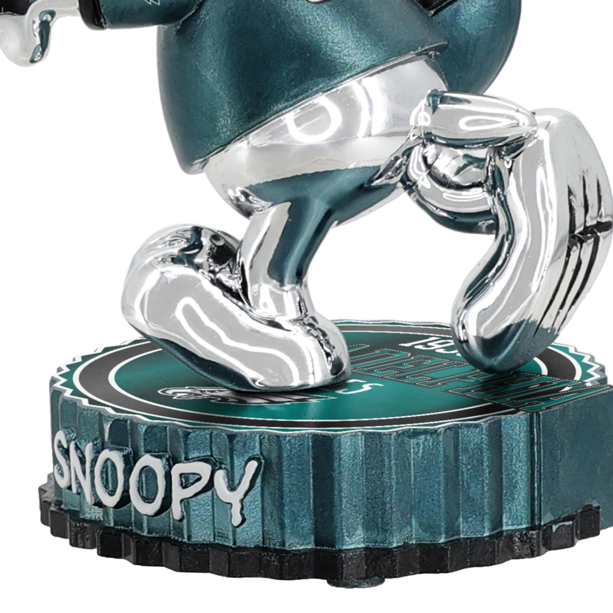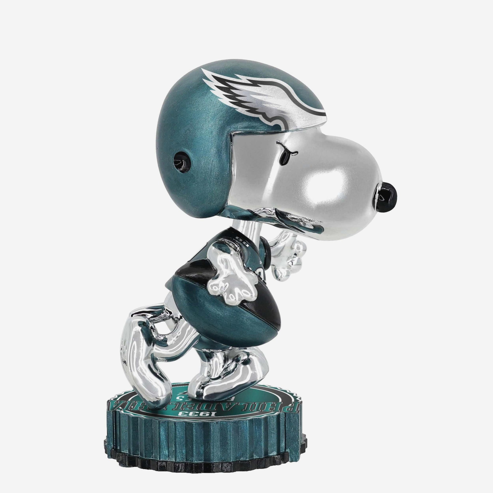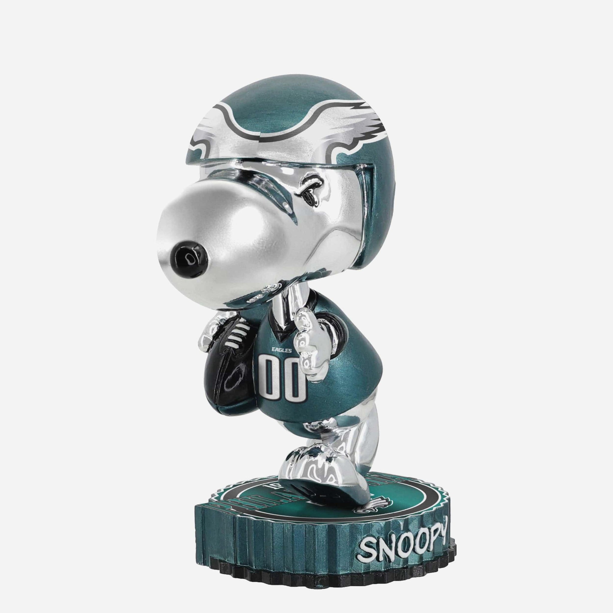 Snoopy is suiting up for game day in dazzling style! Add a little gridiron glow to your collection with this Philadelphia Eagles Snoopy Peanuts Electroplated Medium Bighead Bobblehead.