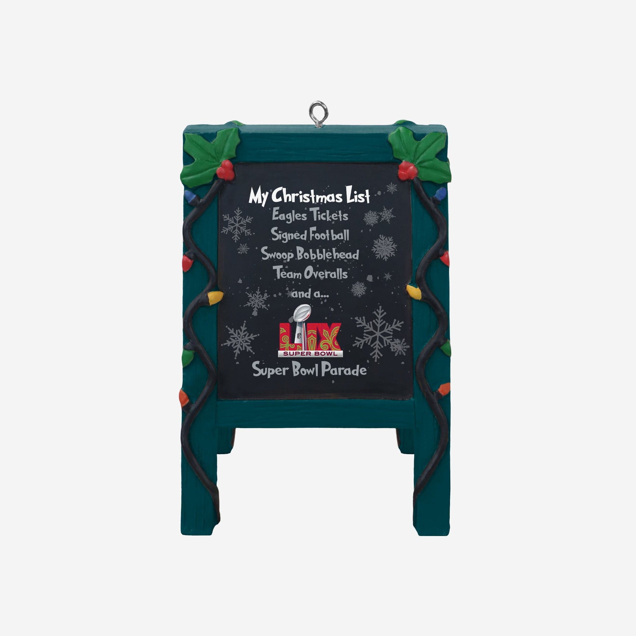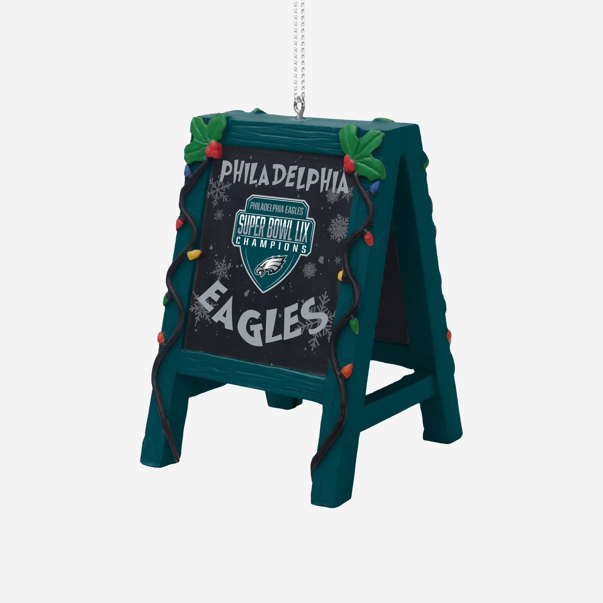 Tis the season to celebrate a Super Bowl championship (it's the season that never ends). Deck the halls with some championship greatness by hanging up this Philadelphia Eagles Super Bowl LIX Champions Chalkboard Easel Ornament.