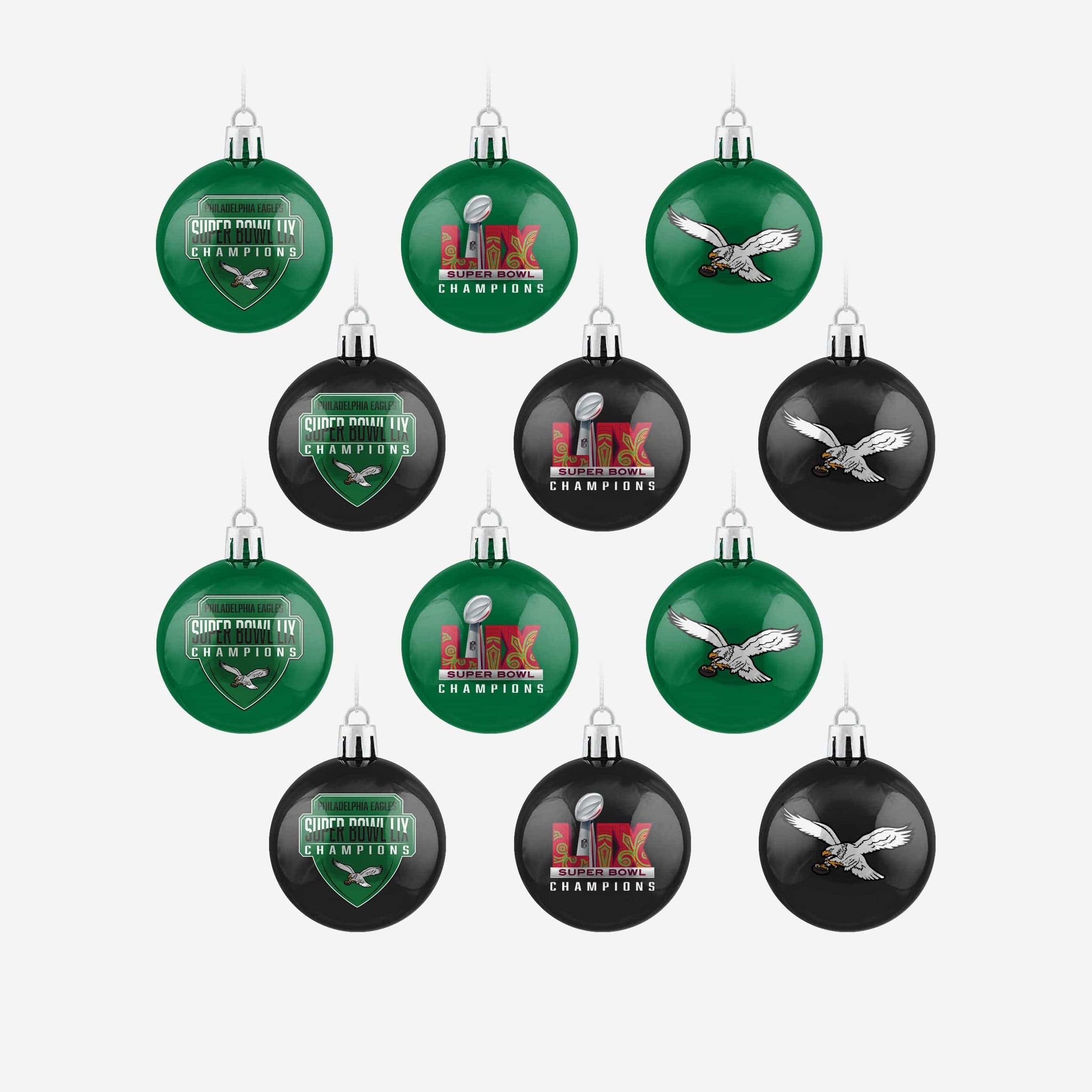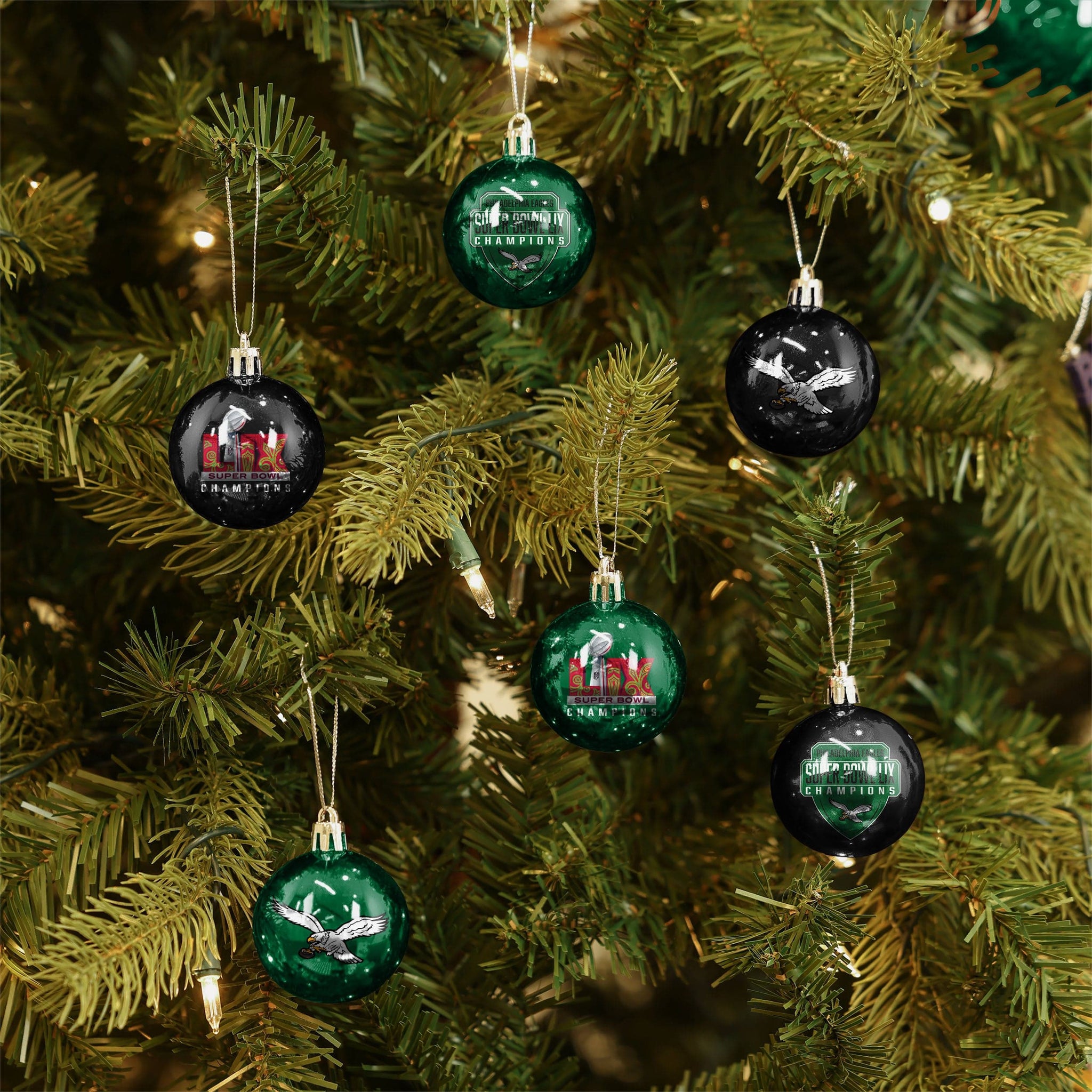 Your tree. Your team. And a holiday full of fandom! You’ll be ready to deck the halls with gridiron glory with the Philadelphia Eagles Super Bowl LIX Champions Kelly Green 12 Pack Plastic Ball Ornament Set.