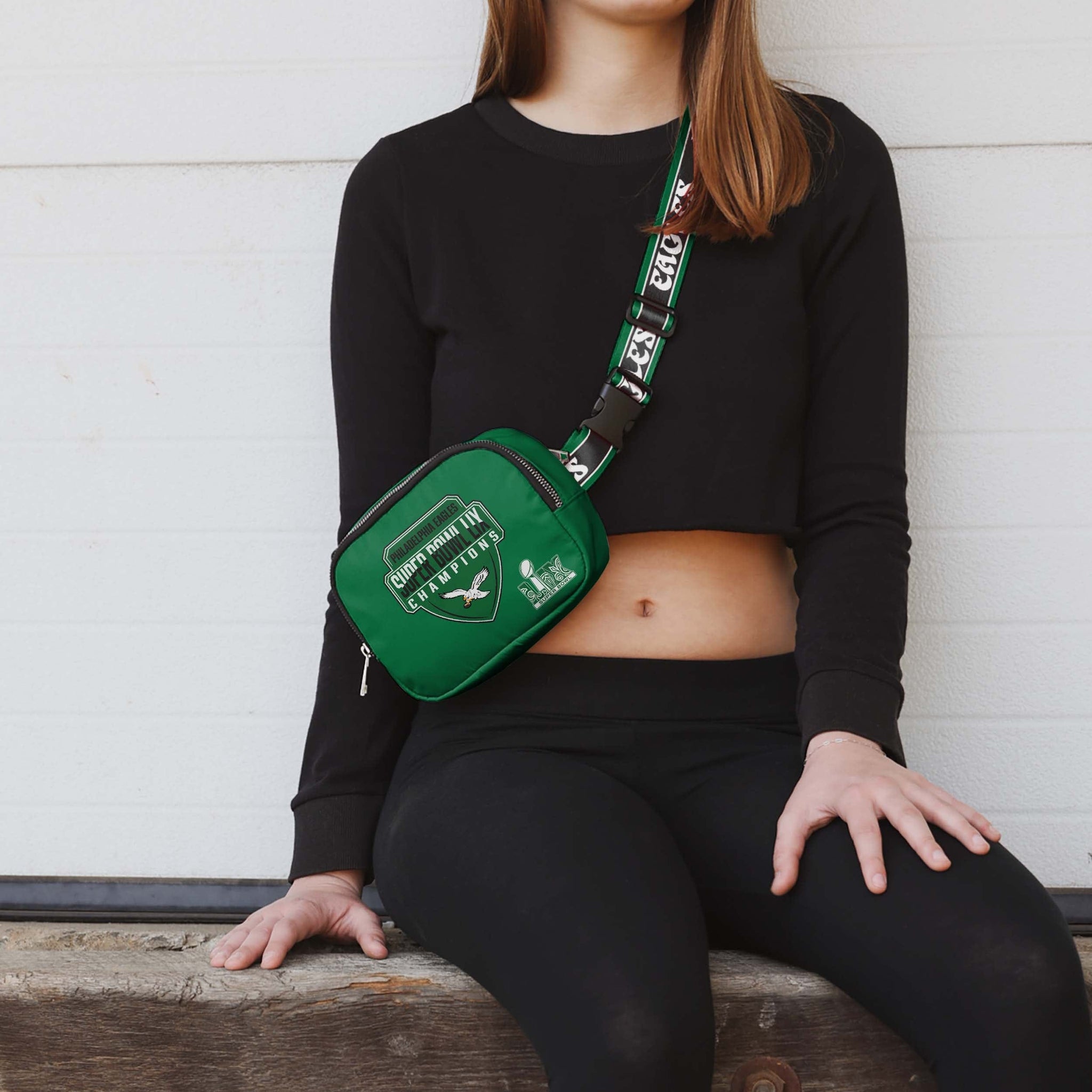 Keys. Wallet. Super Bowl title. Carry it all in style every time you rep the champs on the go with the Philadelphia Eagles Super Bowl LIX Champions Kelly Green Team Wordmark Crossbody Belt Bag.