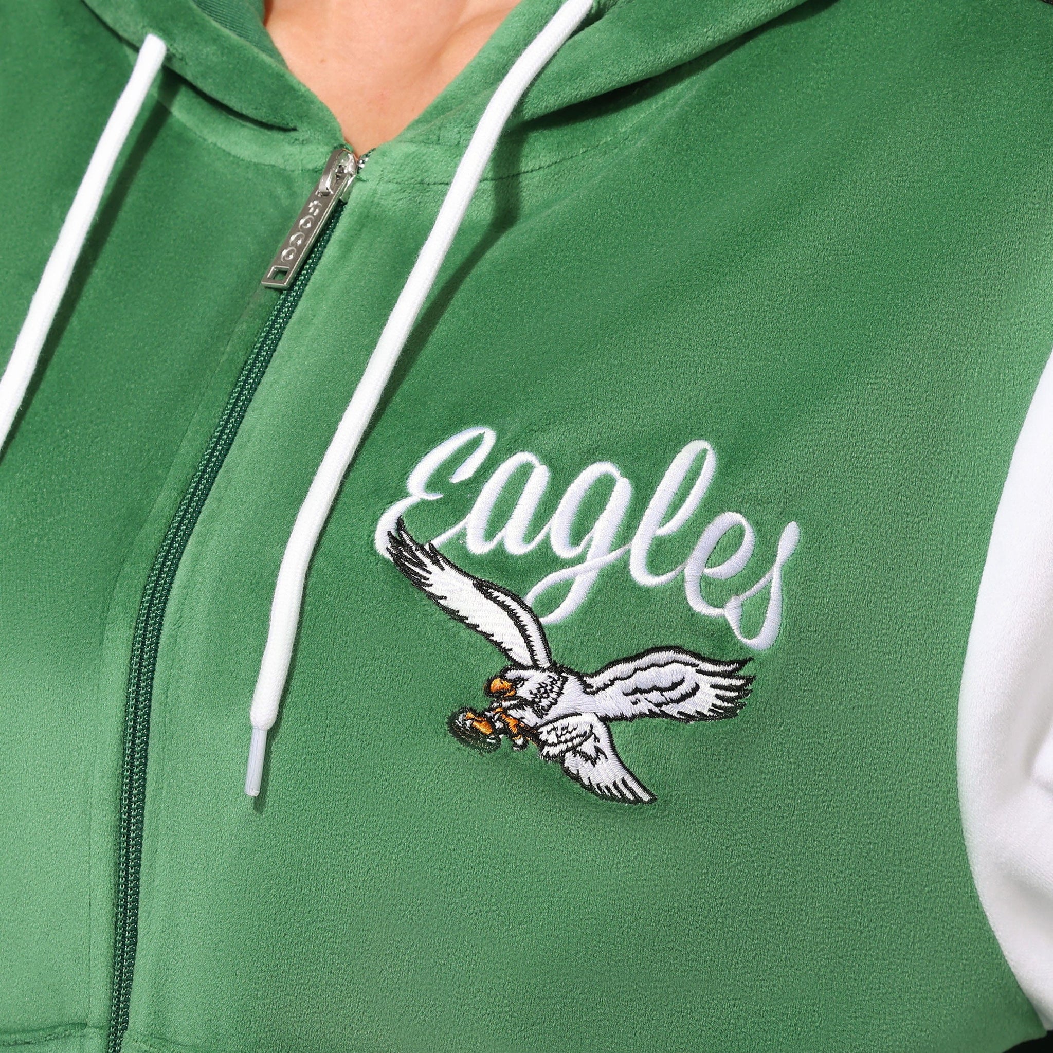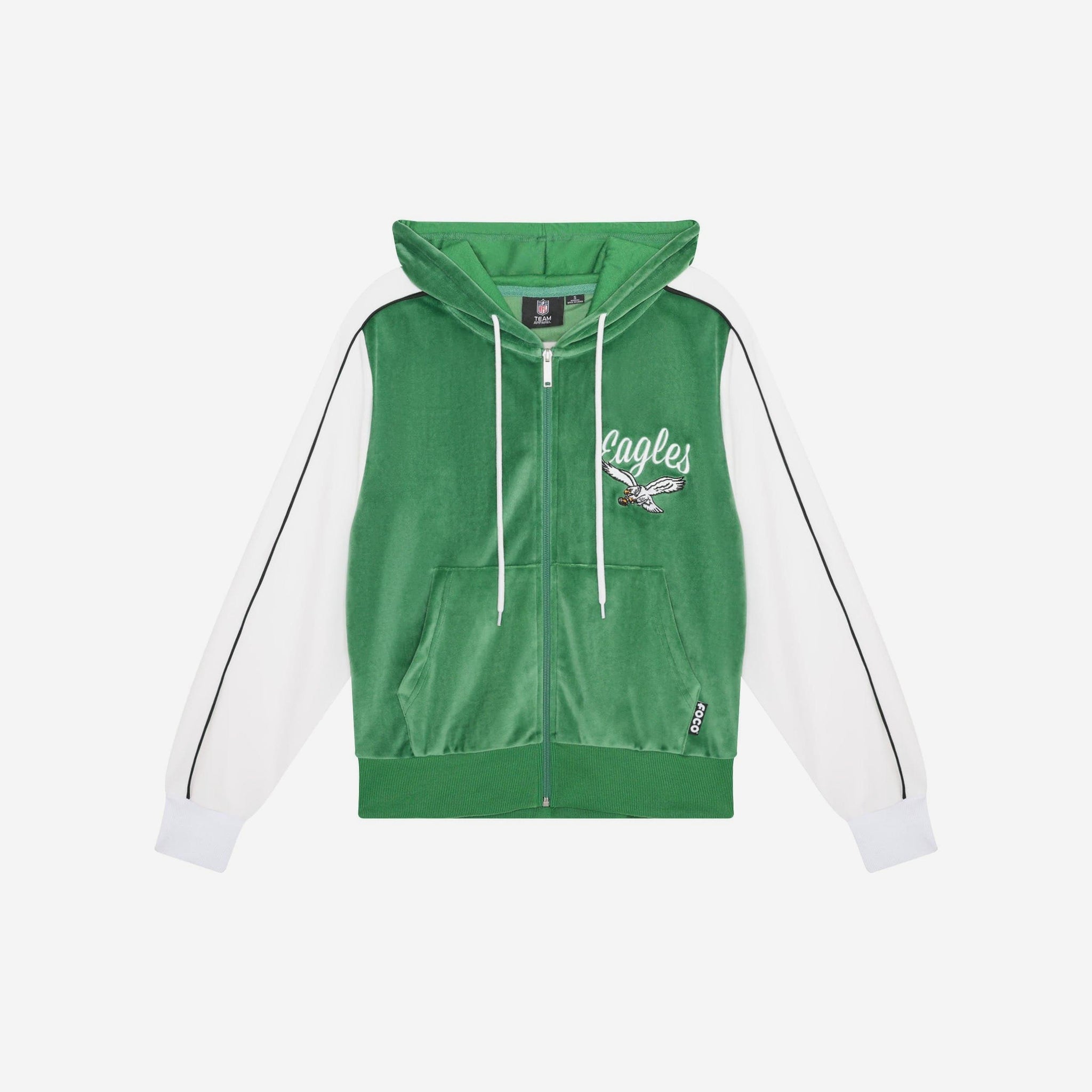 Soft, stylish, and straight-up iconic. Elevate your fan fit with this Philadelphia Eagles Womens Kelly Green Two Tone Velour Zip Up Top! Featuring a sleek two-tone design, ultra-soft velour fabric, and a full front zipper, this top brings comfort, warmth, and team pride together in one stylish package.