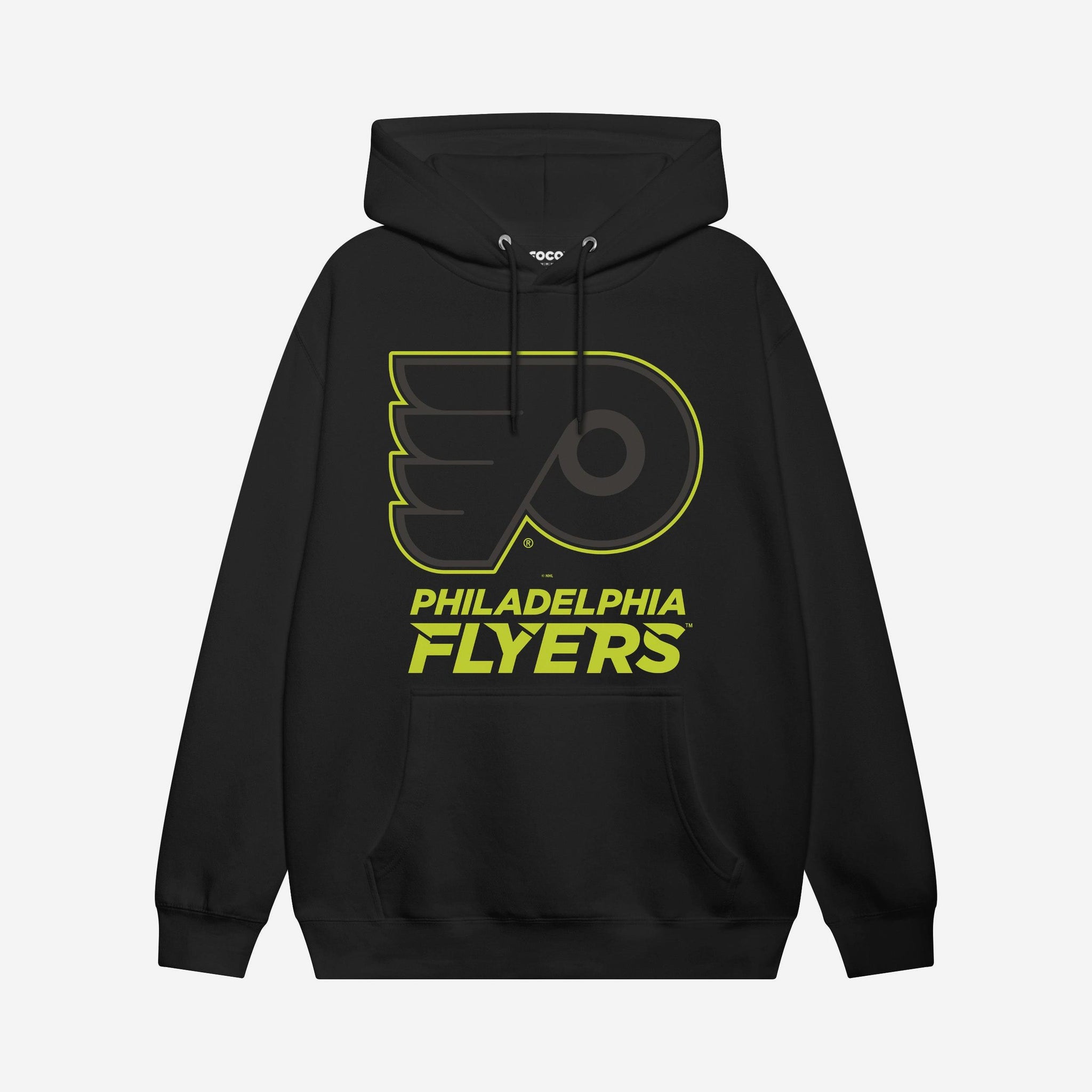 - Team logo display with highlight outline: The front of this apparel features a black Philadelphia Flyers team logo display outlined in neon, and a neon team name display