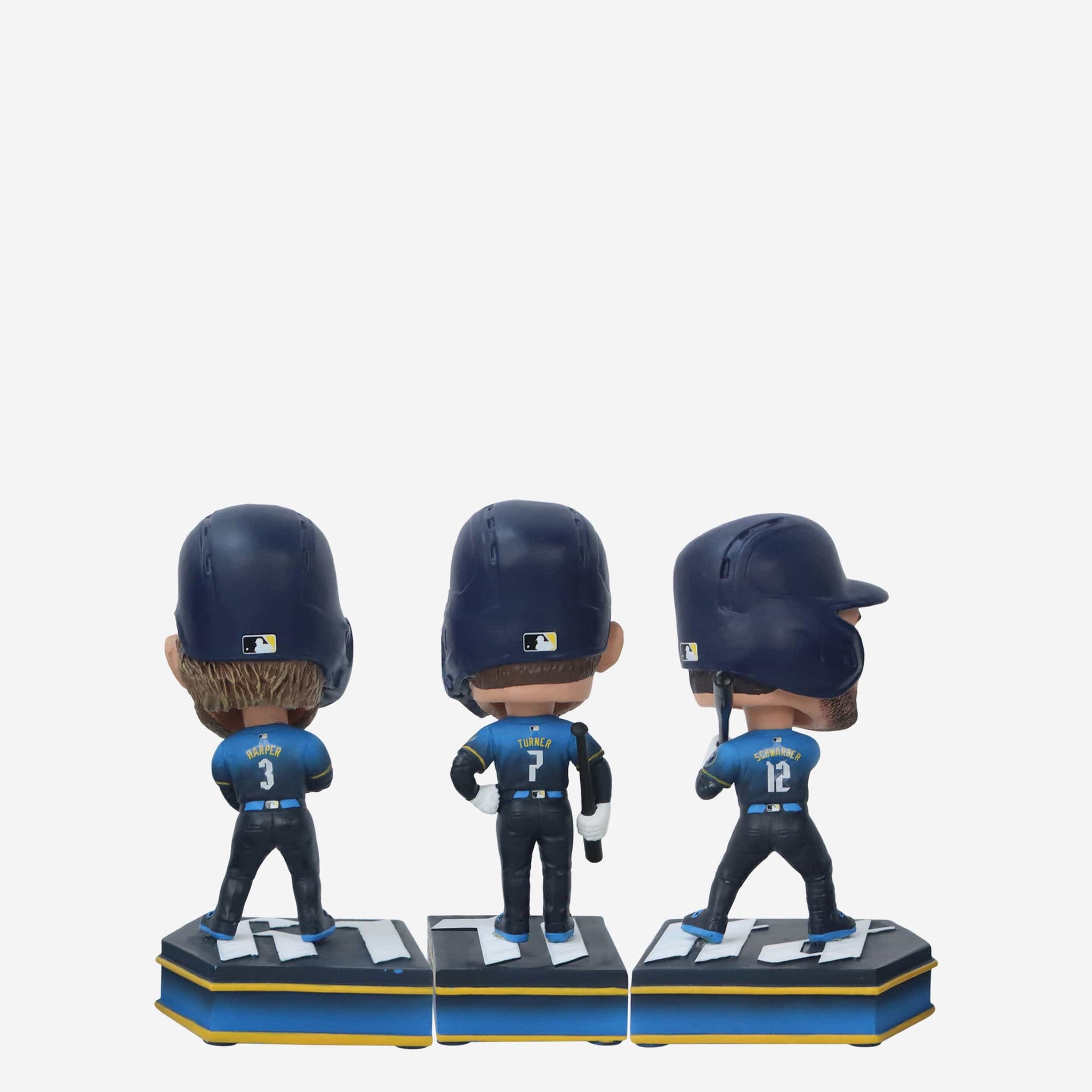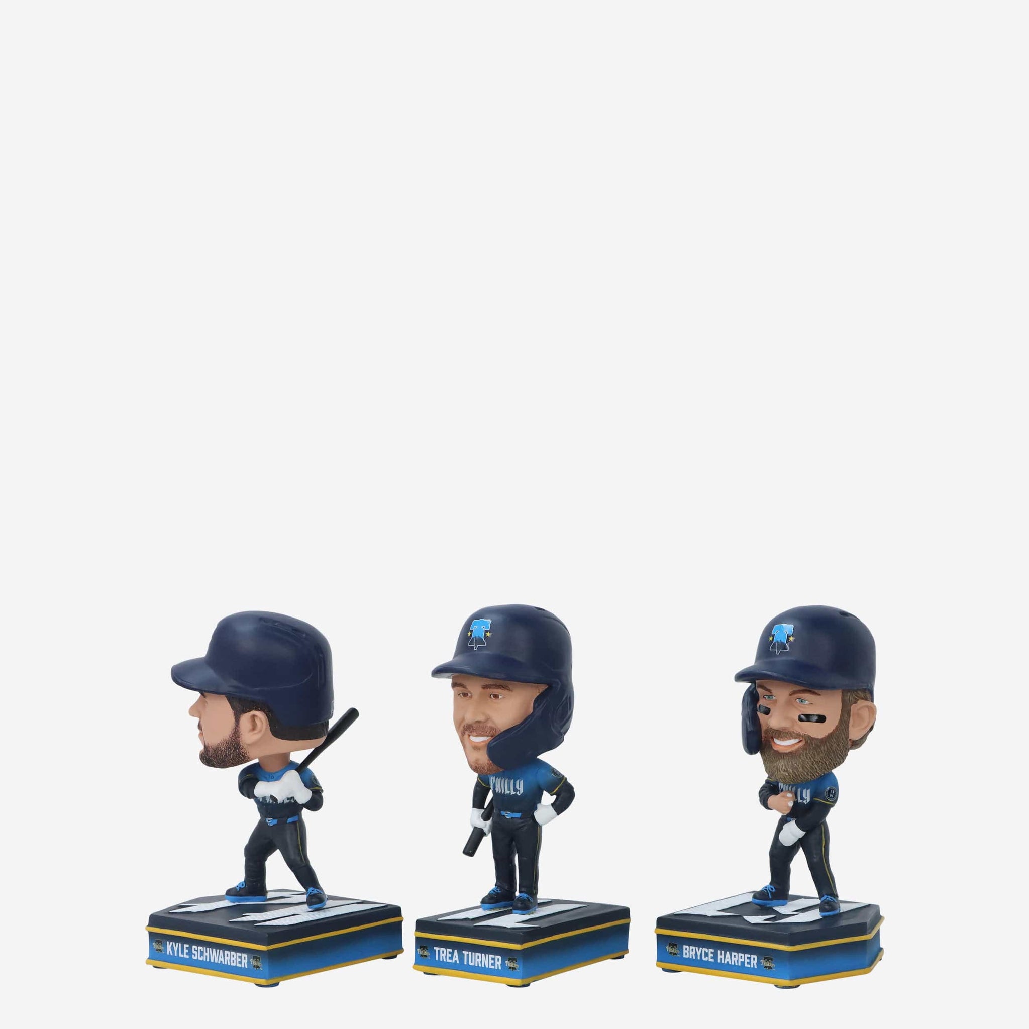 Schwarber. Turner. Harper. Bring a superstar connection to your collection with the Philadelphia Phillies 2024 City Connect Connecting Base 3 Pack Mini Bighead Bobblehead Set.