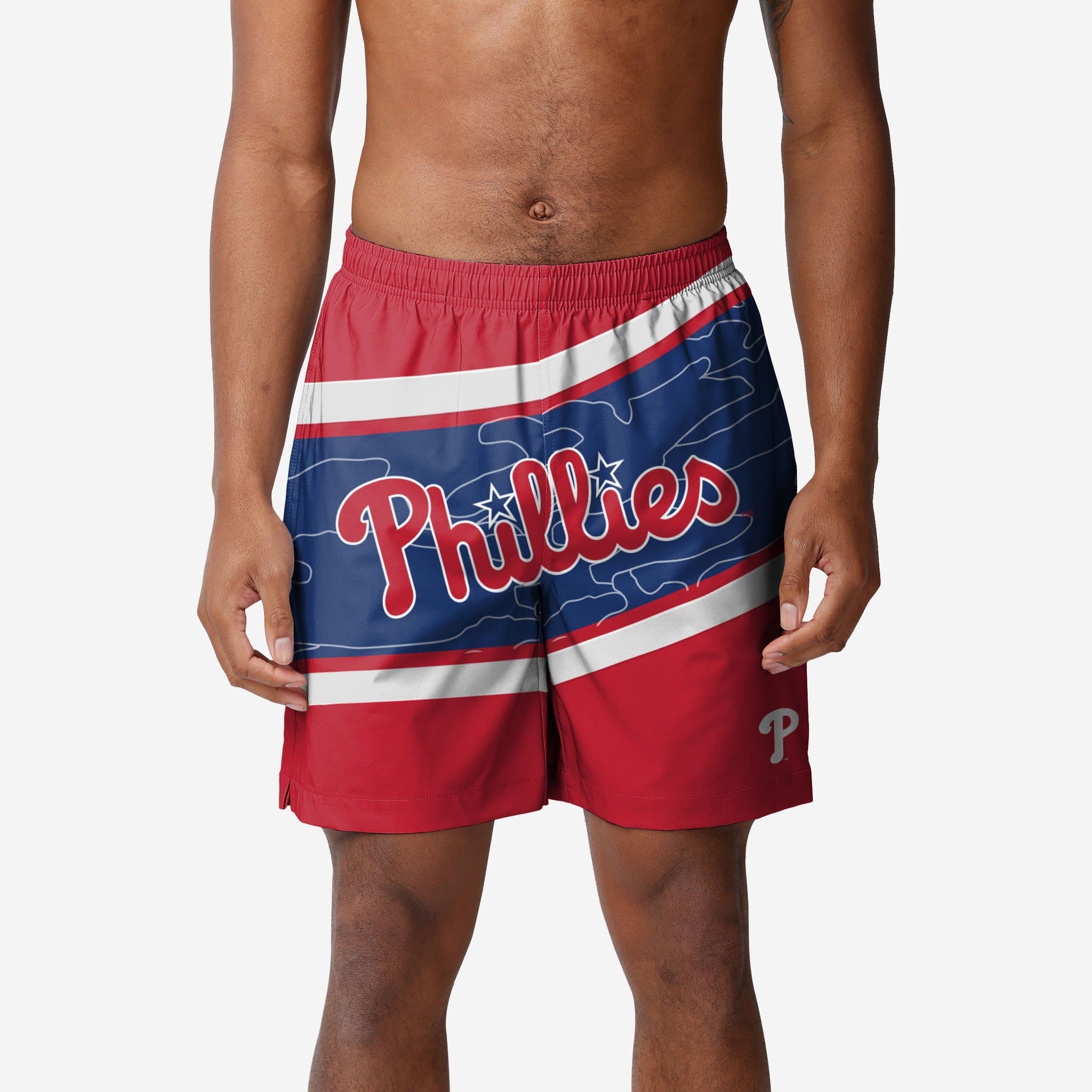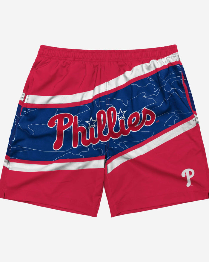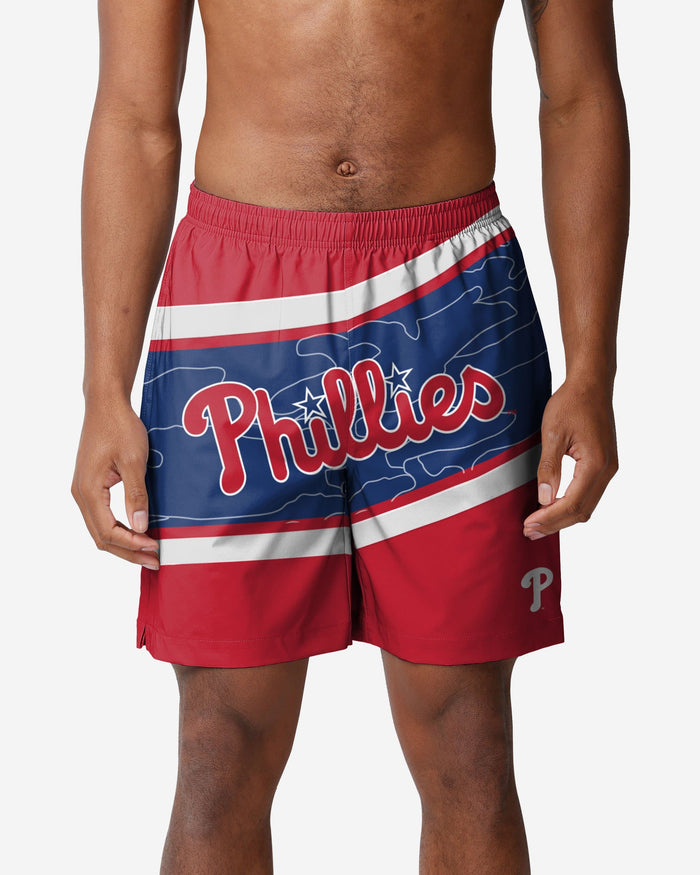 Enjoying a day off at the pool or beach? Don't forget your sunglasses, towel, sunscreen, and, of course, your fandom. These Philadelphia Phillies Big Wordmark Swimming Trunks can help with that last one. Fan on while you get your tan on.