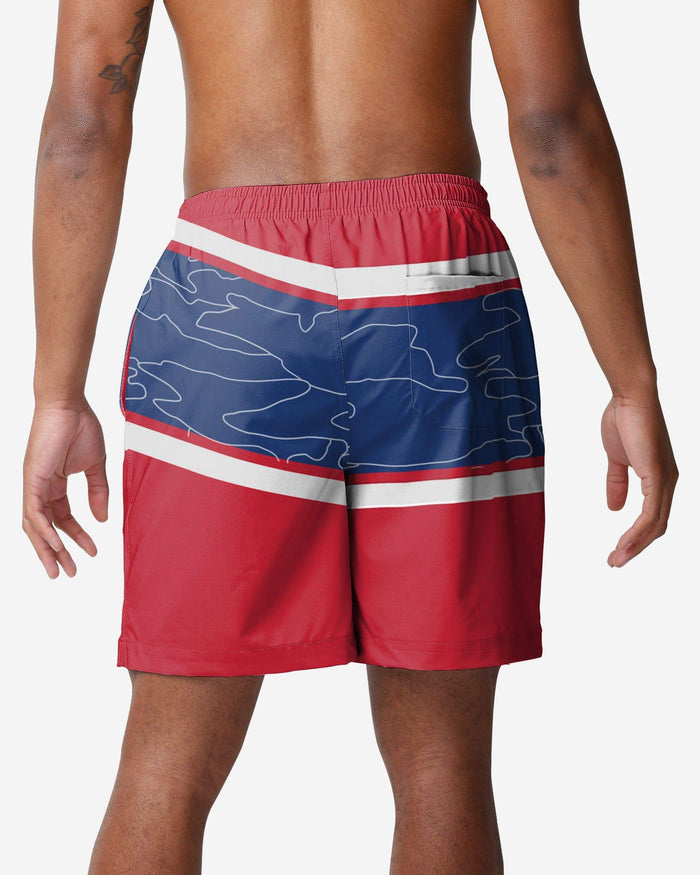 - Multi-team color design with bold, diagonal wordmark logo on front that will boldly show off your fandom as you stroll down the beach