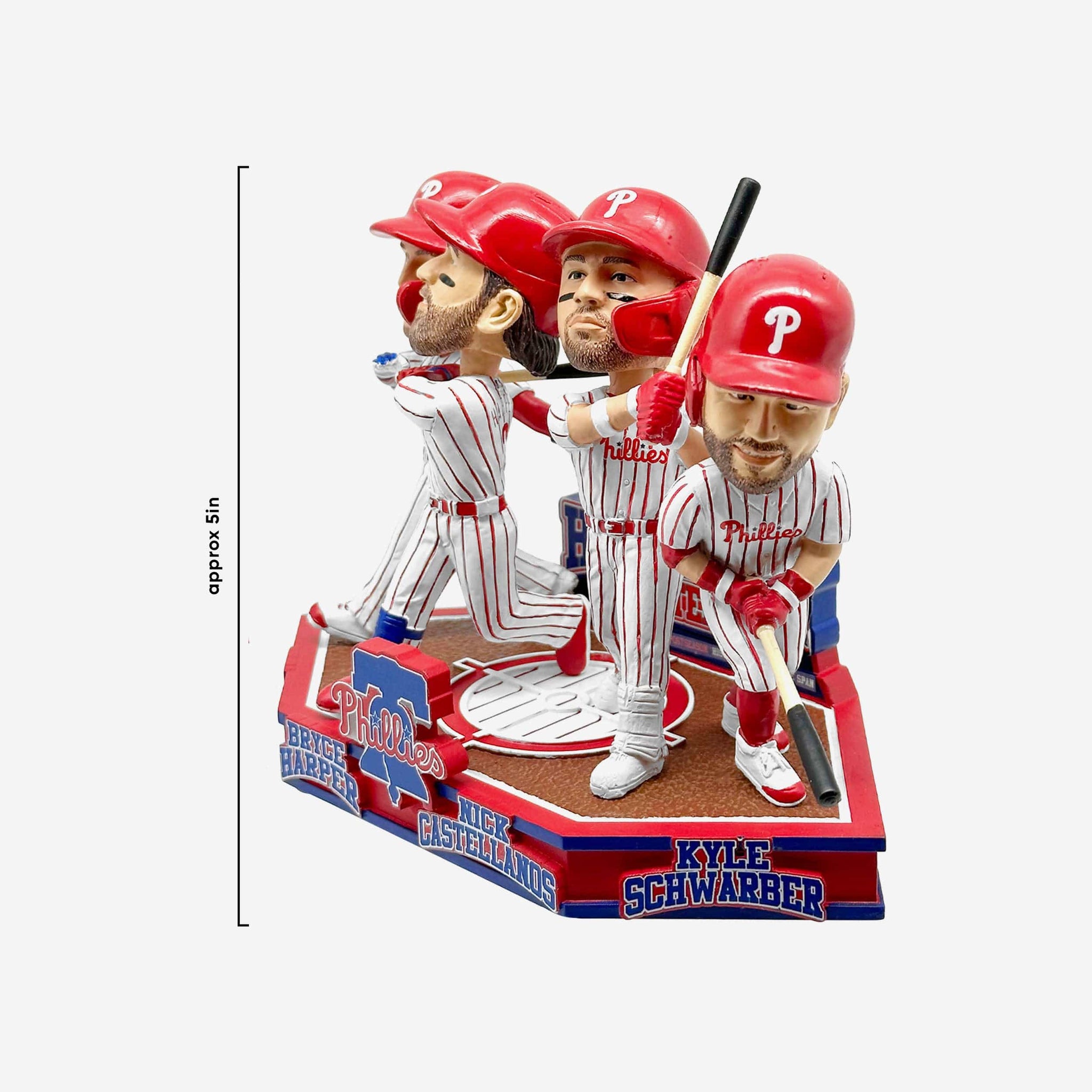 16 home runs in five games? That's not just impressive. That's historic. Step up to the plate and swing away with the Red October wrecking crew of Bryce Harper, Nick Castellanos, Kyle Schwarber, and Trea Turner with the Philadelphia Phillies Postseason Home Runs in Five Game Span Record Mini Bobblehead Scene.