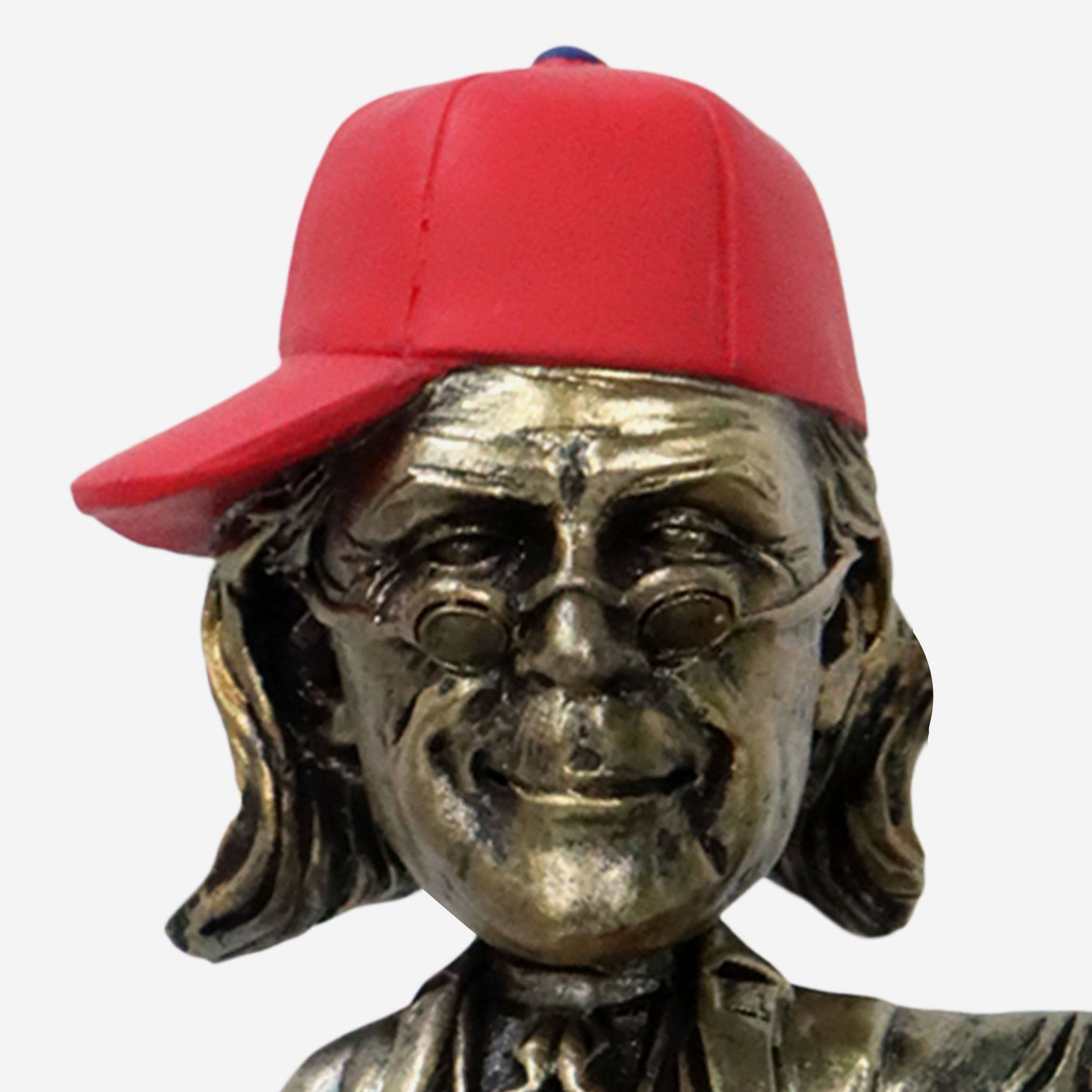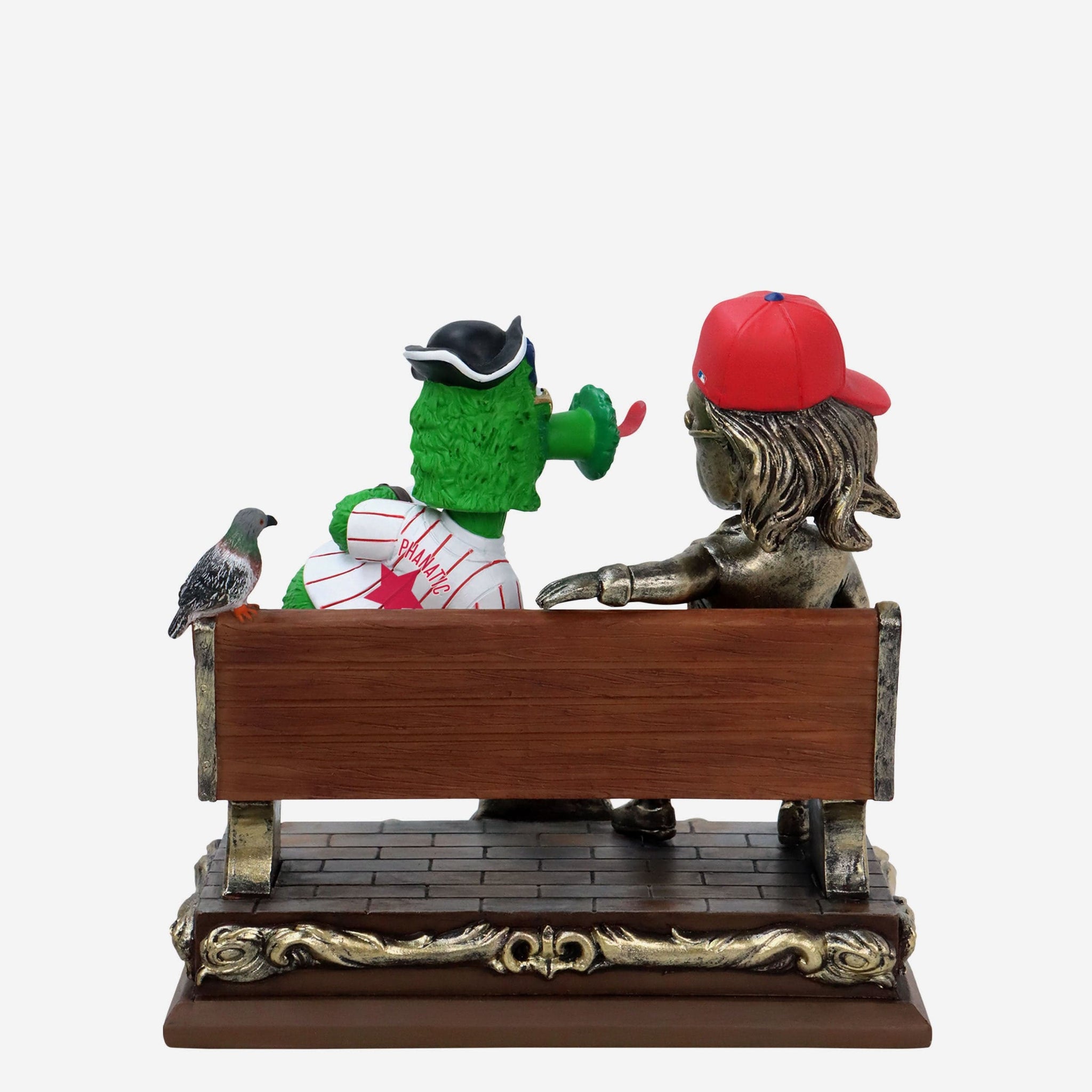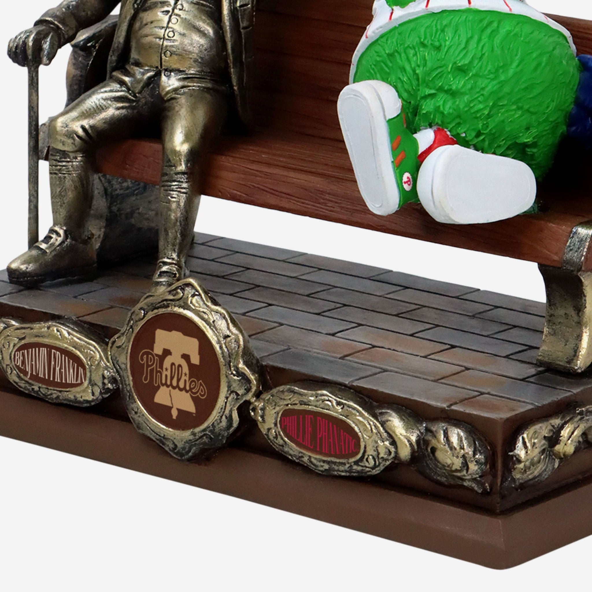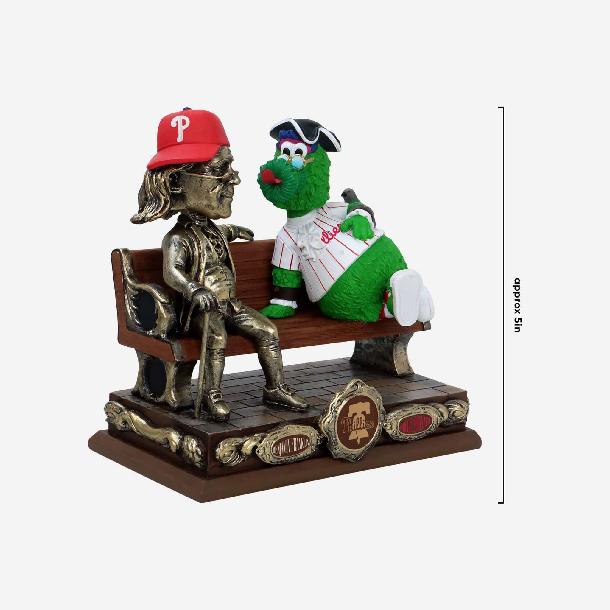 - Portrays the Phillie Phanatic sitting on a park bench with a metallic bronze figure of Benjamin Franklin for a historical dose of Philly phandom