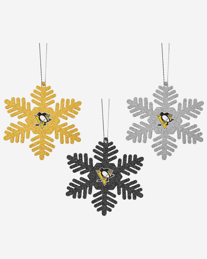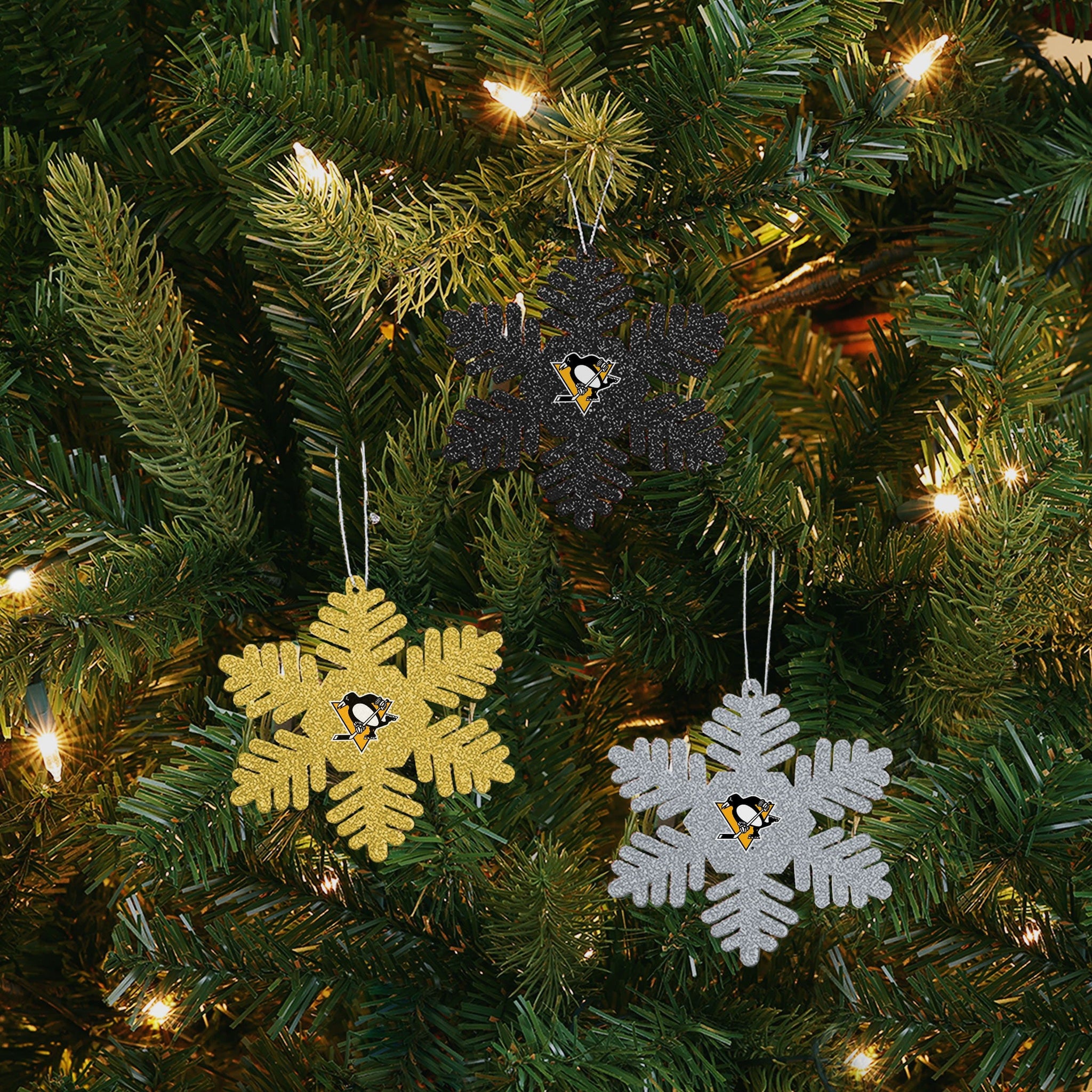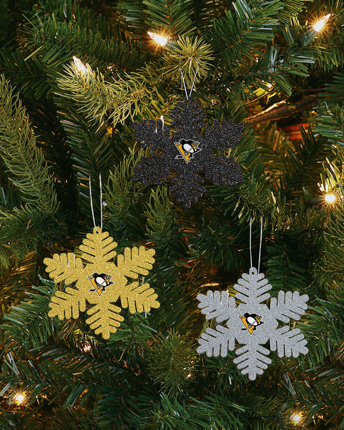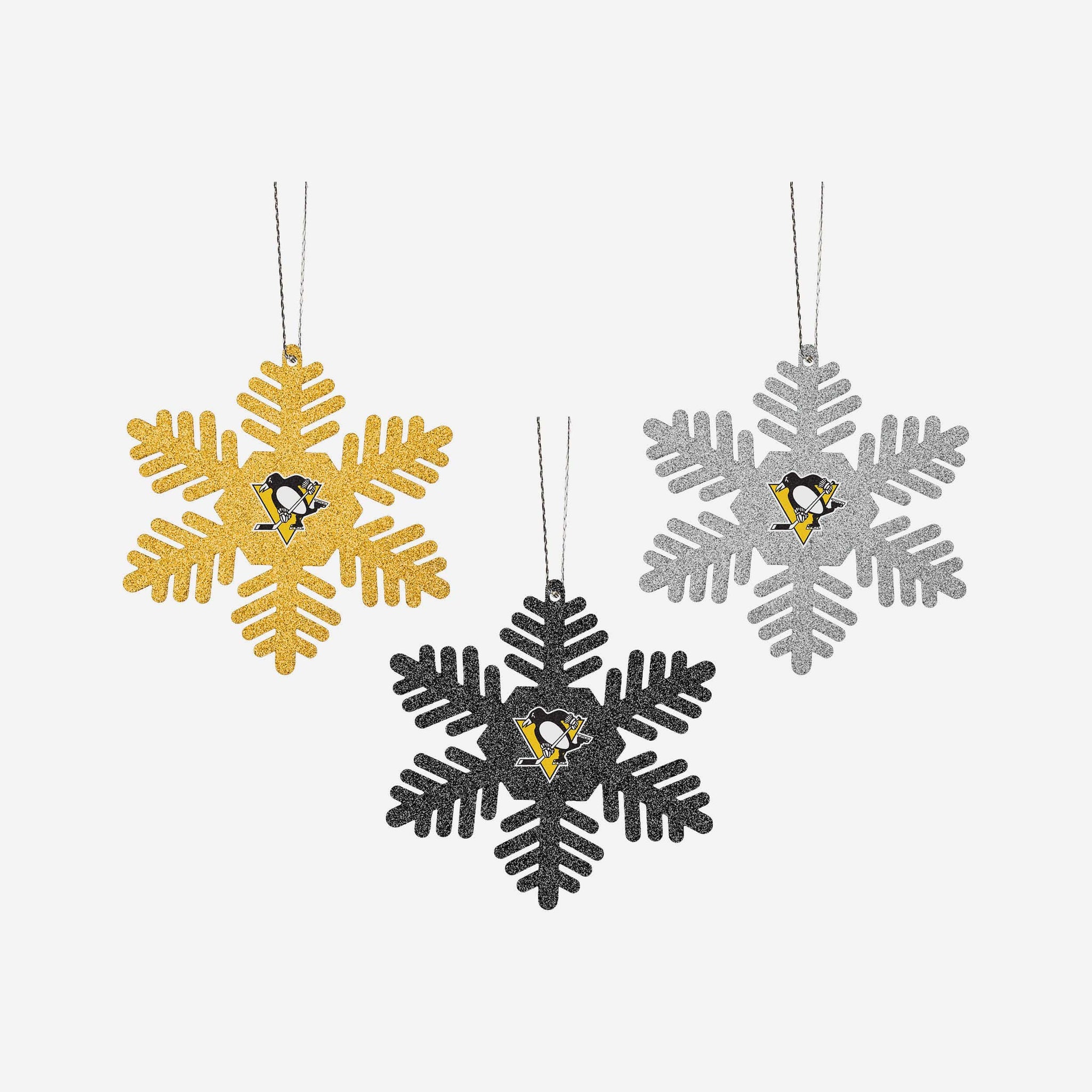 One half "Let it Snow", one half "Go Team Go!" This holiday season, let your team spirit AND holiday spirit shine by proudly displaying this Pittsburgh Penguins 3 Pack Metal Glitter Snowflake Ornament!