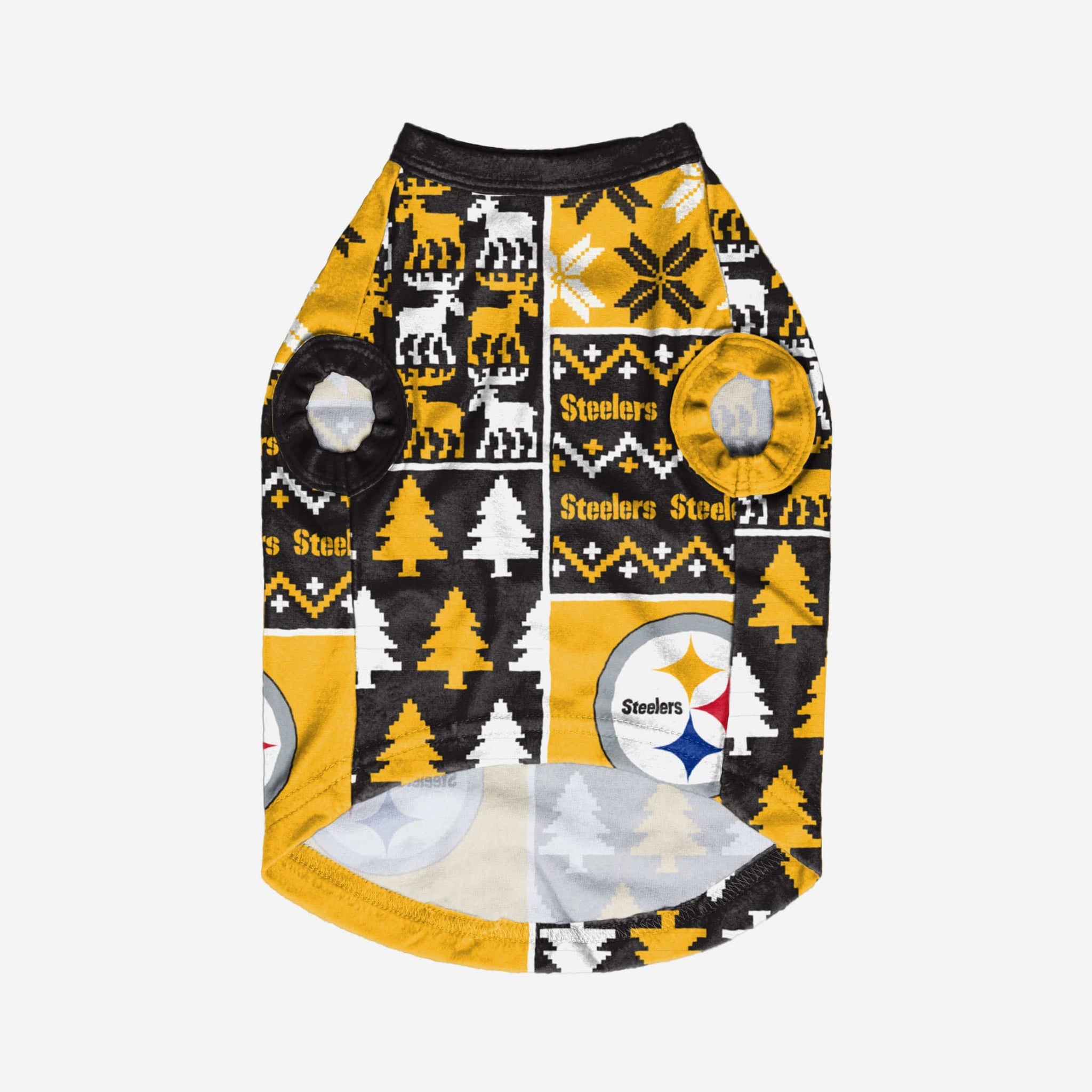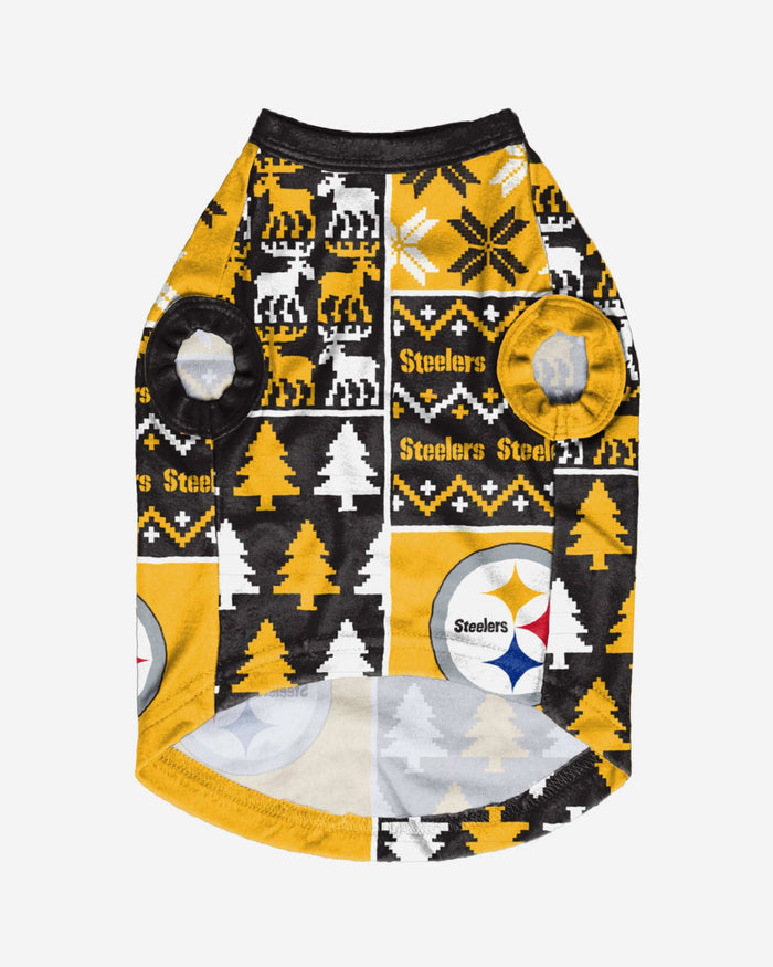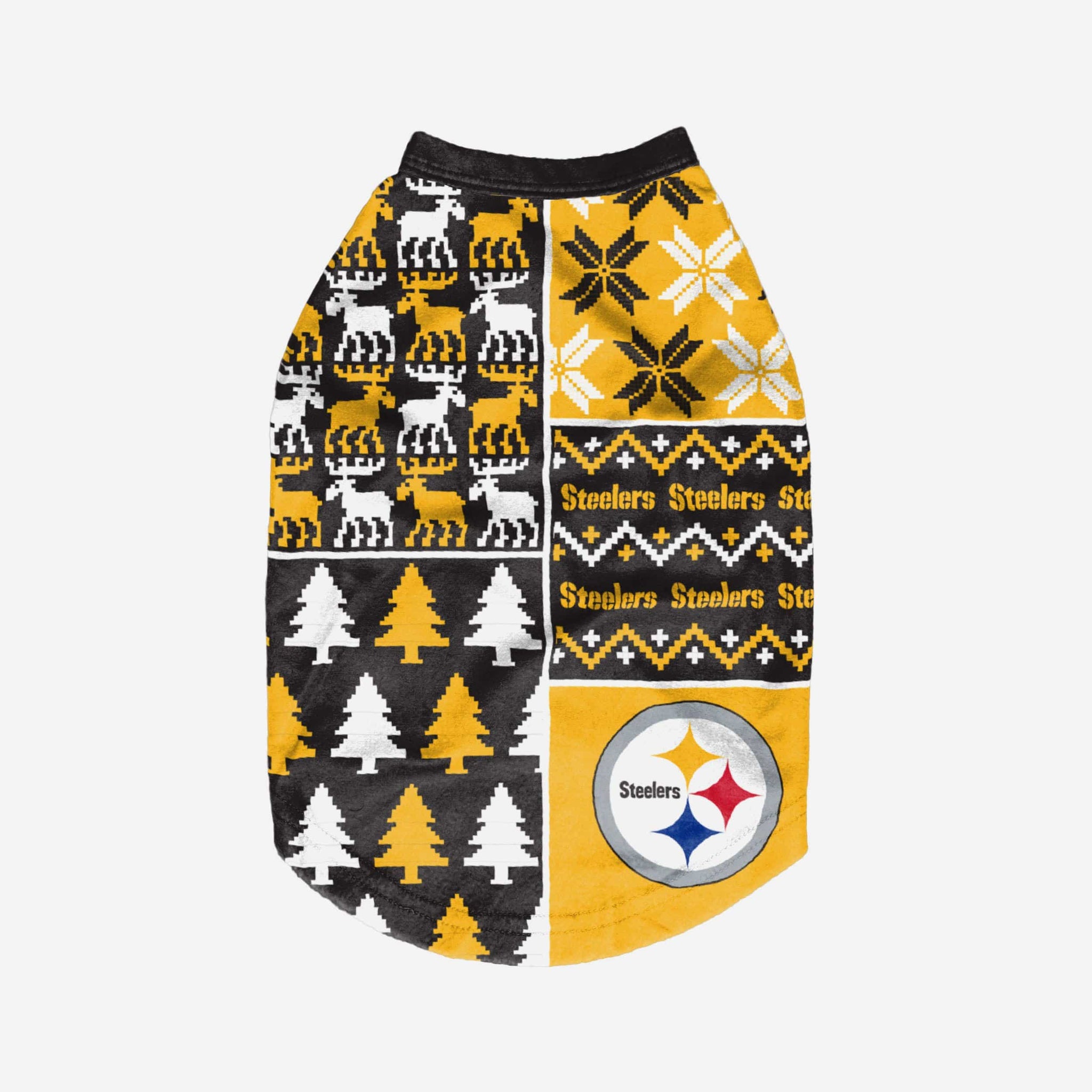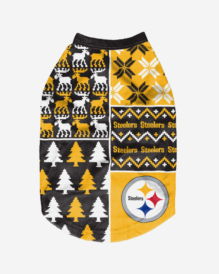 Show off your pet's holiday spirit with this dog sweater! Your good boy (or girl) will love this Pittsburgh Steelers Busy Block Dog Sweater so much, they'll be saying "woof bark awooo" (that's "thank you" in pup language). Don't forget to match your canine's sweater with a set of matching holiday pajamas!