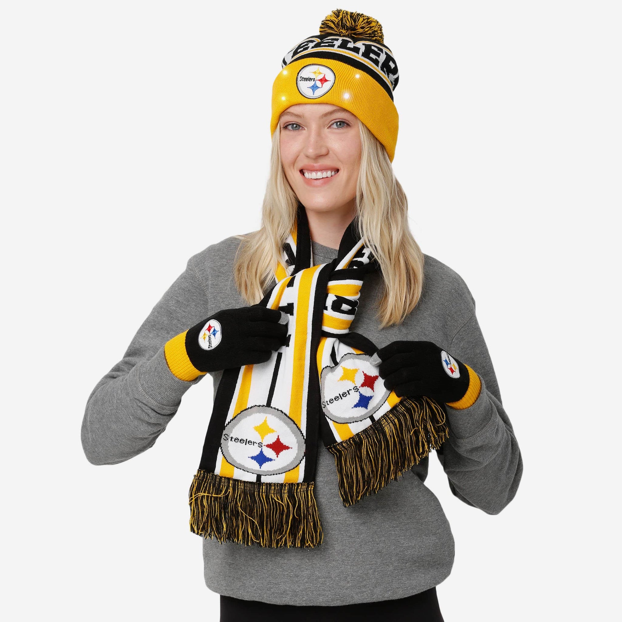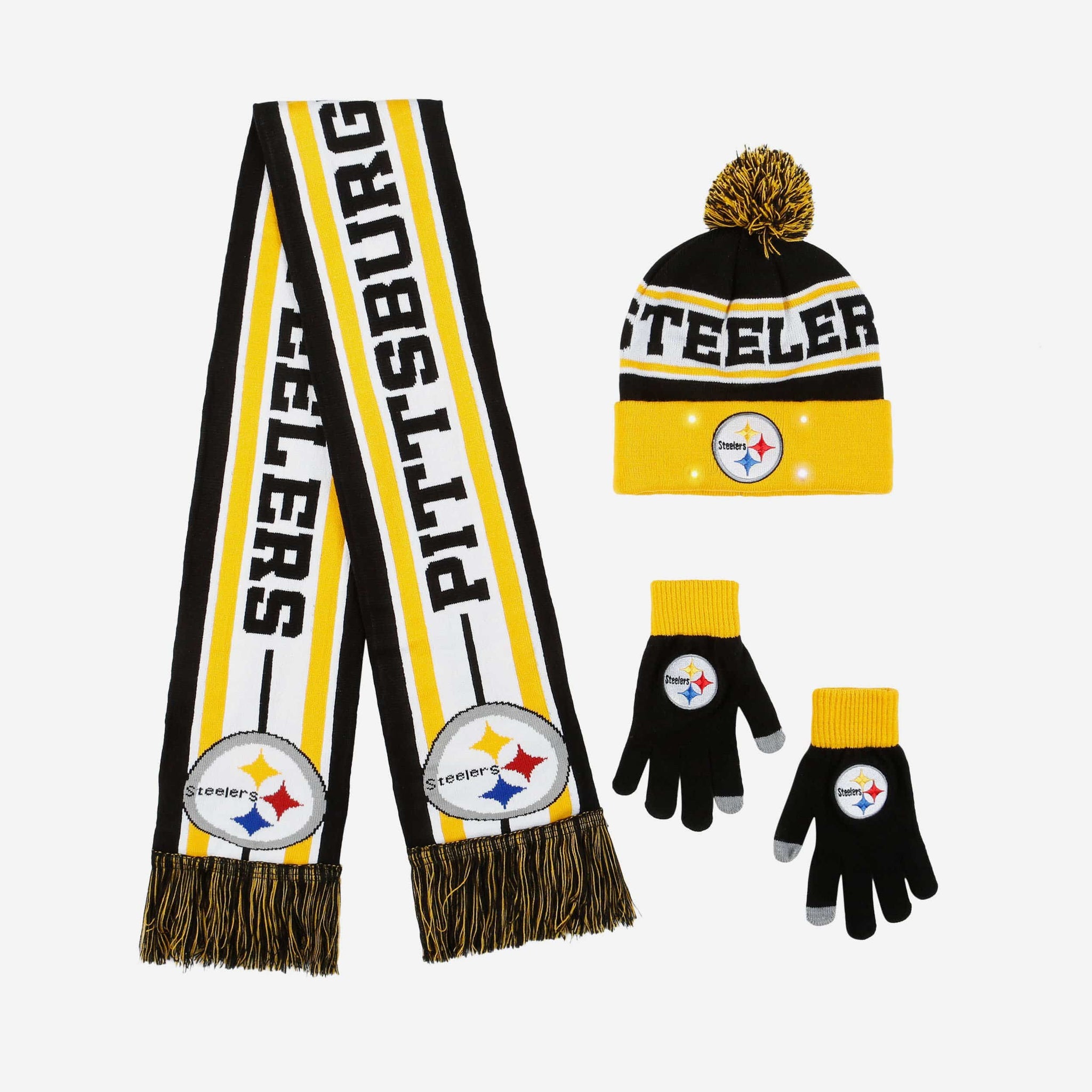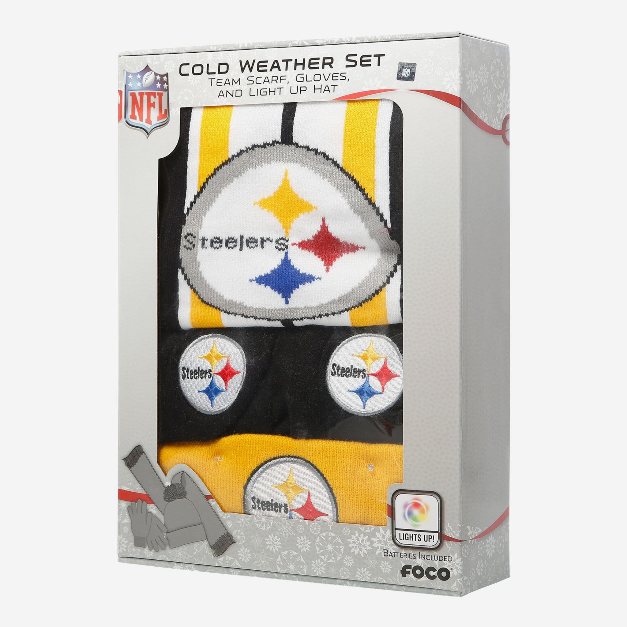 Scarf? Check. Gloves? Check. Light up beanie? You guessed it - Check. Show the snow who's boss with this Pittsburgh Steelers Snow Stealer Cold Weather Set!