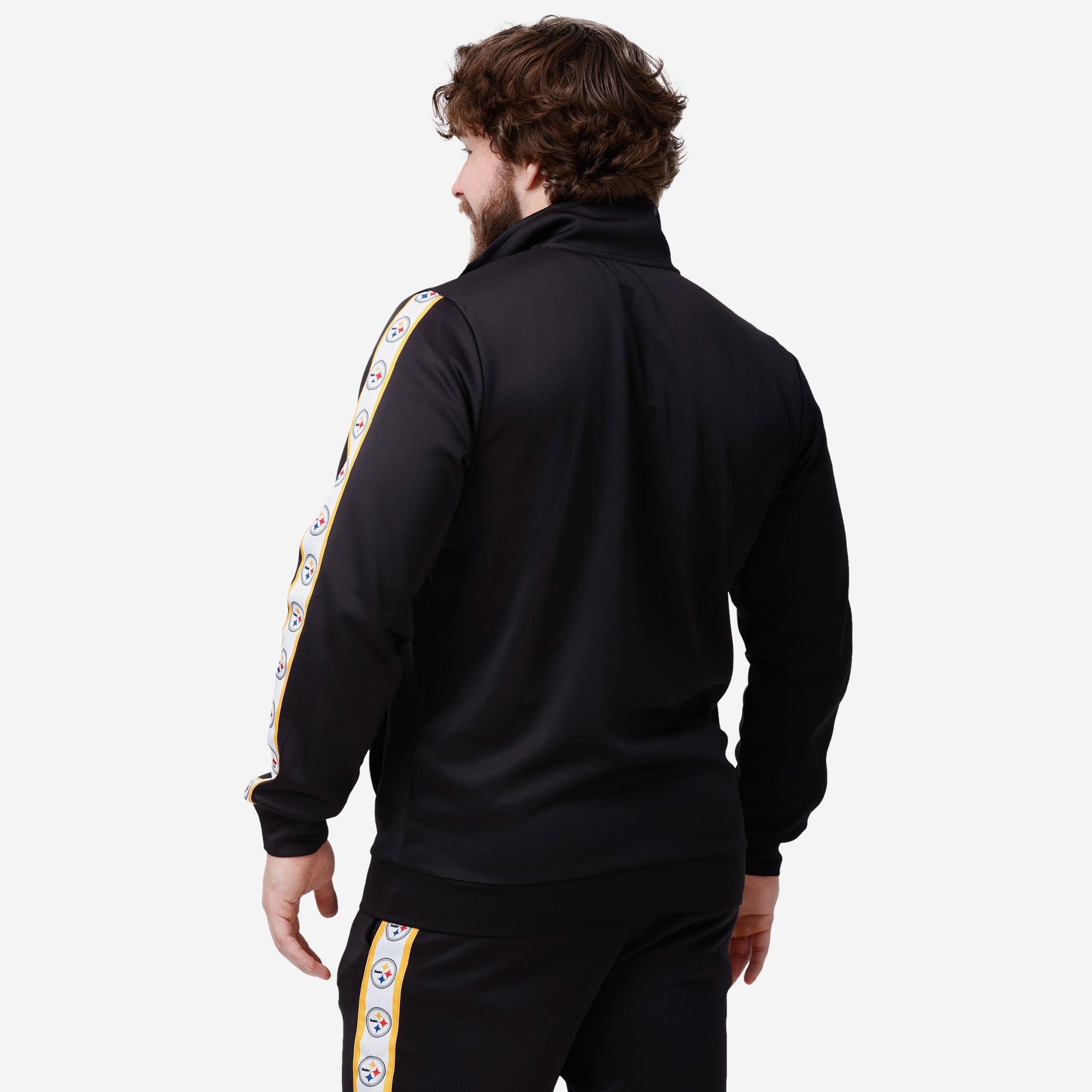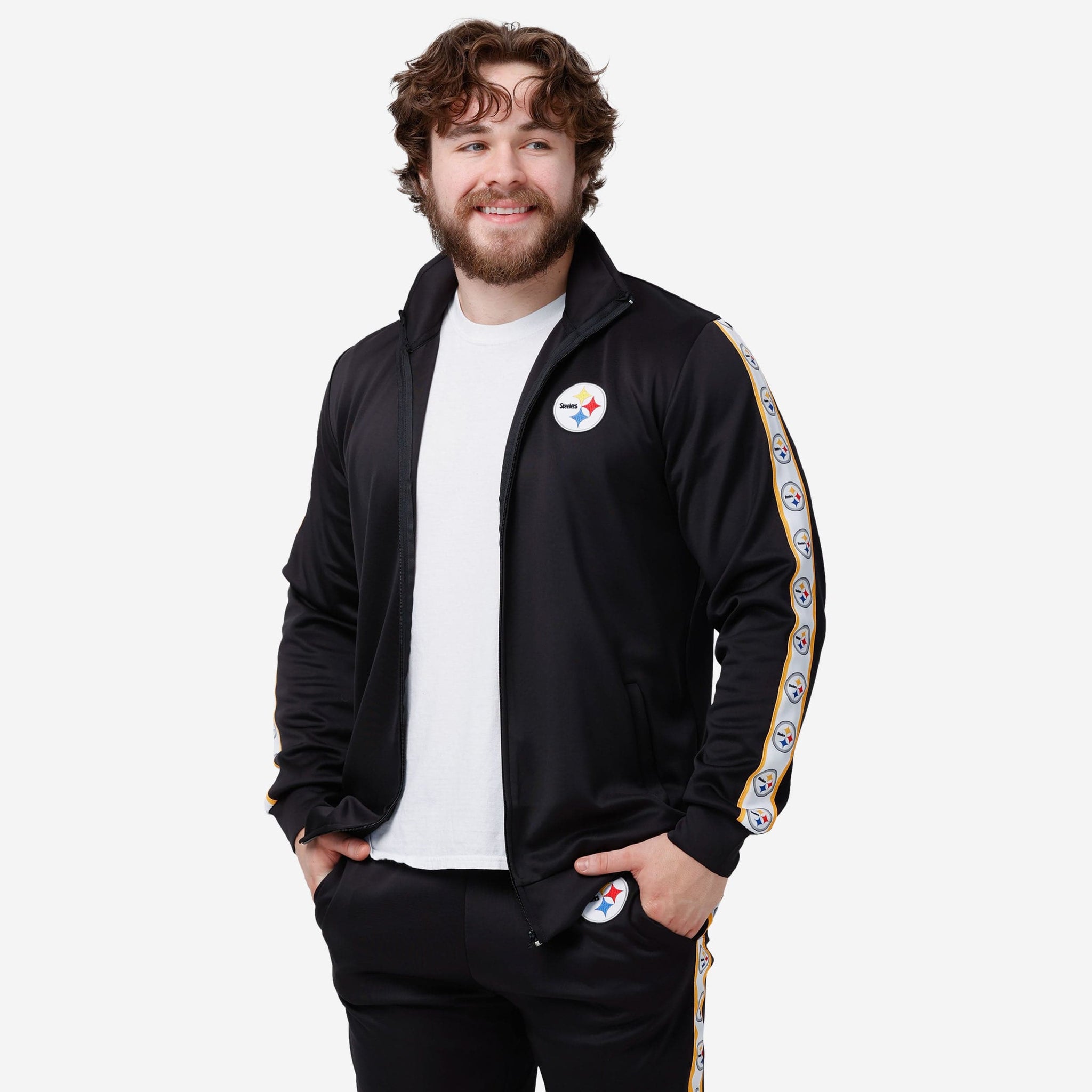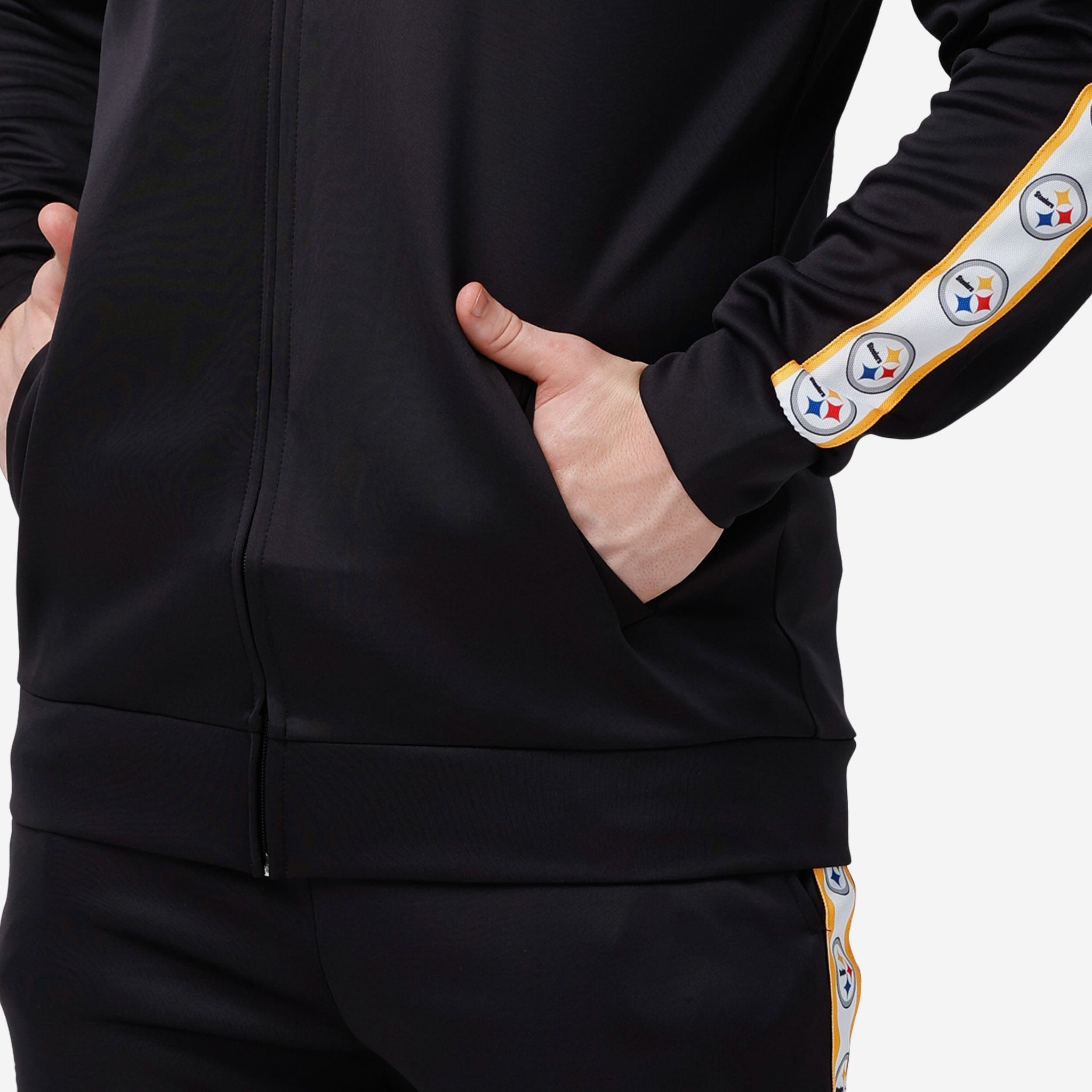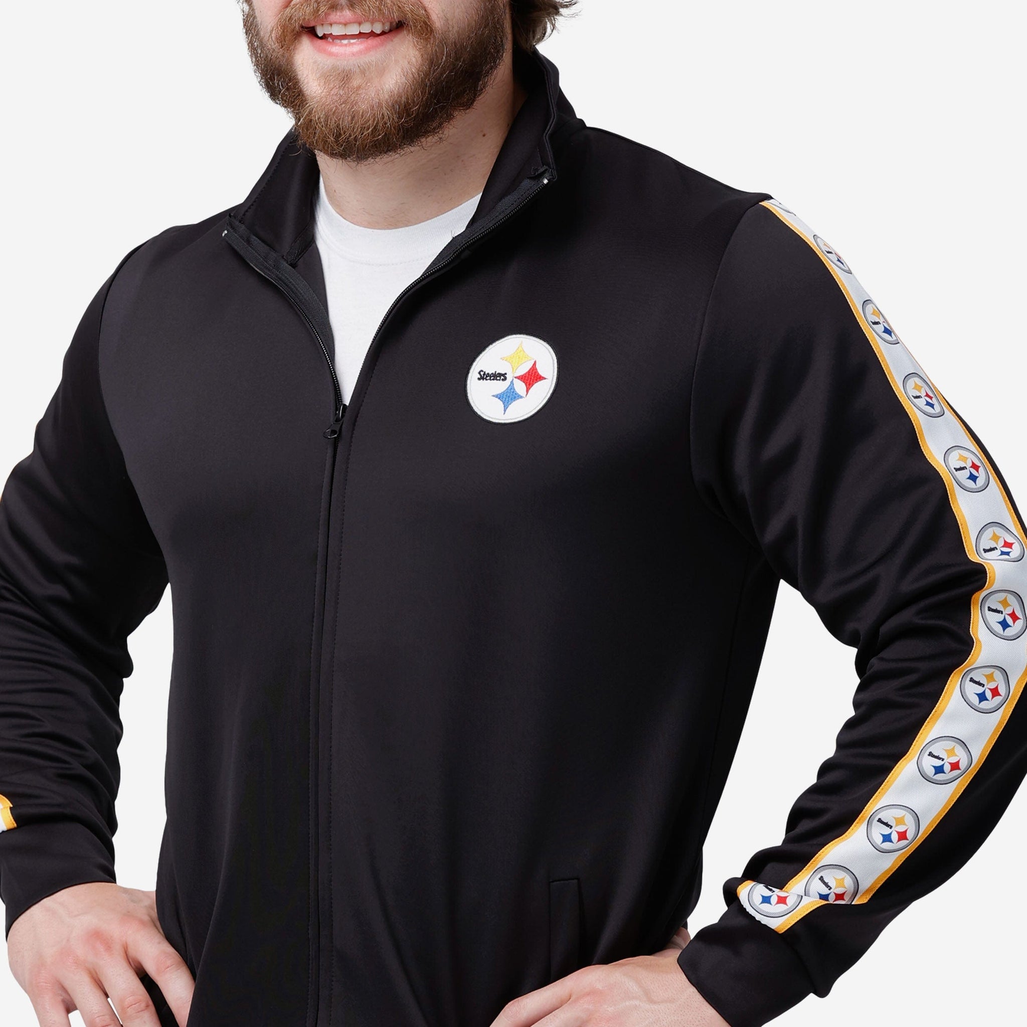 A jacket that you'll be jacked up to wear. Bundle up for your jog around the block with this Pittsburgh Steelers Stripe Logo Track Jacket.