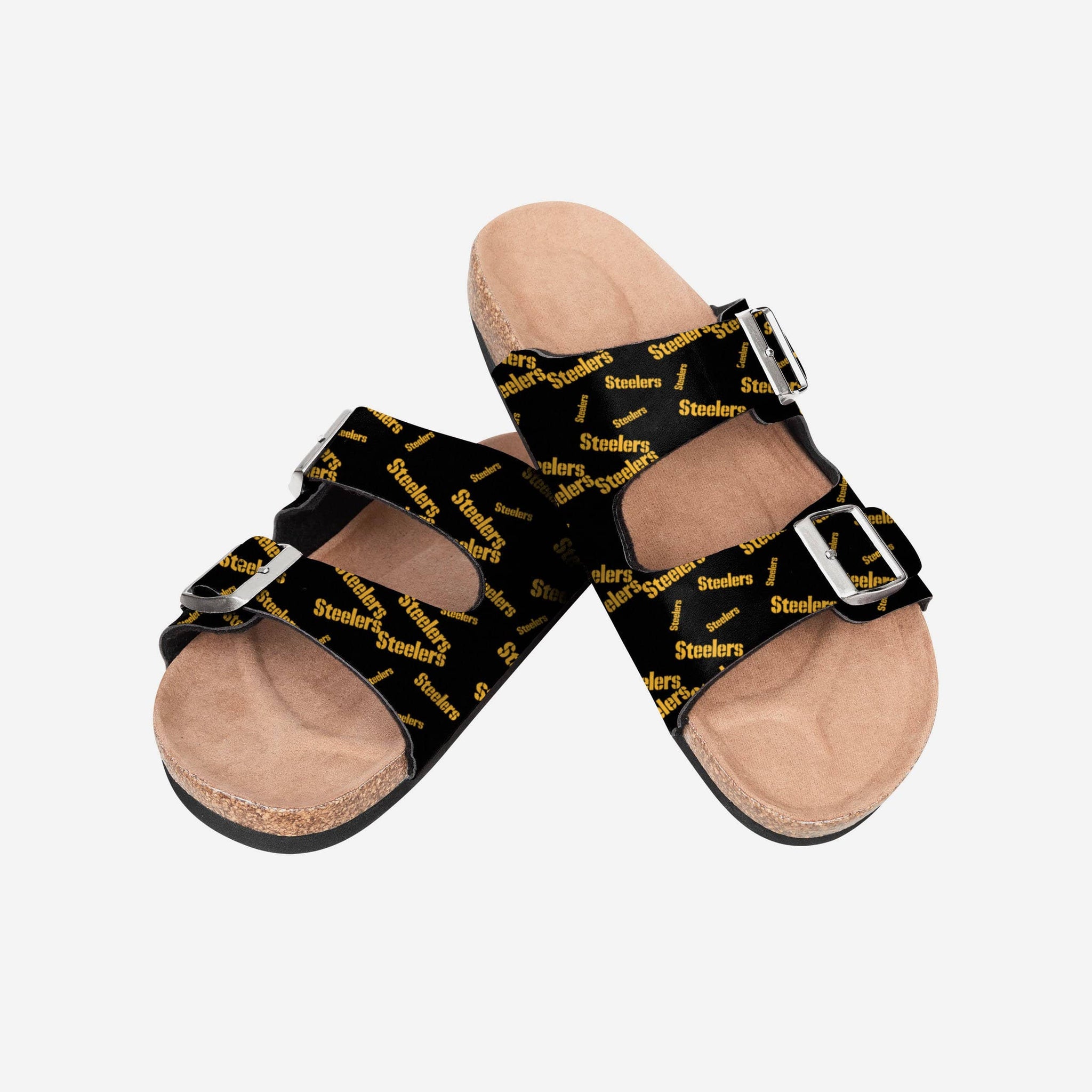 Double your fun. Double your fan. With the Pittsburgh Steelers Women's Mini Print Double Buckle Sandals, you can step in style, and not have to worry about getting sand in your shoes during your next beach excursion.