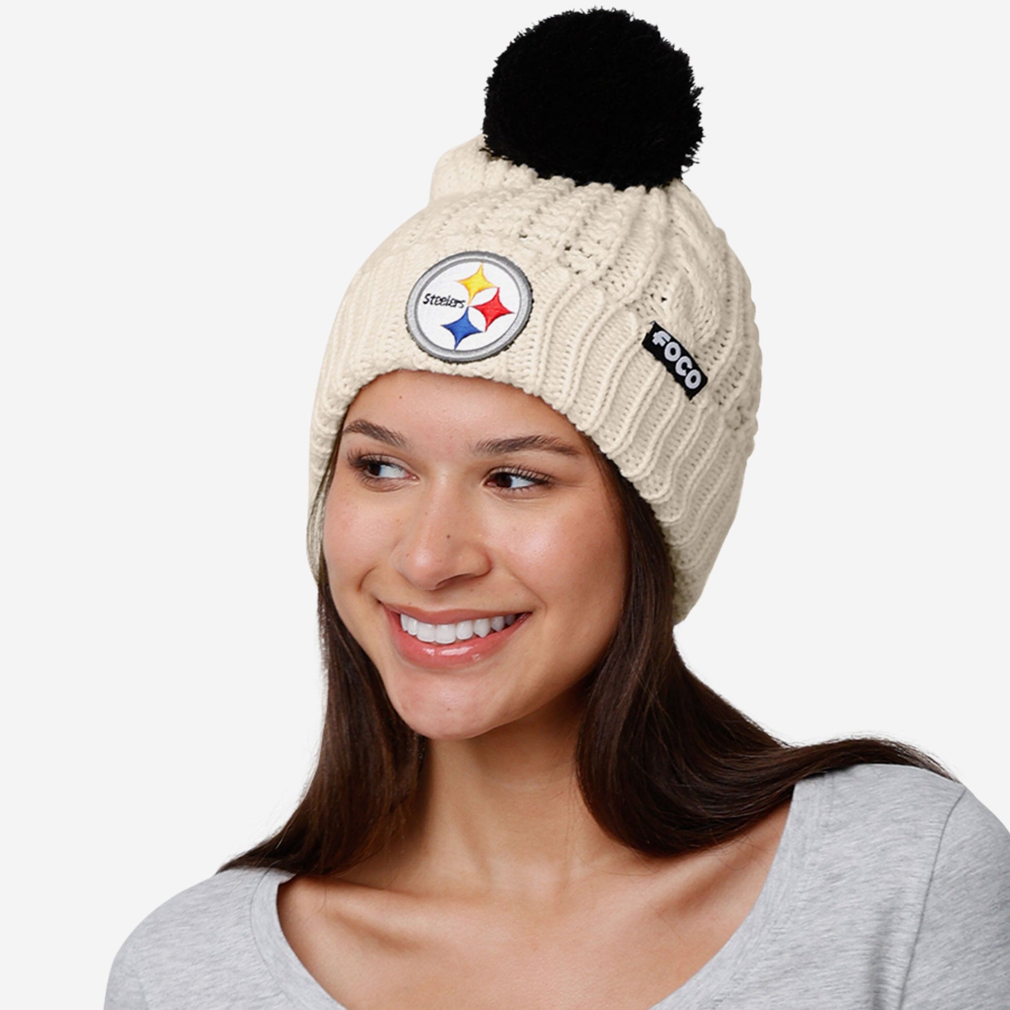 Putting together the ultimate fit for the tailgate and beyond? Make sure to get your head in the game with the Pittsburgh Steelers Women's Primary Logo White Cable Knit Pom Beanie!