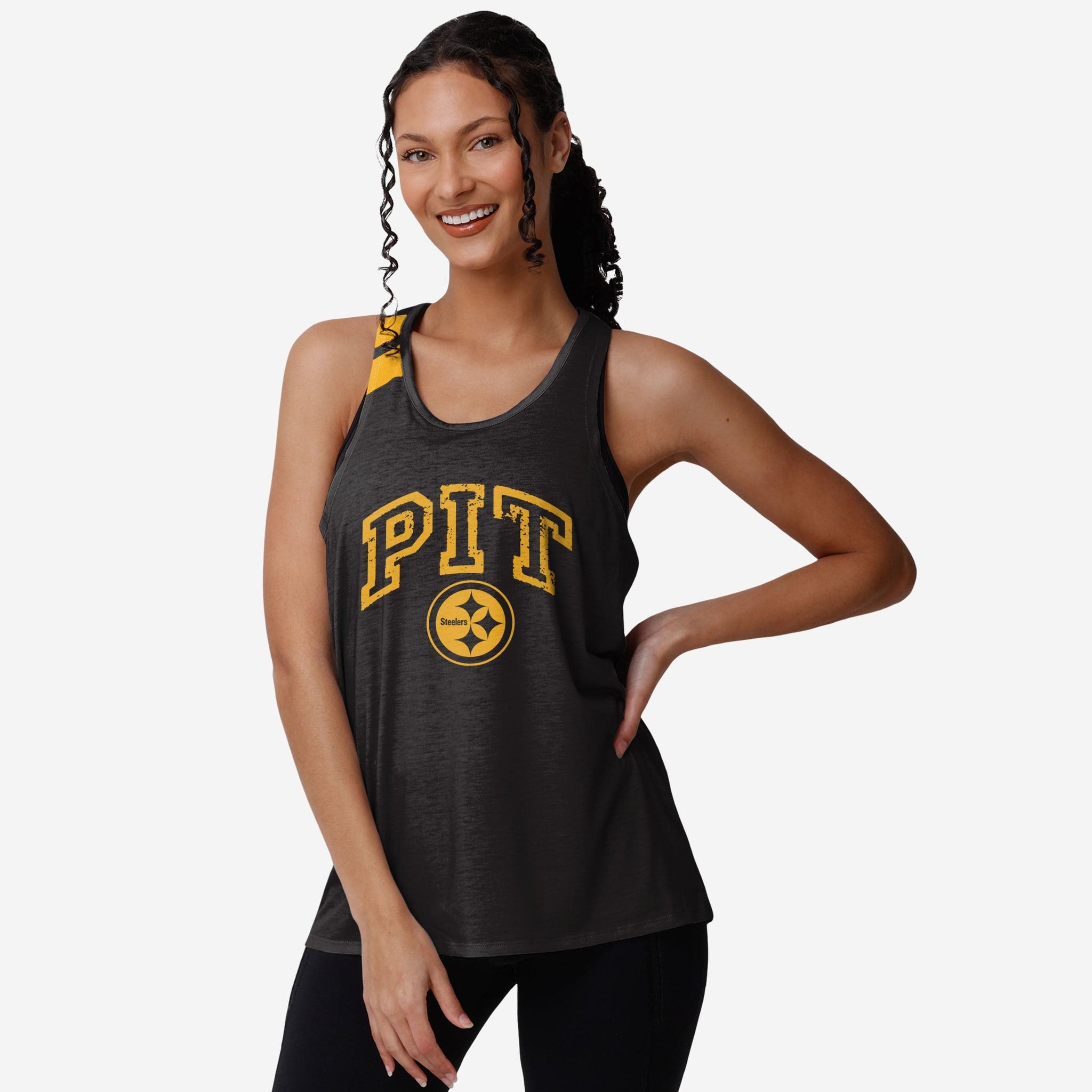 Get ready to flex your fan muscles, with a twist. Literally. This Pittsburgh Steelers Women's Team Twist Sleeveless Top shows off your team spirit and will have you looking good at the beach, in the gym, or wherever else you feel like showing everyone what a true fan looks like.
