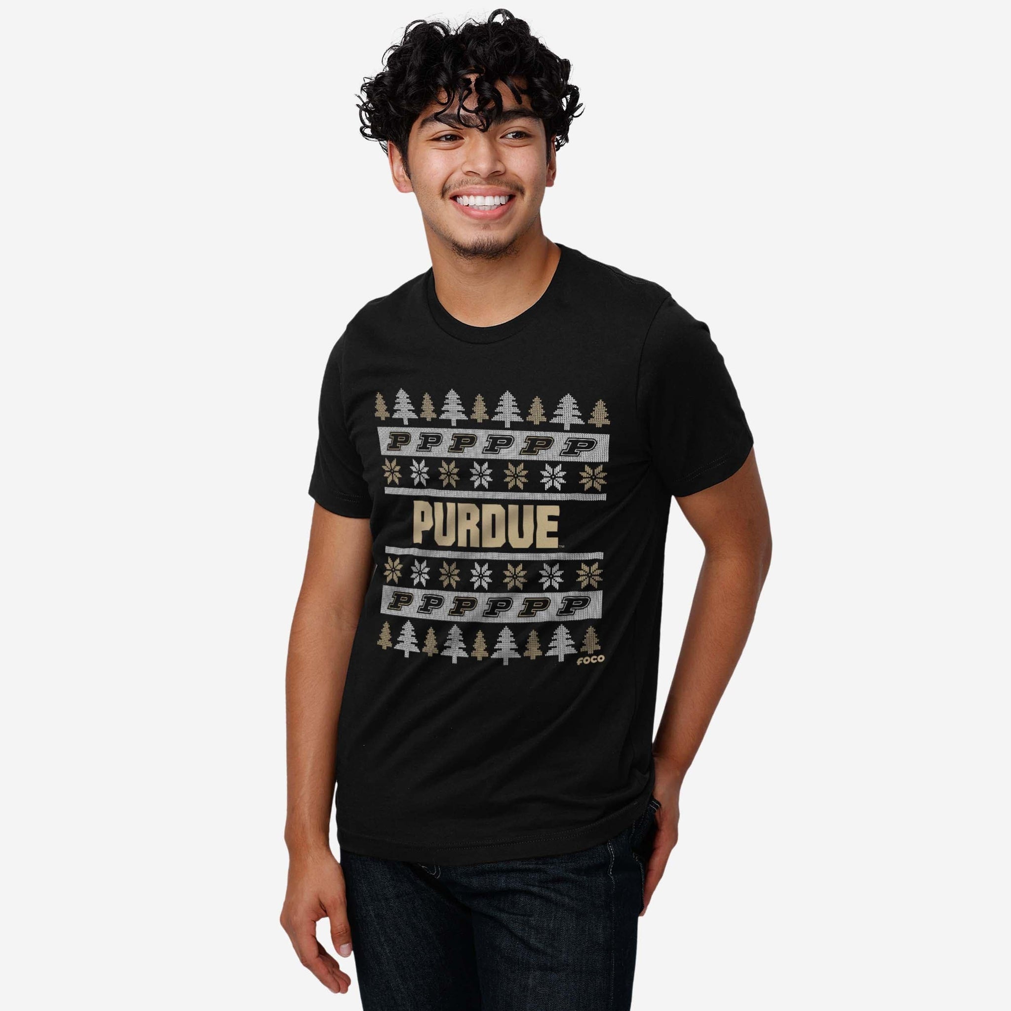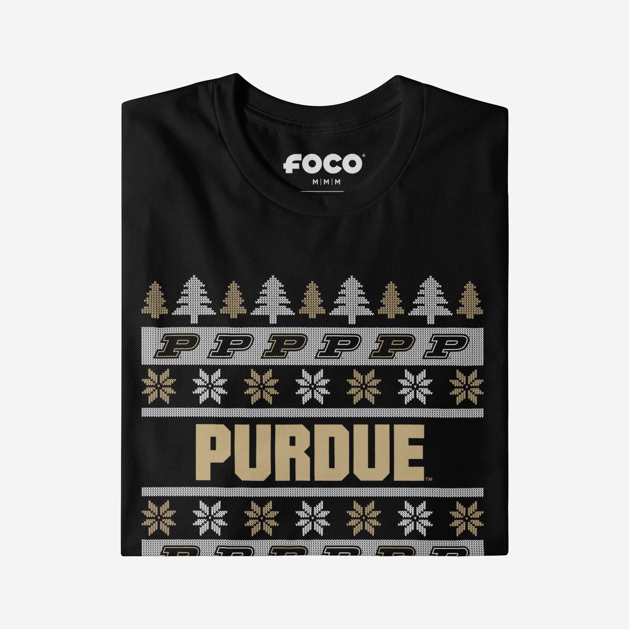 - Festive, team-colored design: This traditional t-shirt shows off the official Purdue Boilermakers colors in an all-over team-colored design with winter tree and snowflake accents, so you can show your team spirit with pride.