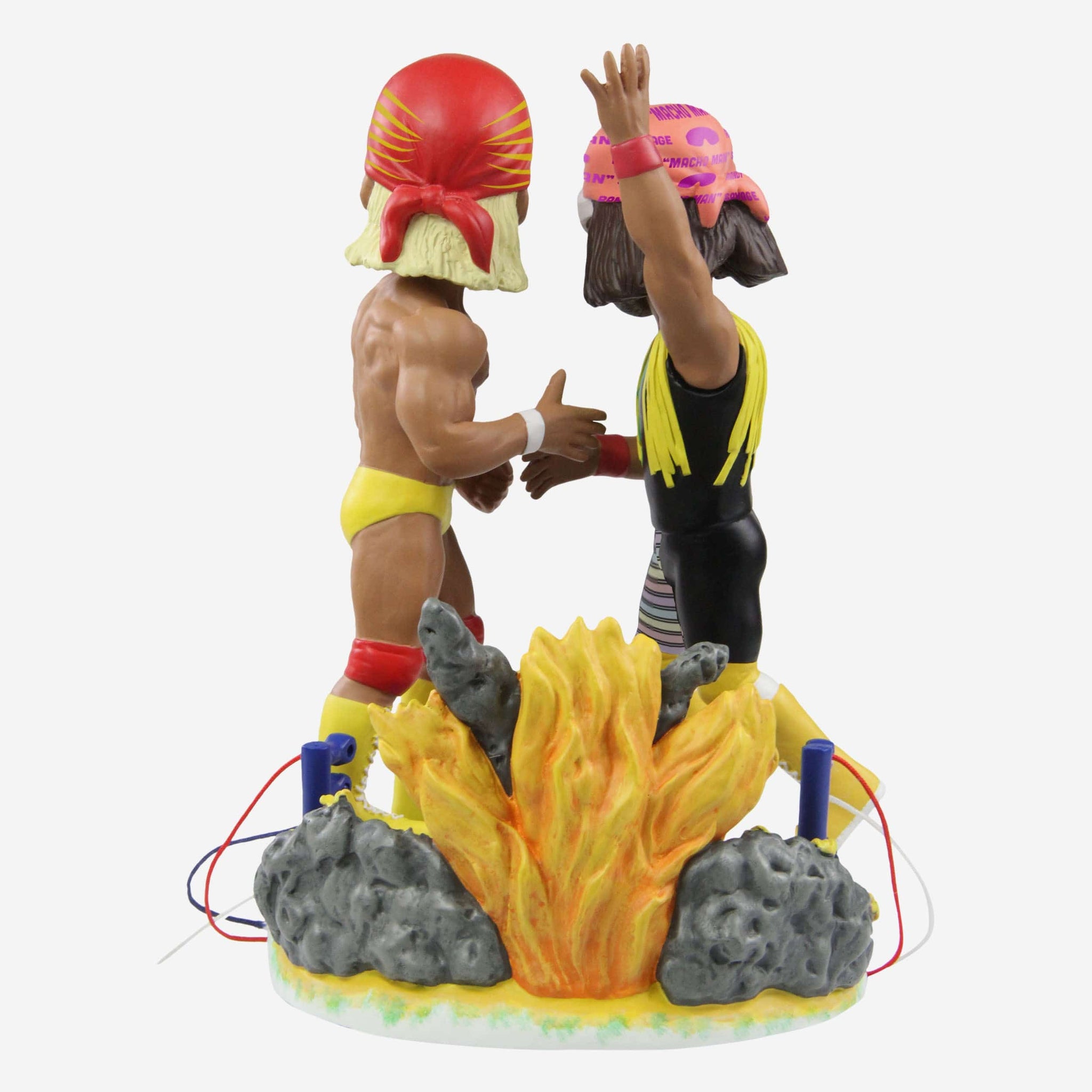 - Portrays Macho Man Randy Savage and Hulk Hogan wearing their ring attire in their famous handshake pose, ready to deliver a Savage Elbow and Atomic Leg Drop to the competition