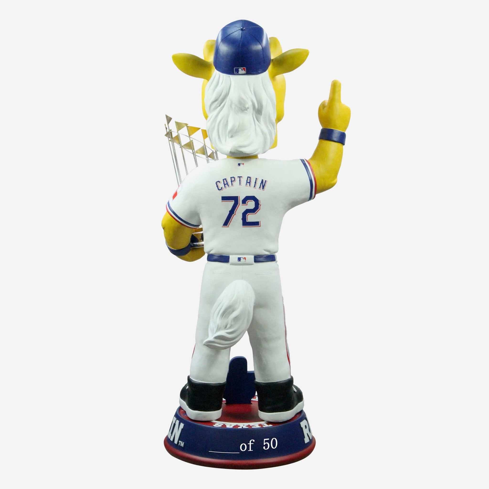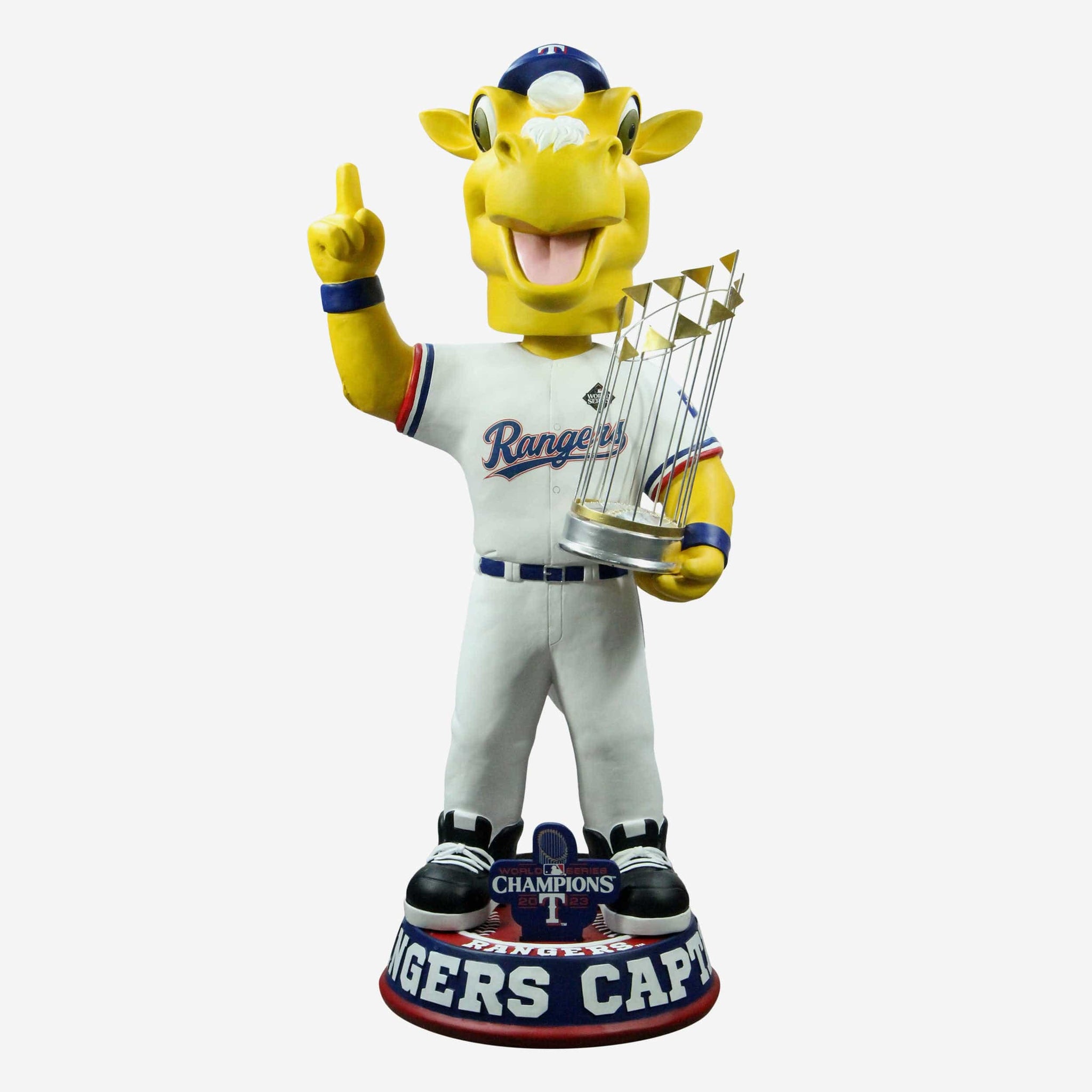 A World Series championship celebration, bigger and better than any before it. Immortalize that historic triumph by bringing this Rangers Captain Texas Rangers 2023 World Series Champions 3 Ft. Mascot Bobblehead to your collection.