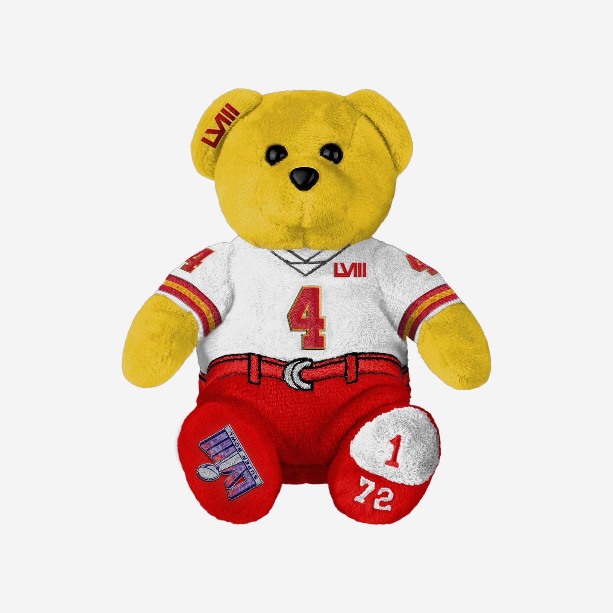- Plush bear portrayed wearing a white Super Bowl LVIII uniform that will look great in your NFL collection