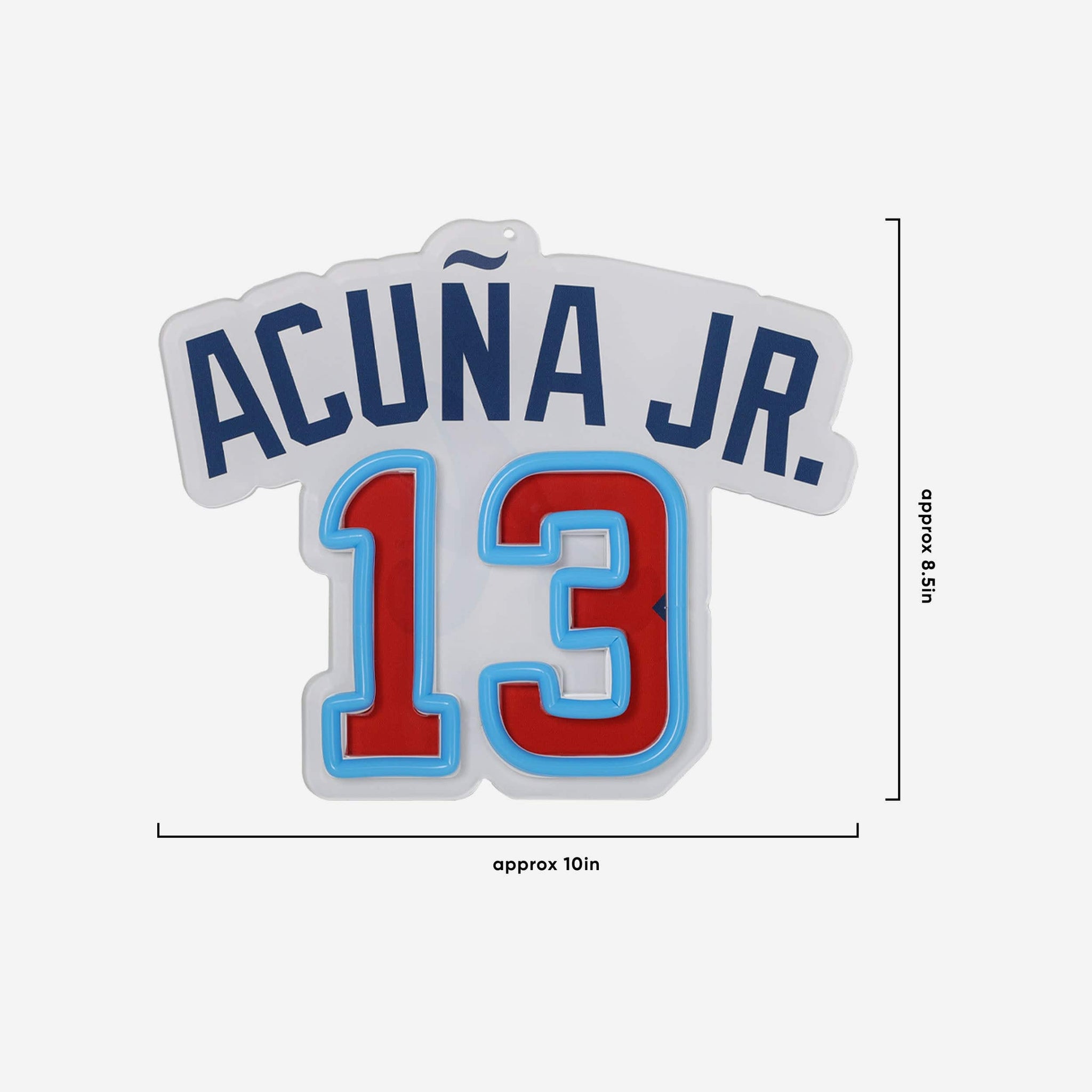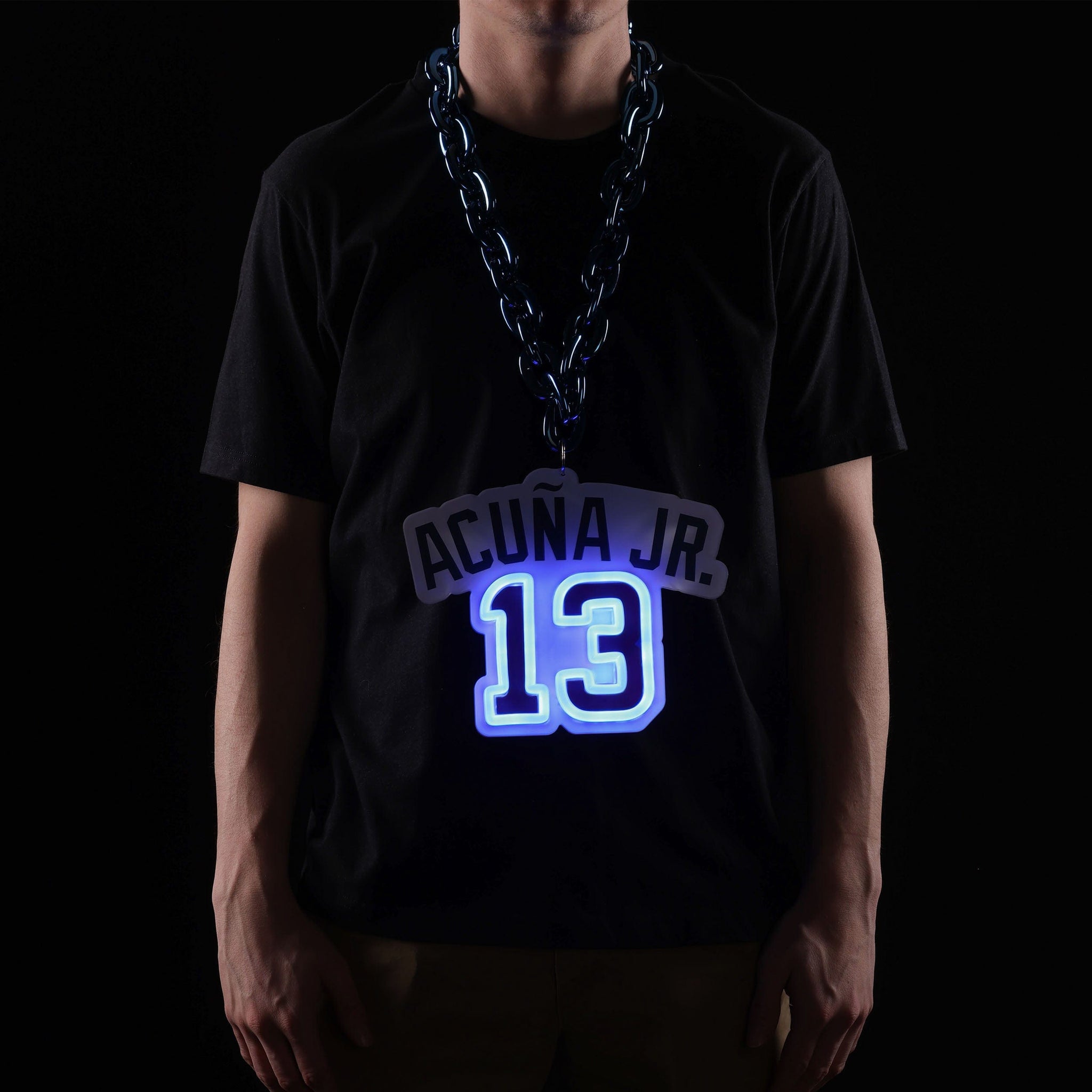 Your favorite star shines bright on the field. Now, you can shine just as bright in the stands! Add some glow to your gameday fit with this Ronald Acuna Jr Atlanta Braves Neon Light Up Big Logo Player Chain.