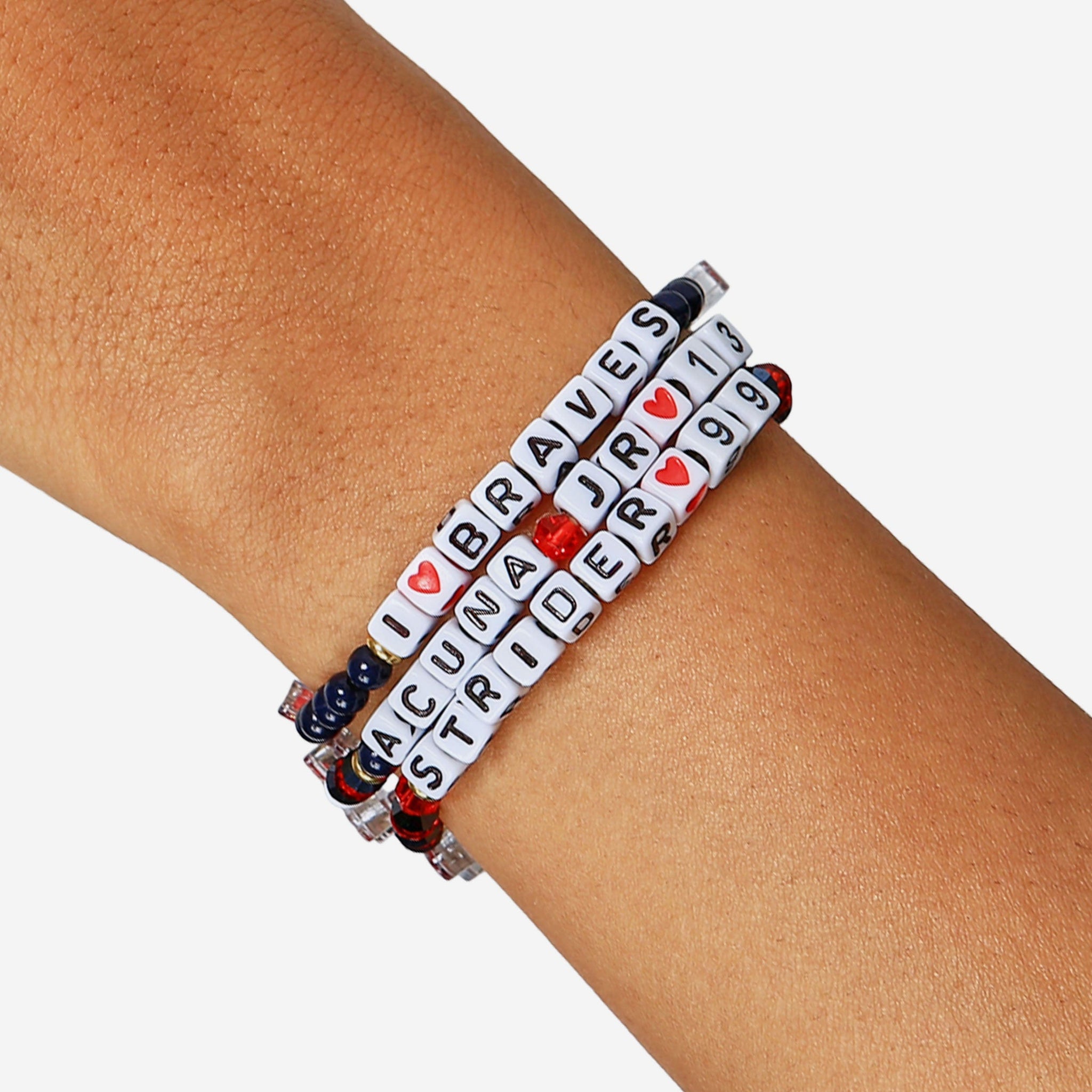 - Thematic words displayed: Letter cubes are organized on a friendship bracelet string to display team-specific words, messages, and player names that will make sure these Ronald Acuña Jr. & Spencer Strider player friendship bracelets always have your team spirit front and center.