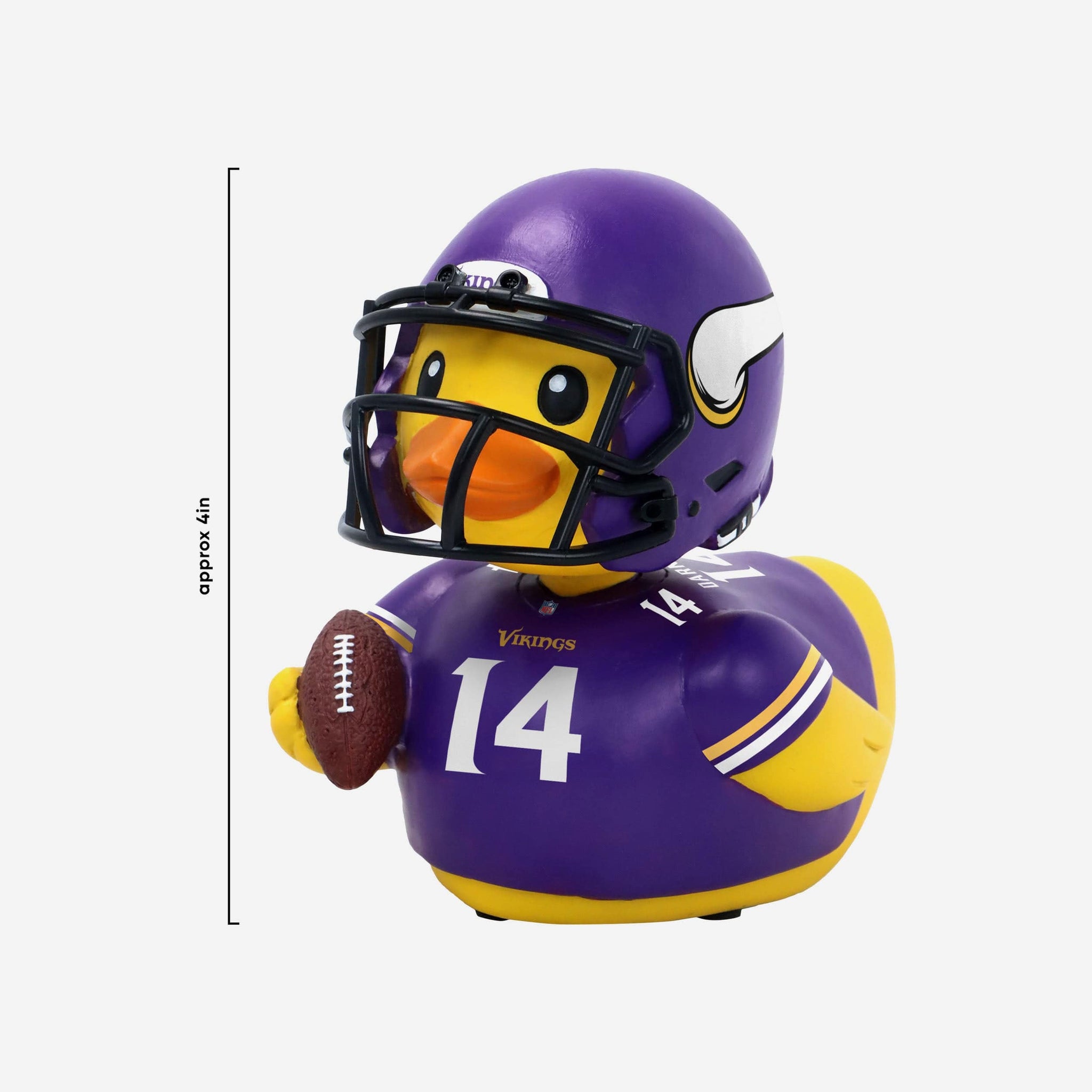- Portrays duck wearing Sam Darnold’s purple gameday uniform and team helmet, ready to make a splash in your collection