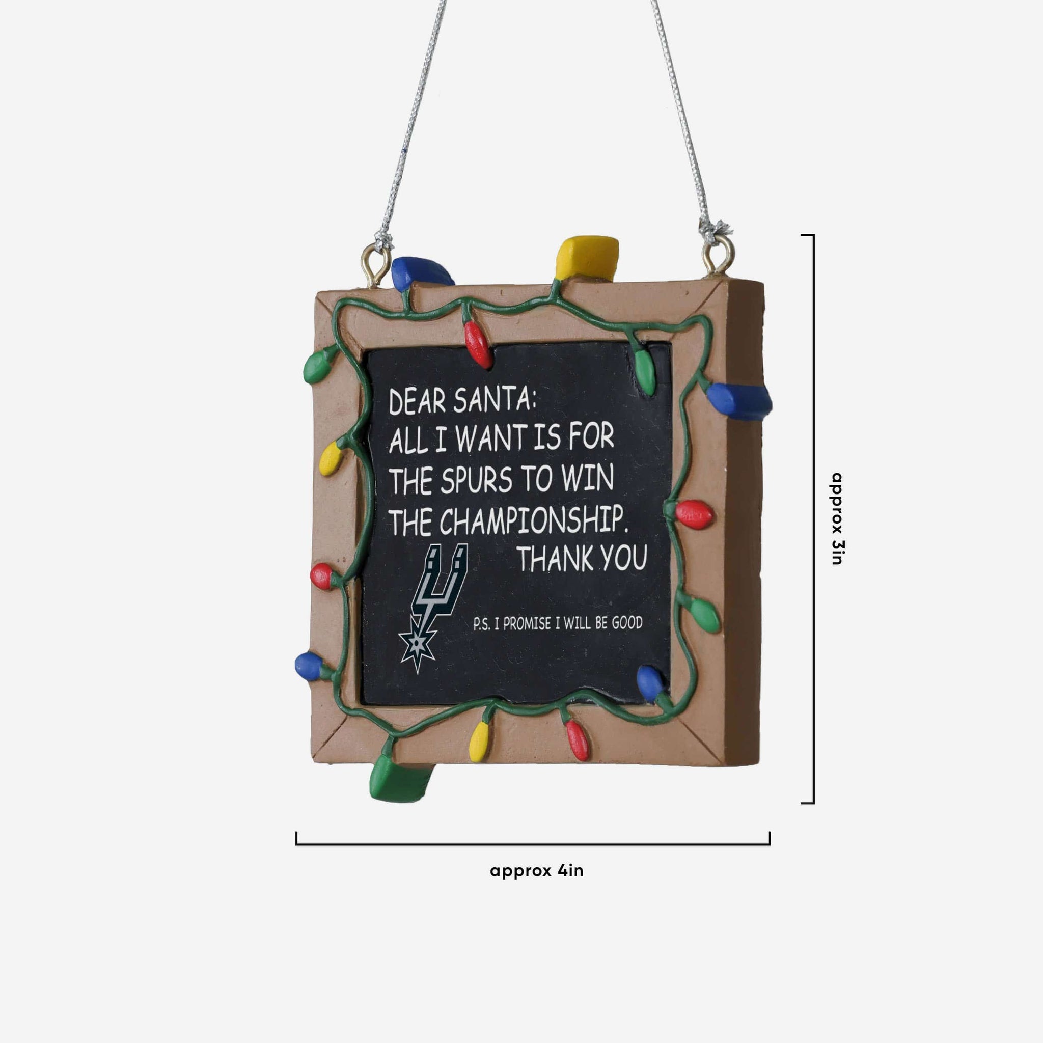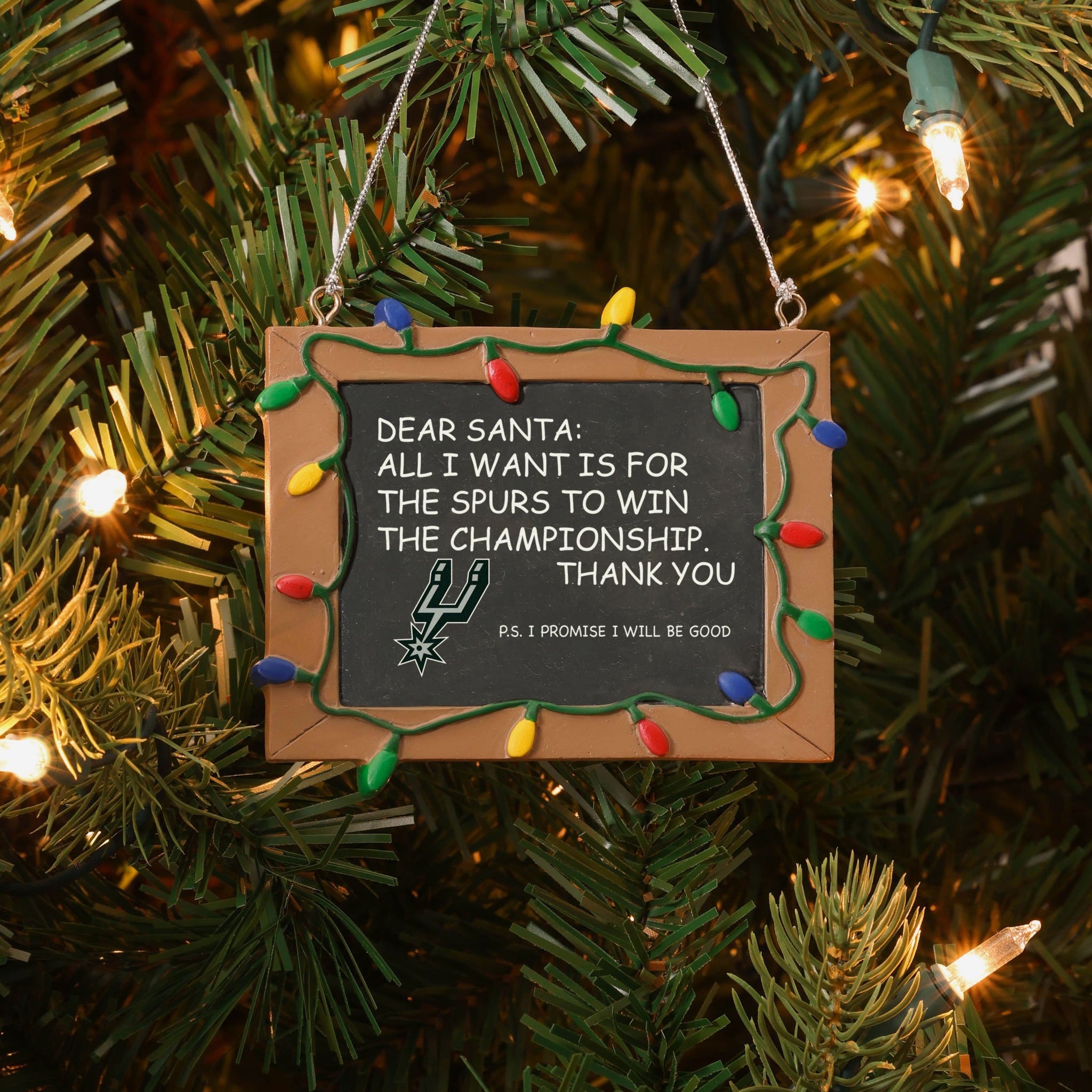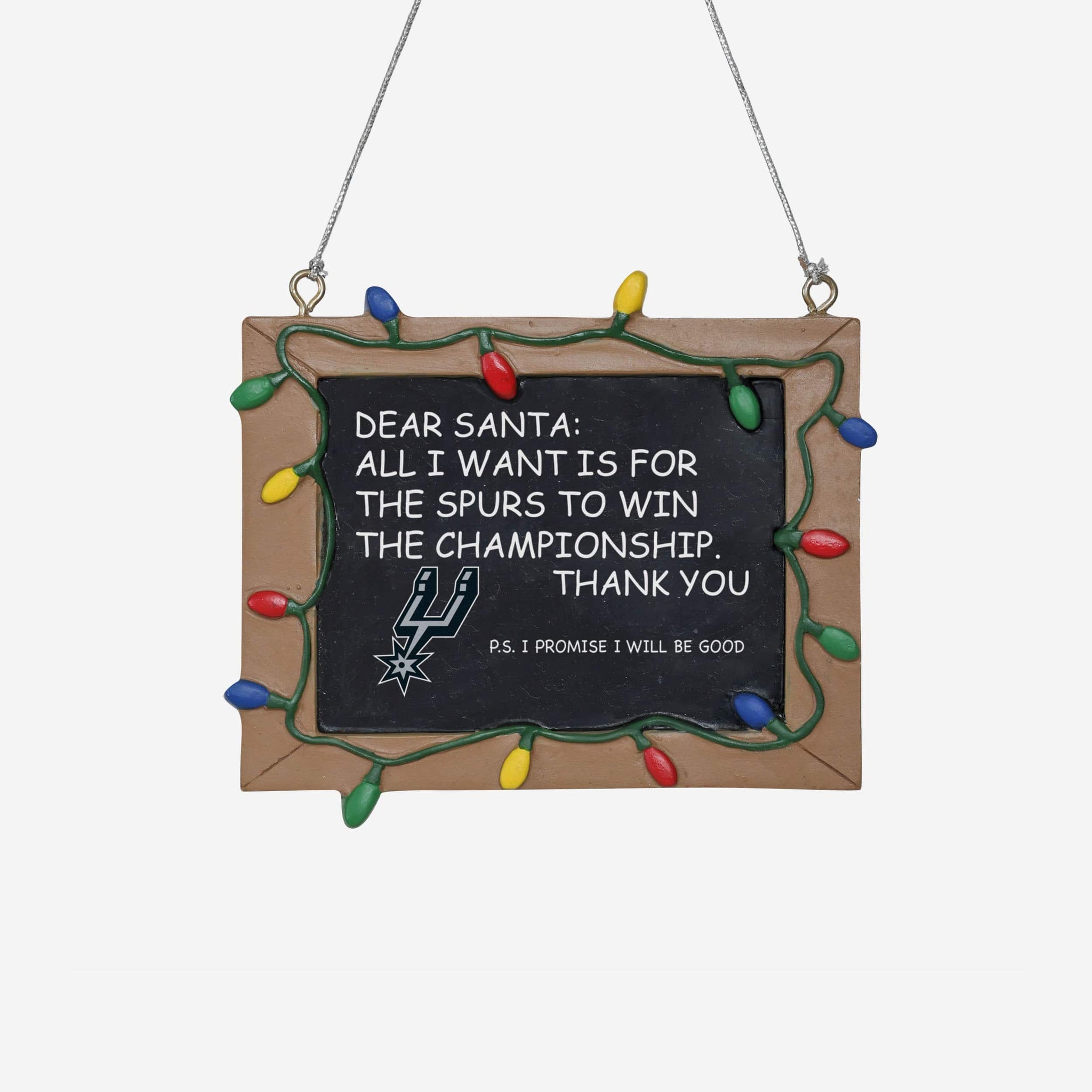 So, you made your list and sent it to jolly ol' Fanta Claus, asking him for a championship. But sometimes letters can get lost in the mail. Just in case, put this San Antonio Spurs Resin Chalkboard Sign Ornament on your tree to let him know how good you've been this year, and that all you want for the holidays is a trophy.