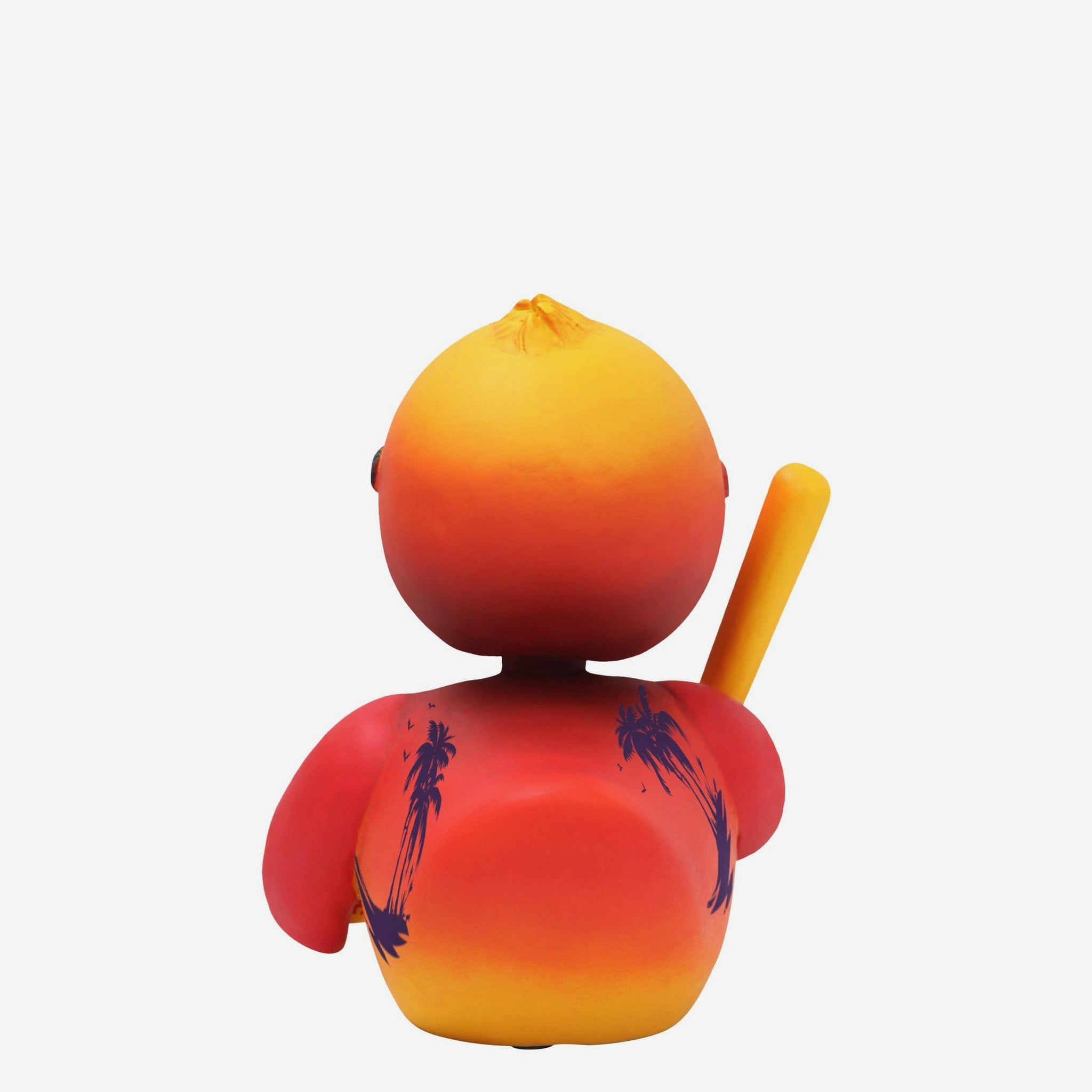 - Portrays a sunset-colored duck figure wearing a sunglasses, ready to make a splash in your collection