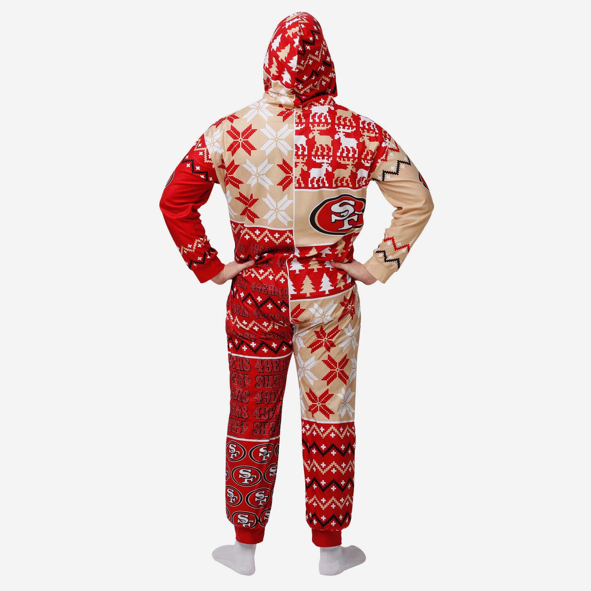 Get some matching family pajamas and dress to impress this holiday season! You won't want to miss these onesie team pajamas! These men's and women's PJ's are comfortable and show off your team spirit in the form of some sweet one piece jammies. Introducing the San Francisco 49ers Busy Block Family Holiday One Piece Pajamas! Don't forget to take your holiday photo with the whole family wearing matching Christmas pajamas!