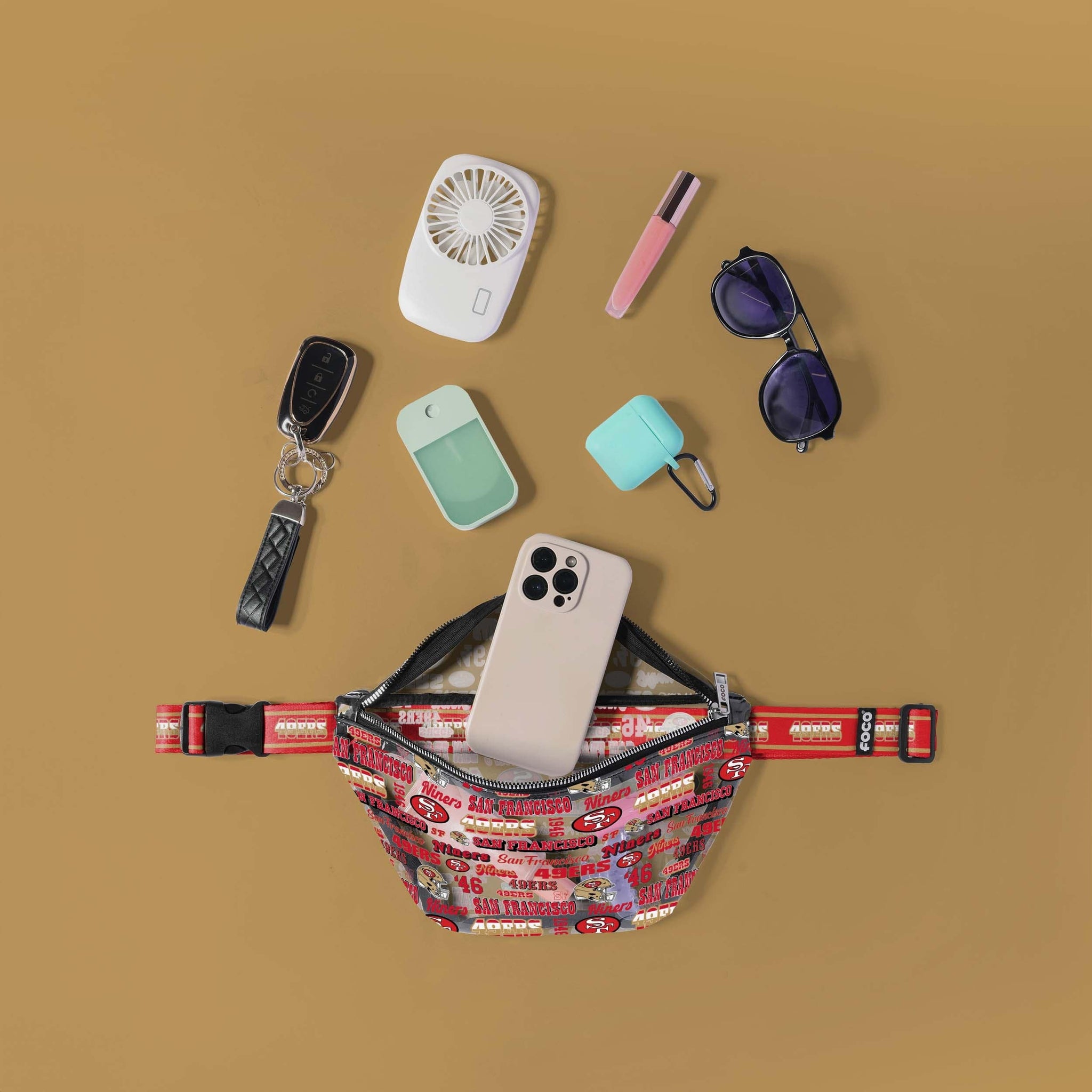- Repeat San Francisco 49ers current and retro team logo and wordmark displays on the fanny pack, in case there were any doubts where your allegiances lie