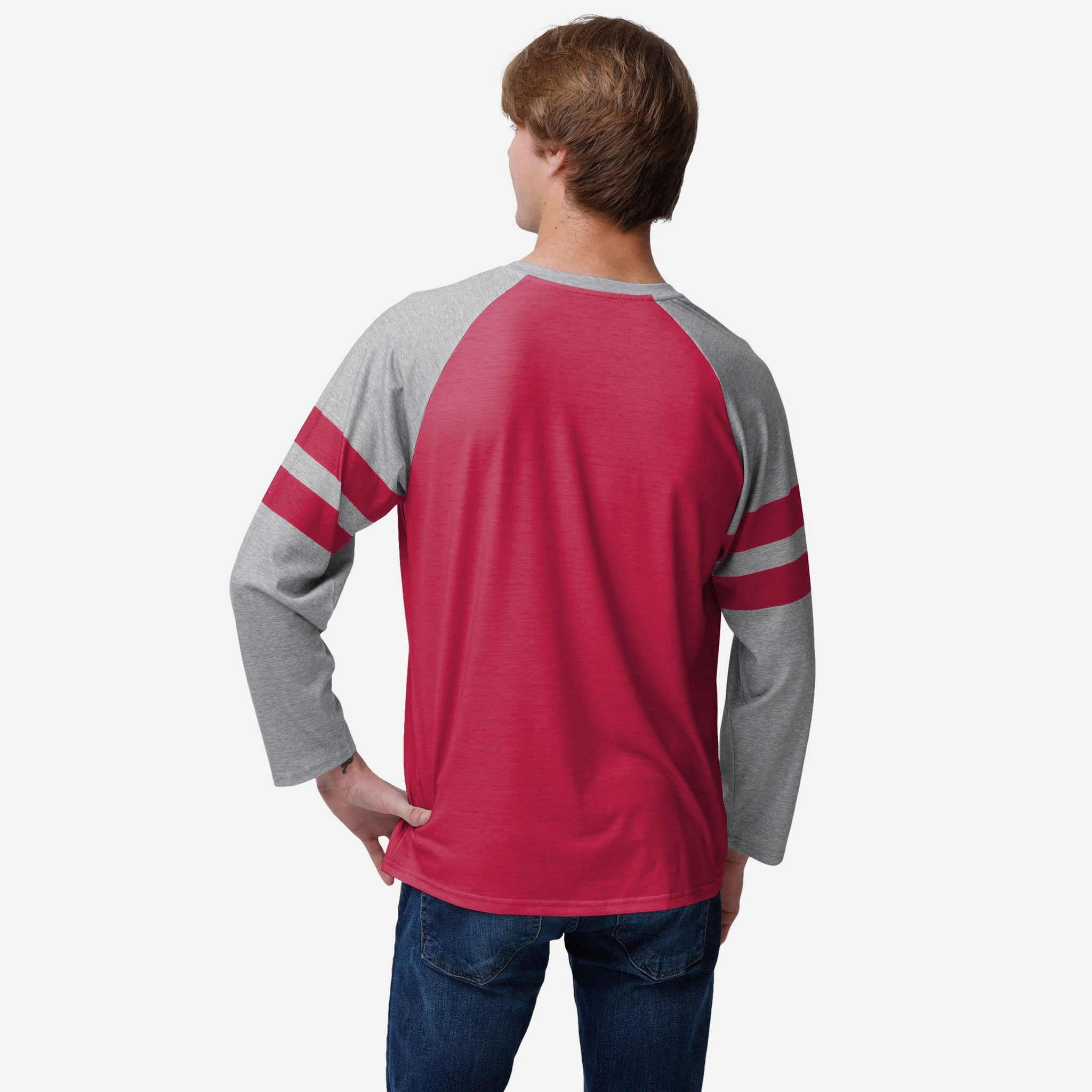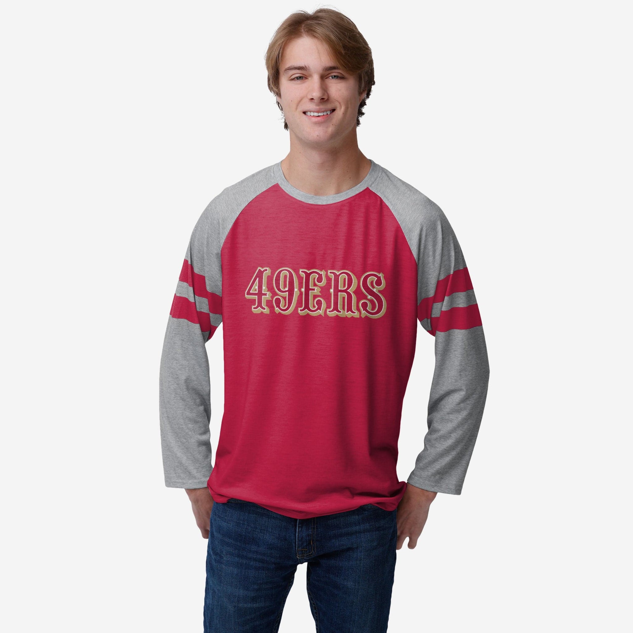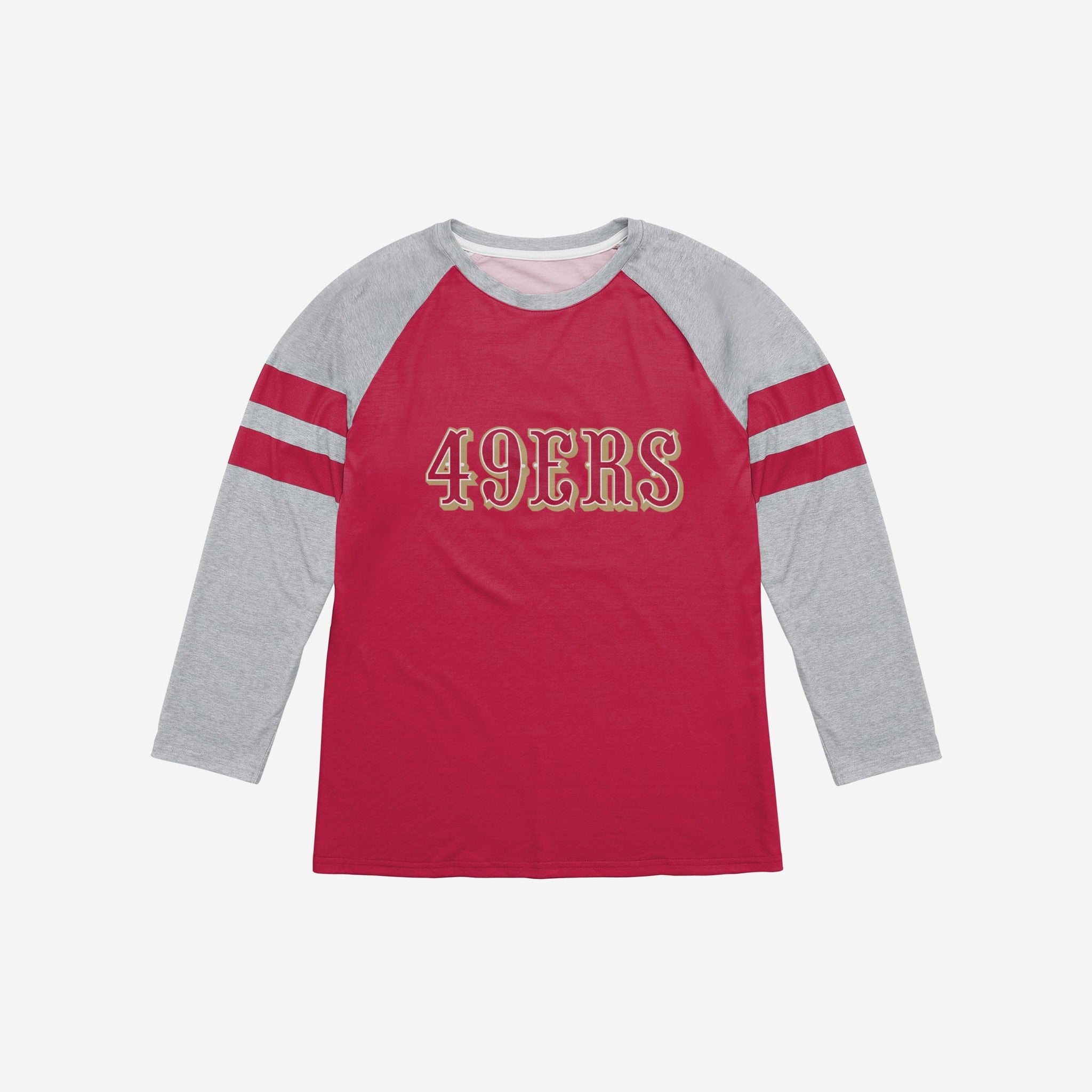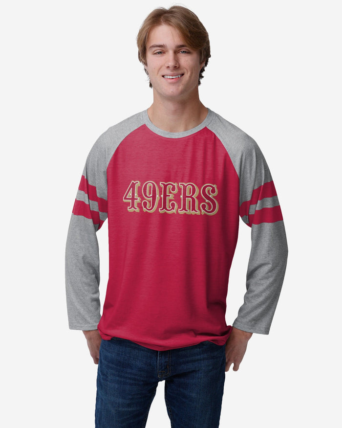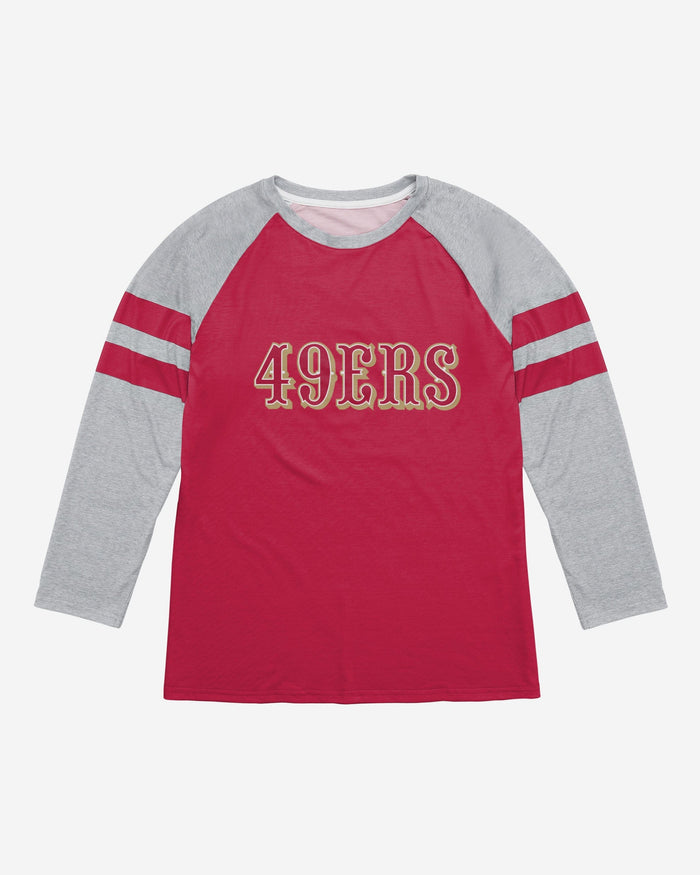 Gearing up for gameday? You're gonna want to rock this raglan. Make sure your sacred team colors are boldly on display with this San Francisco 49ers Team Stripe Wordmark Raglan T-Shirt.