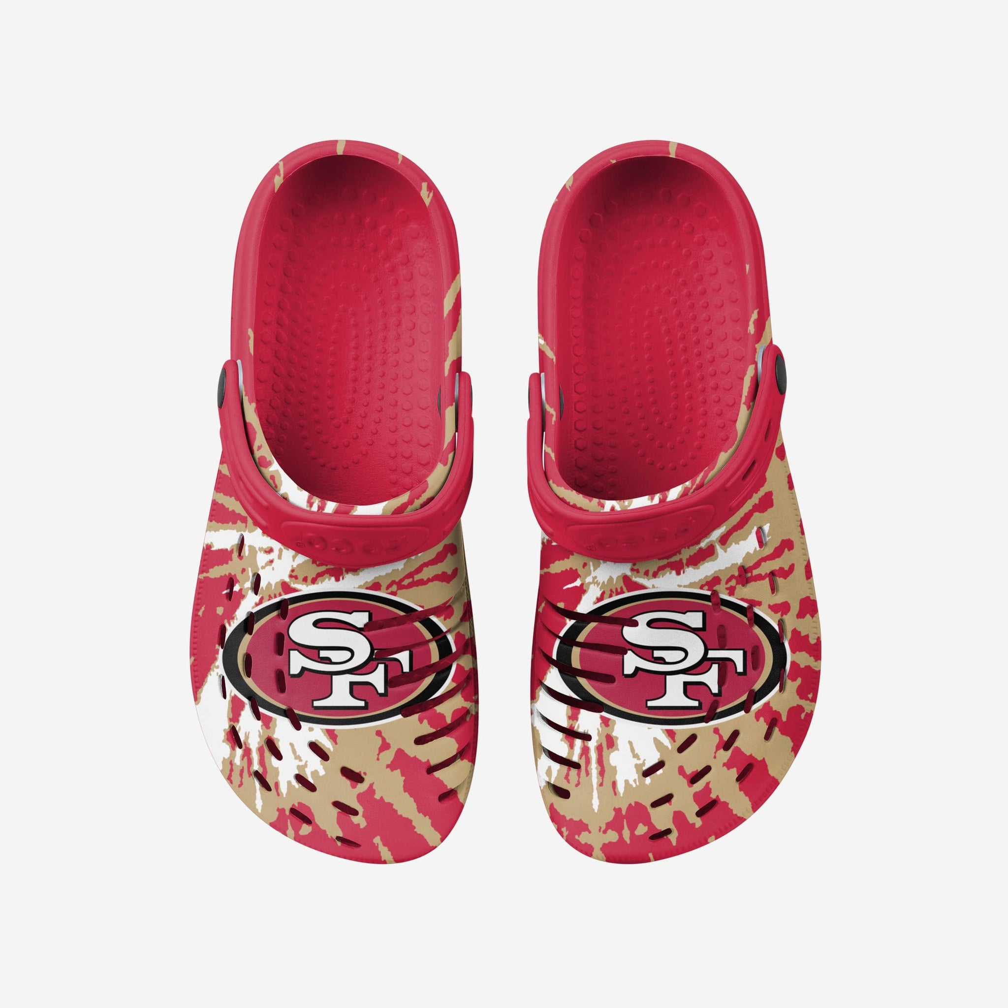 Enjoy a heaping helping of groovy goodness by standing out in these San Francisco 49ers Tie-Dye Clogs with Straps.