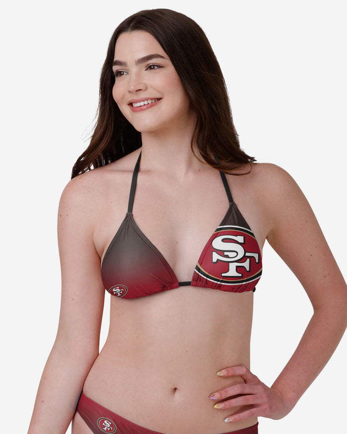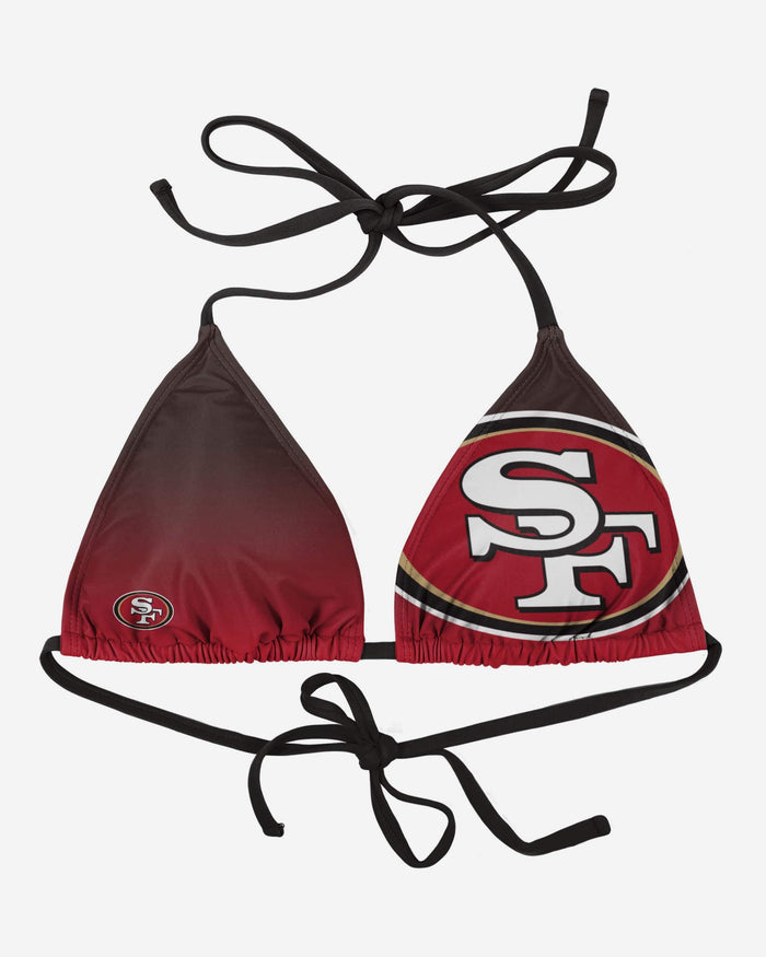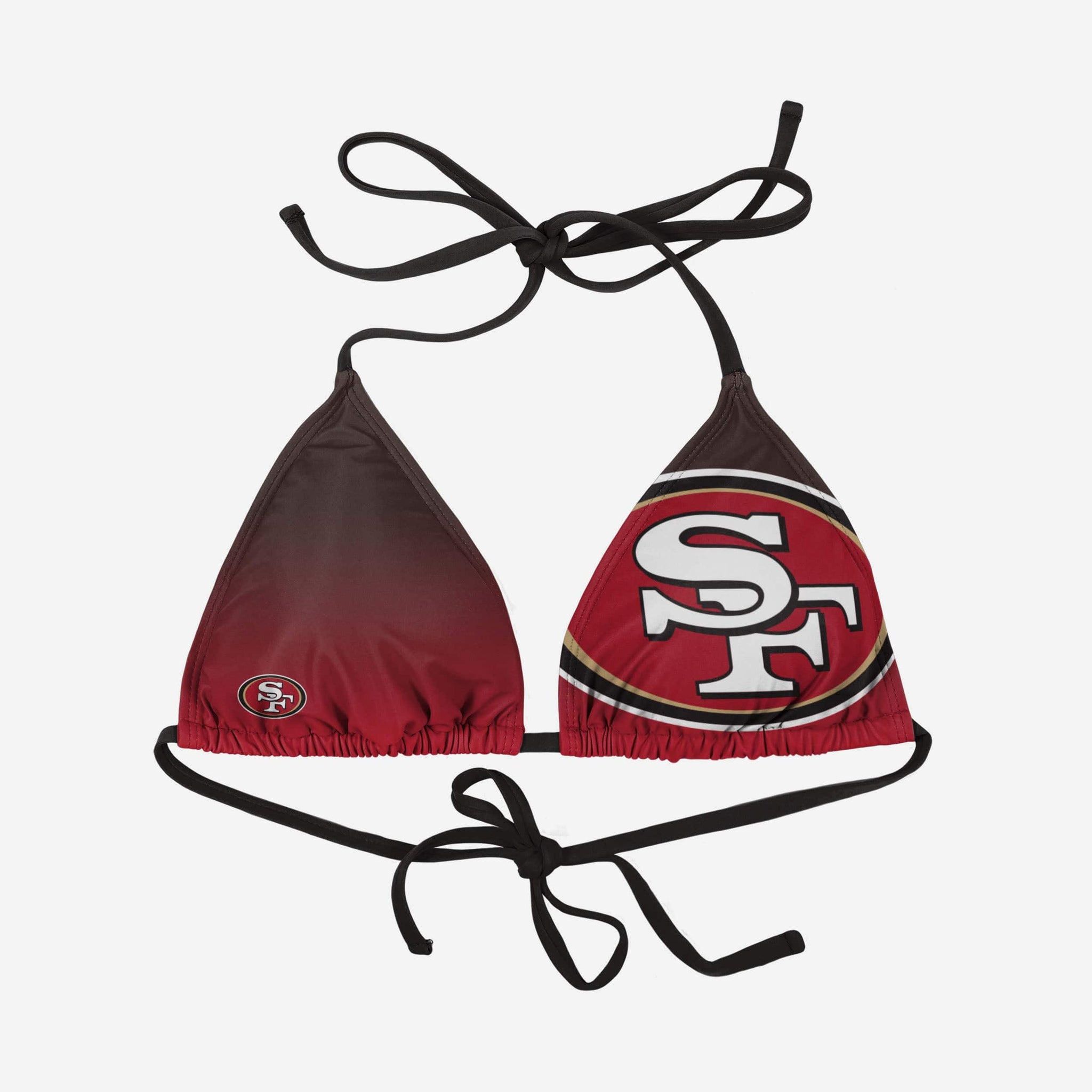 Sun, sand, and fan fun in the summer sun! Let no one second guess your team loyalty this summer with the San Francisco 49ers Women's Gradient Big Logo Bikini Top.