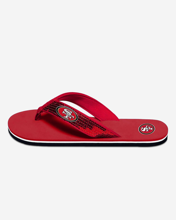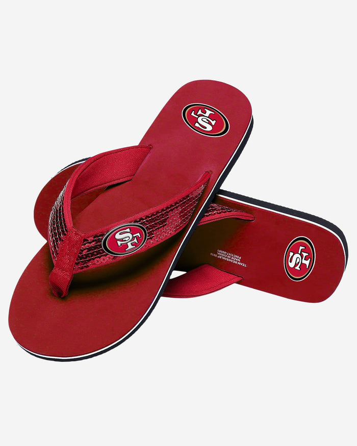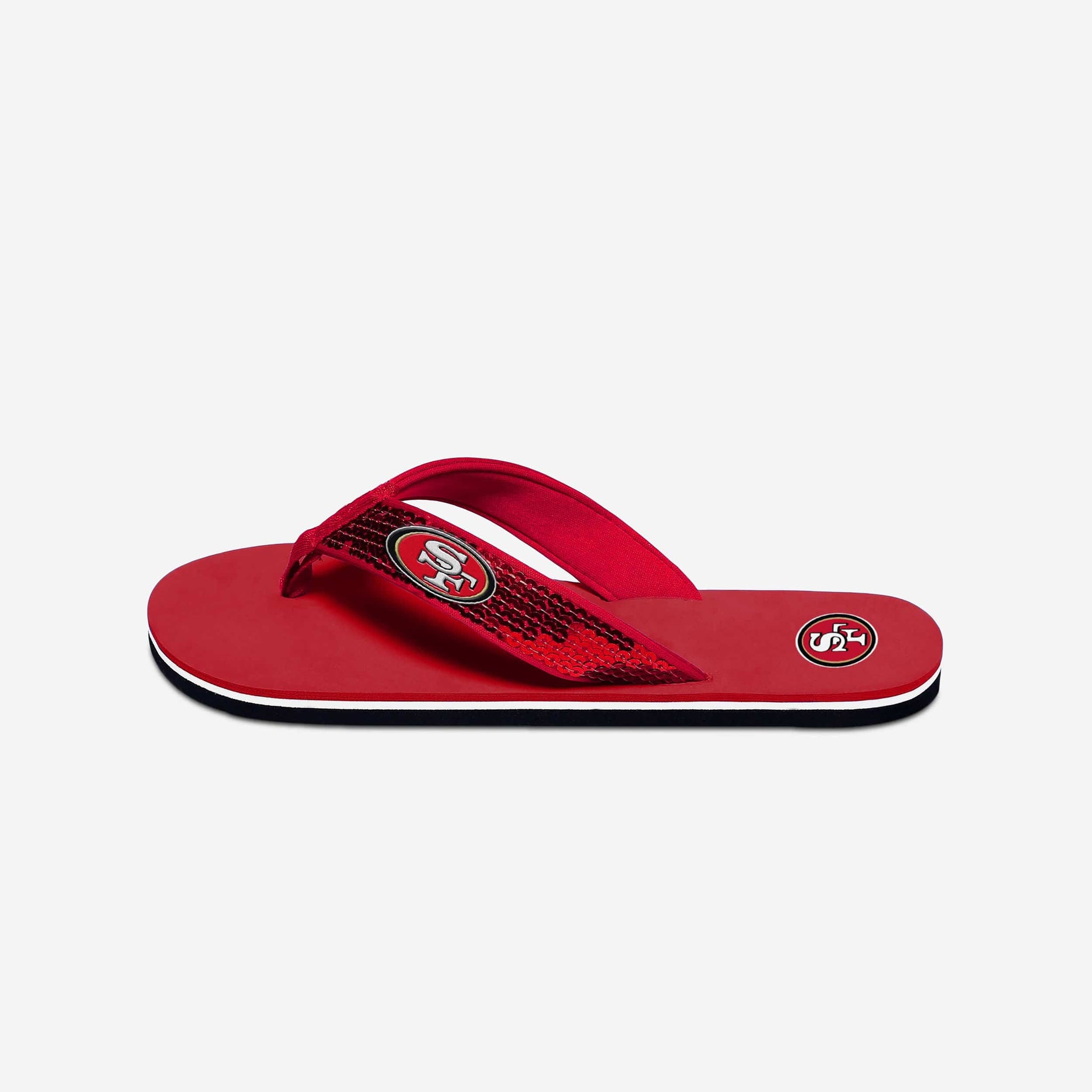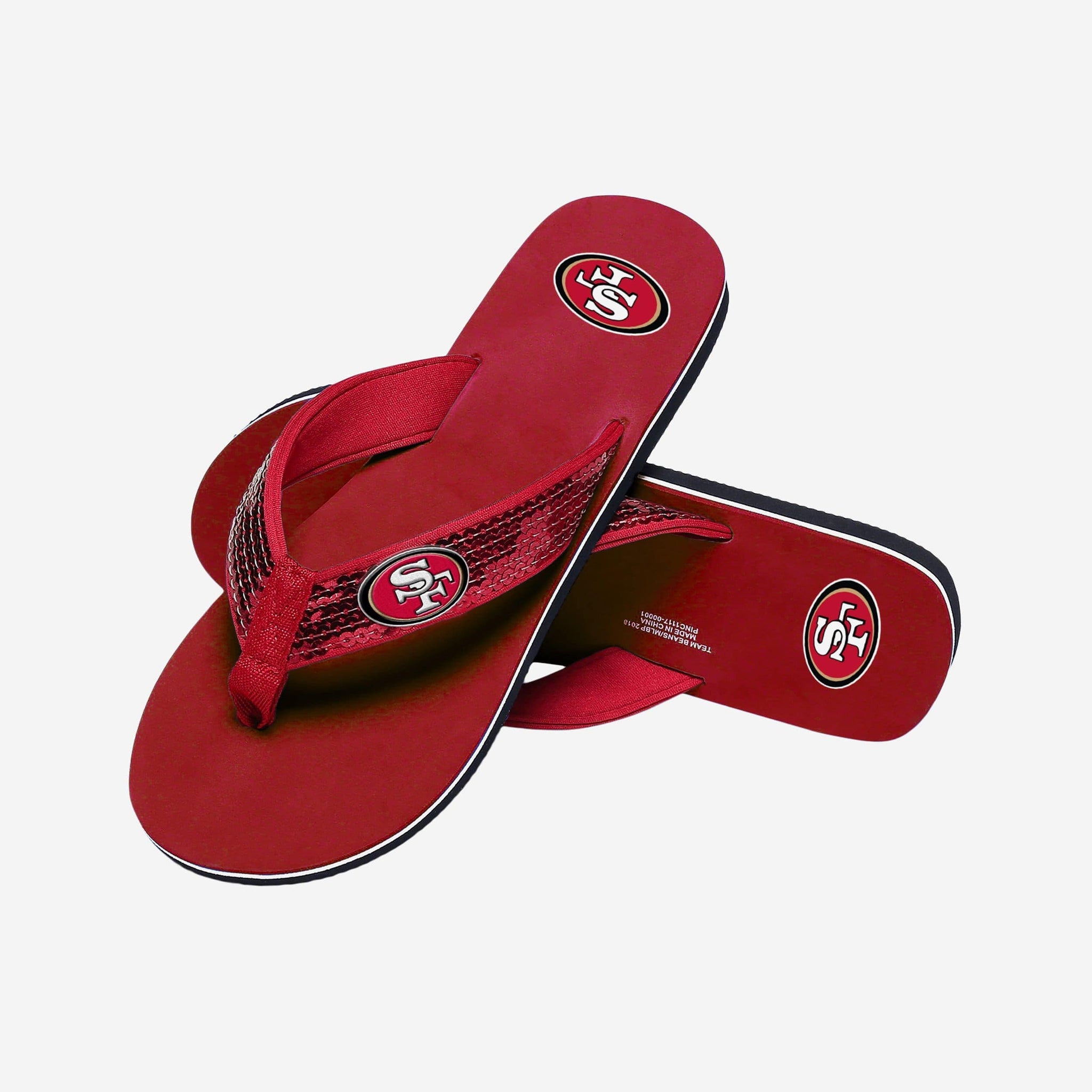 Nothing comes close to shining as bright as your team spirit. Well, nothing other than these San Francisco 49ers Womens Sequin Flip Flops. Rock your fandom in comfort and style. Just don't be surprised when people need sunglasses when they look at you.