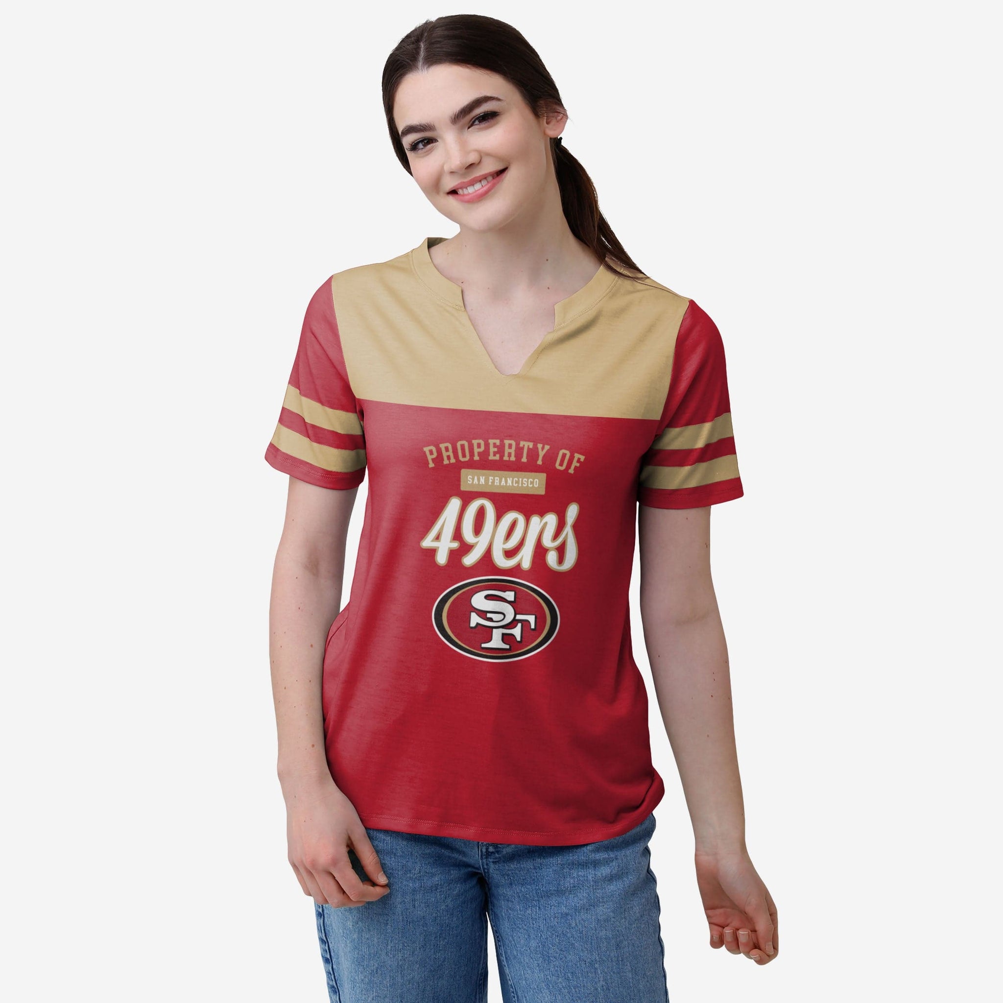 Ready. Set. Gameday! Dress to impress when you're chilling at the tailgate or cheering in the stadium with this San Francisco 49ers Women's Team Stripe Property Of V-Neck Shirt.