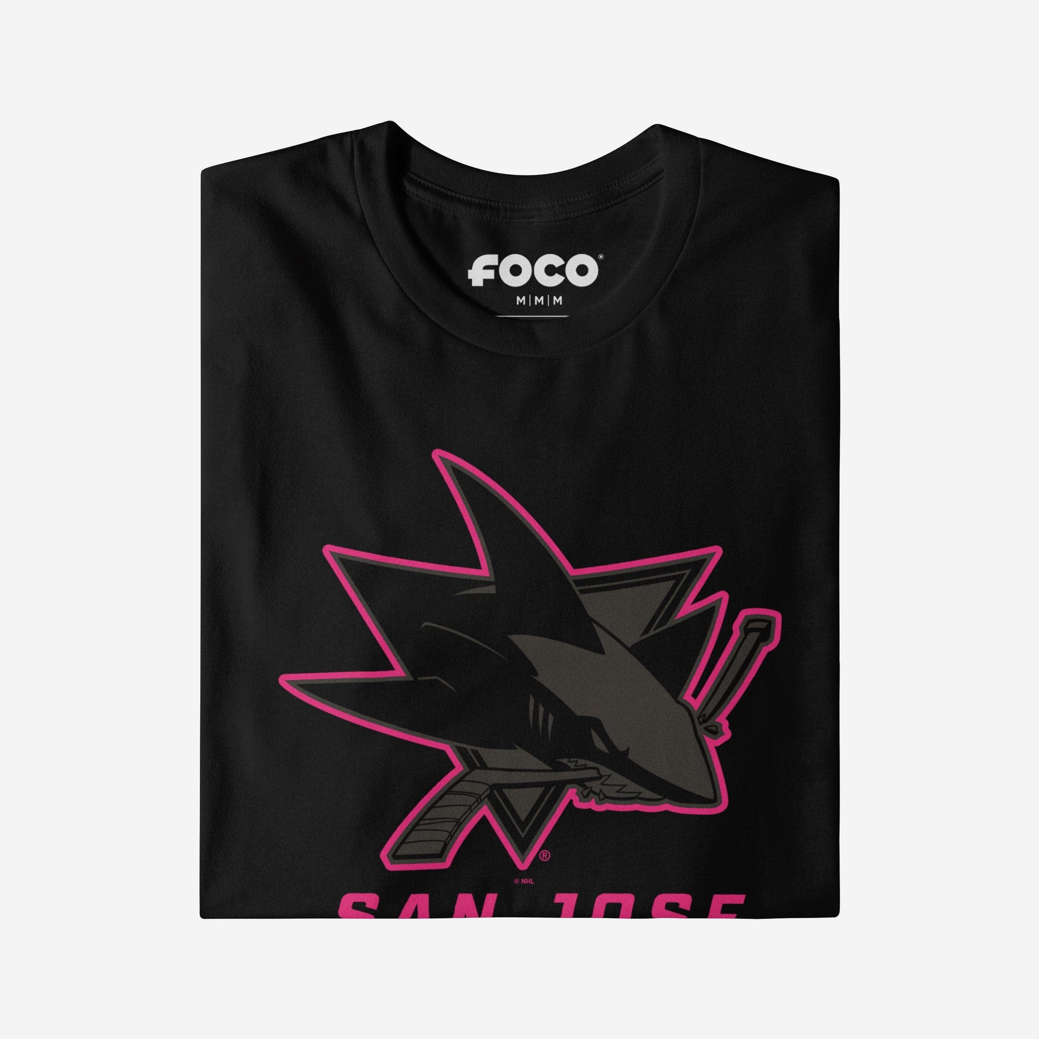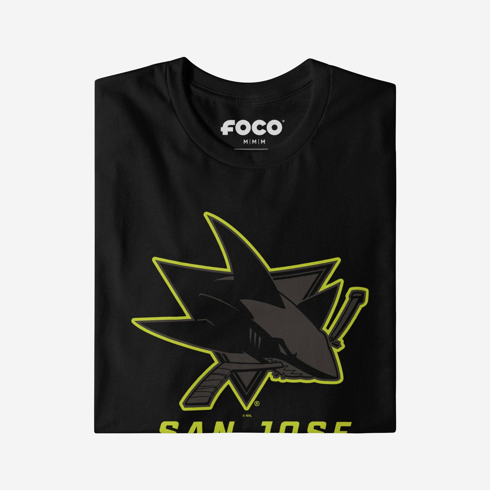 - Team logo display with highlight outline: The front of this apparel features a black San Jose Sharks team logo display outlined in neon, and a neon wordmark team name display