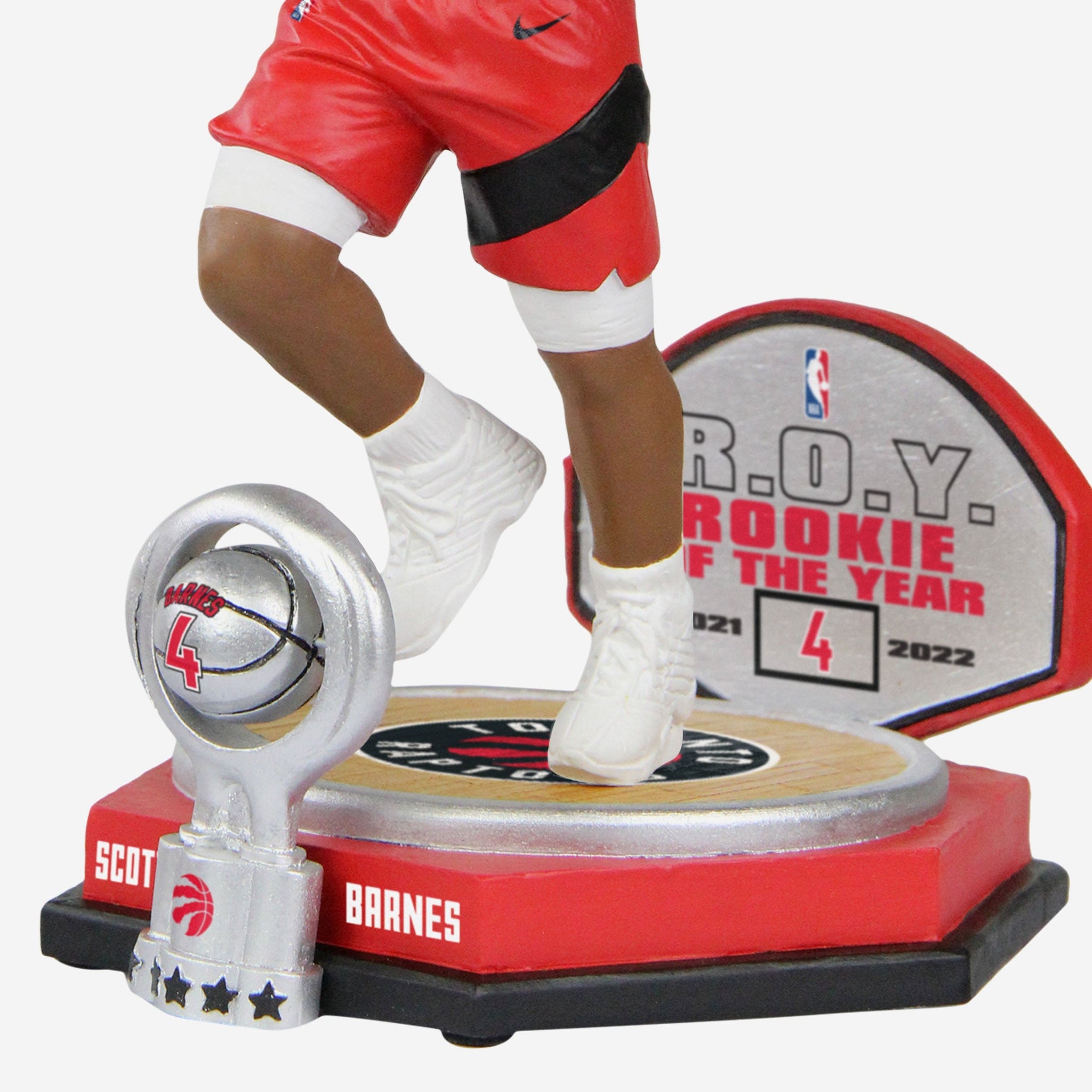 - Silver-colored trophy accent on front of base with jersey display, team logo display, and R.O.Y. text accent, because you've GOTTA show off the hardware