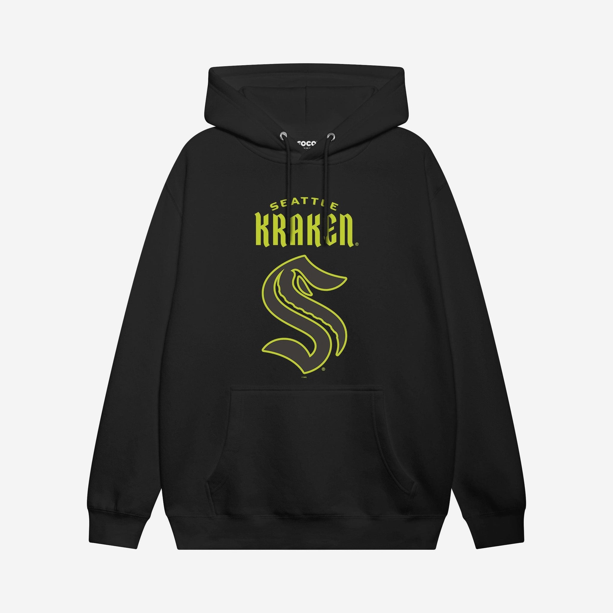 - Team logo display with highlight outline: The front of this apparel features a black Seattle Kraken team logo display outlined in neon, and a neon team name display