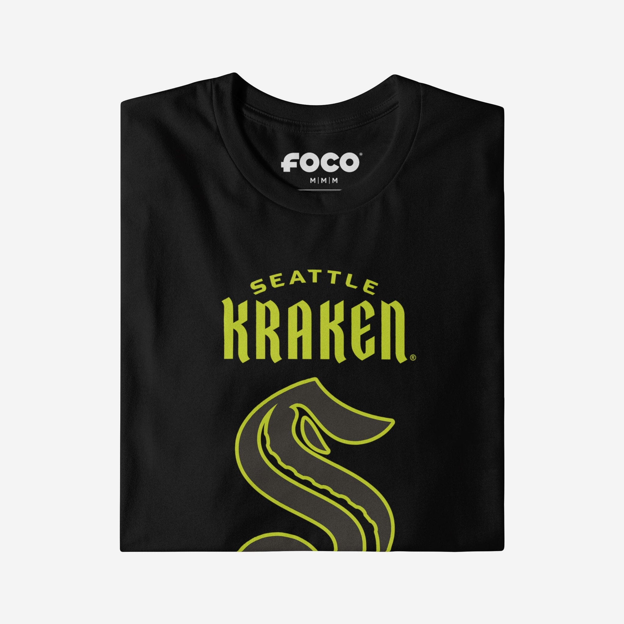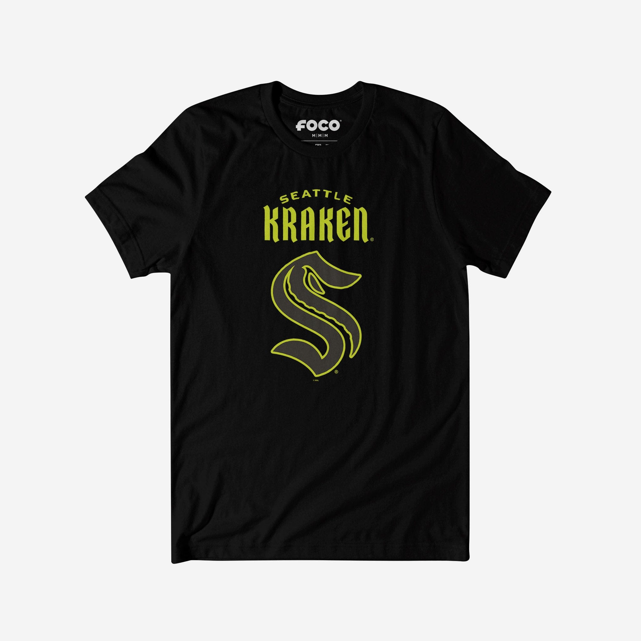 - Team logo display with highlight outline: The front of this apparel features a black Seattle Kraken team logo display outlined in neon, and a neon wordmark team name display