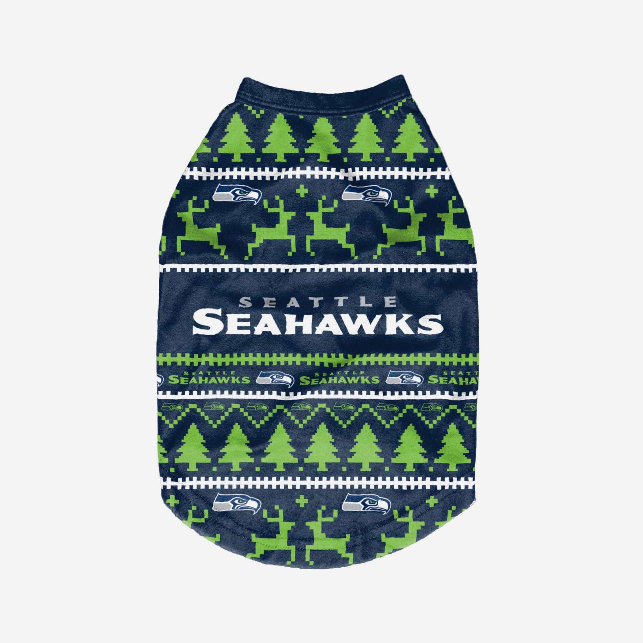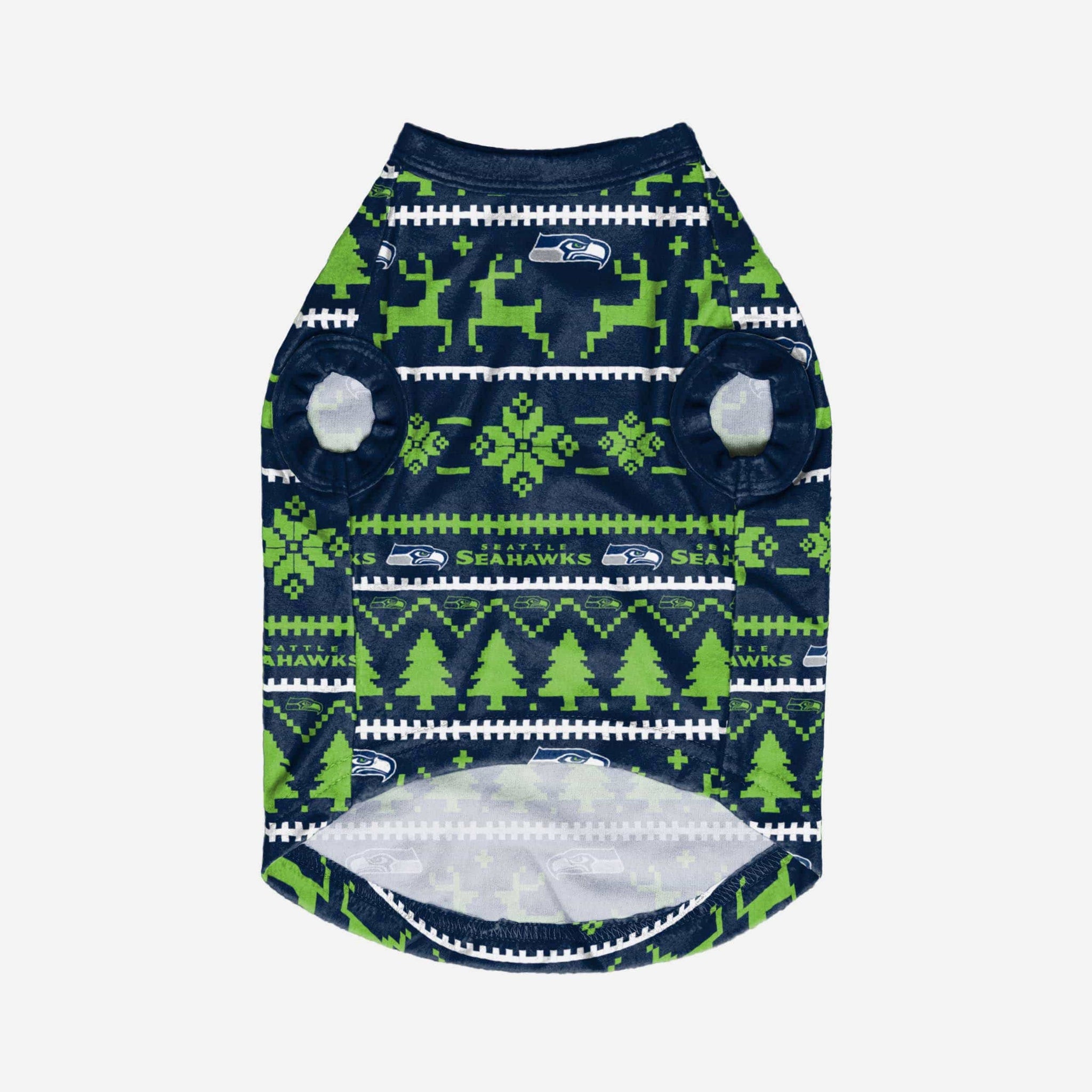 Show off your pet's holiday spirit with this dog sweater. Your good boy (or girl) will love this Seattle Seahawks Dog Family Holiday Sweater so much, they'll be saying "woof bark awooo" (that's "thank you" in dog). Don't forget to match your canine's sweater with a set of matching holiday pajamas.