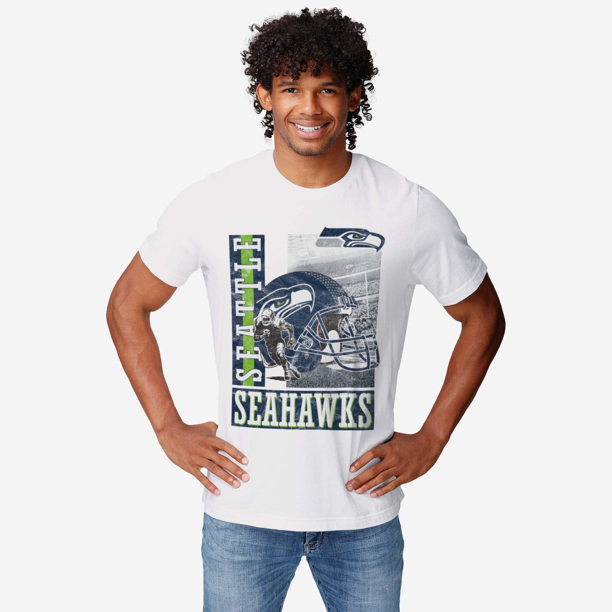 Make a dash for the endzone with a legendary addition to your fan fit! Score big on style and team pride with the Seattle Seahawks Helmet Dash T-Shirt.