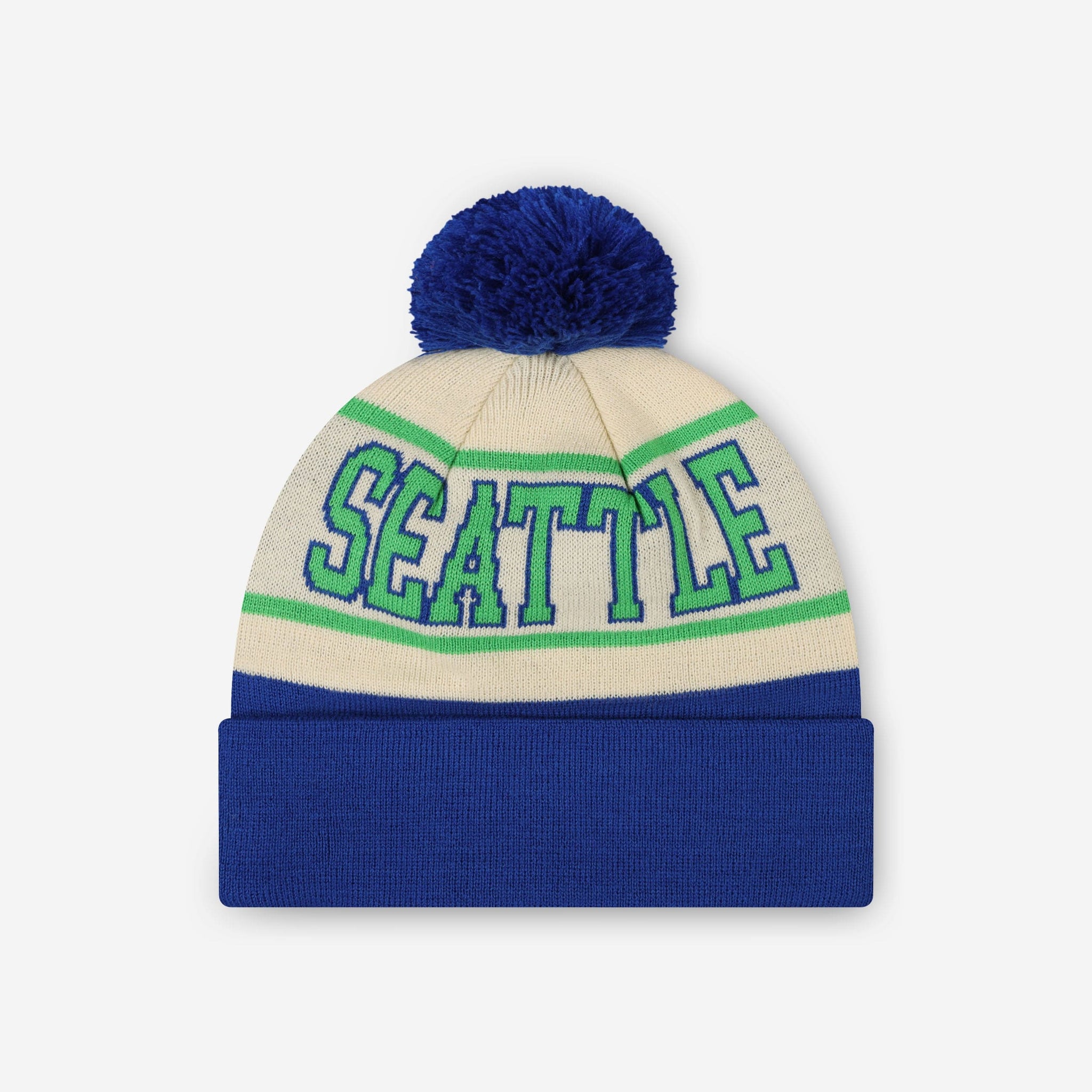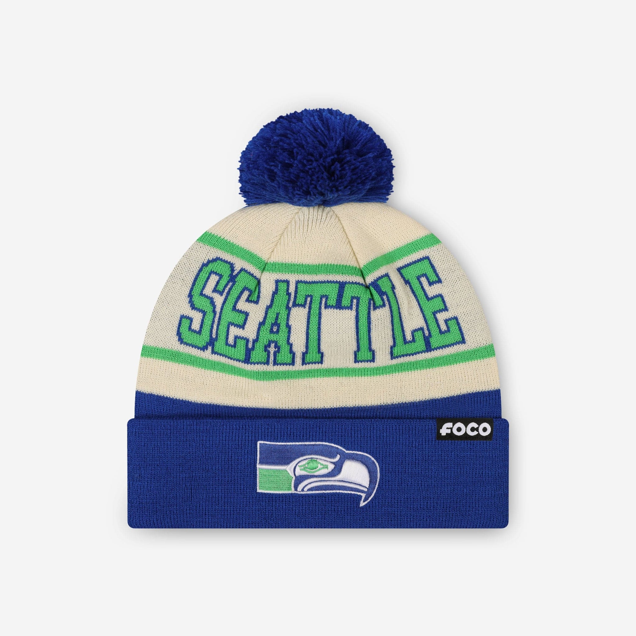 Don’t get left out in the cold. Make the smart play for gameday and beyond with the Seattle Seahawks Heritage Stripe Retro Logo Pom Beanie!