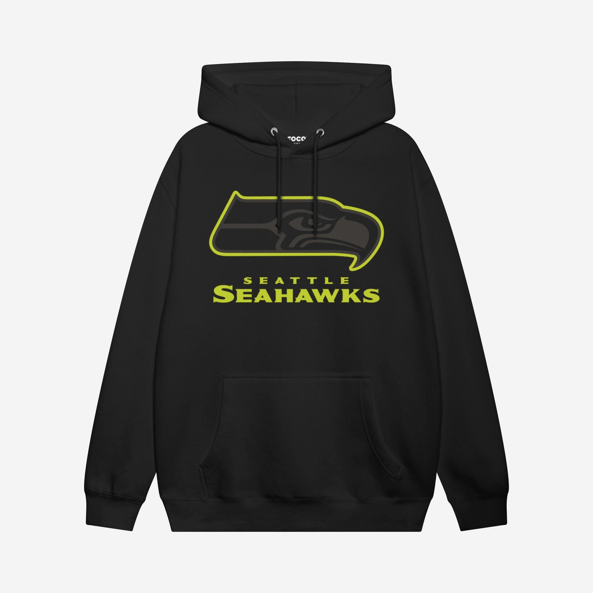 - Team logo display with highlight outline: The front of this apparel features a black Seattle Seahawks team logo display outlined in neon, and a neon team name display