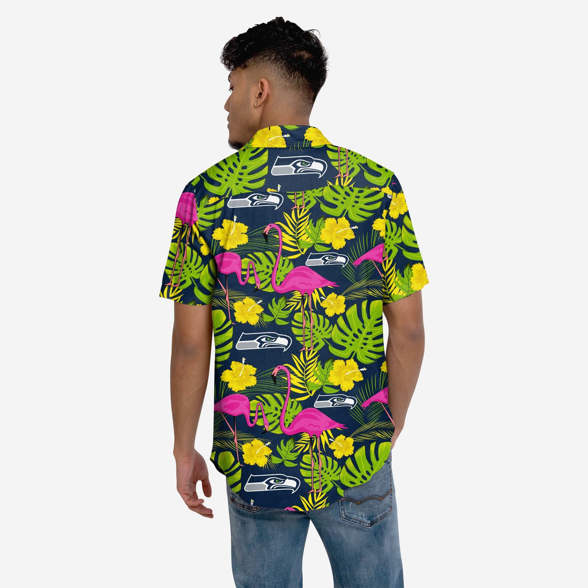 • All-over team-colored design with neon yellow flower and pink flamingo accents for maximum tropical team spirit